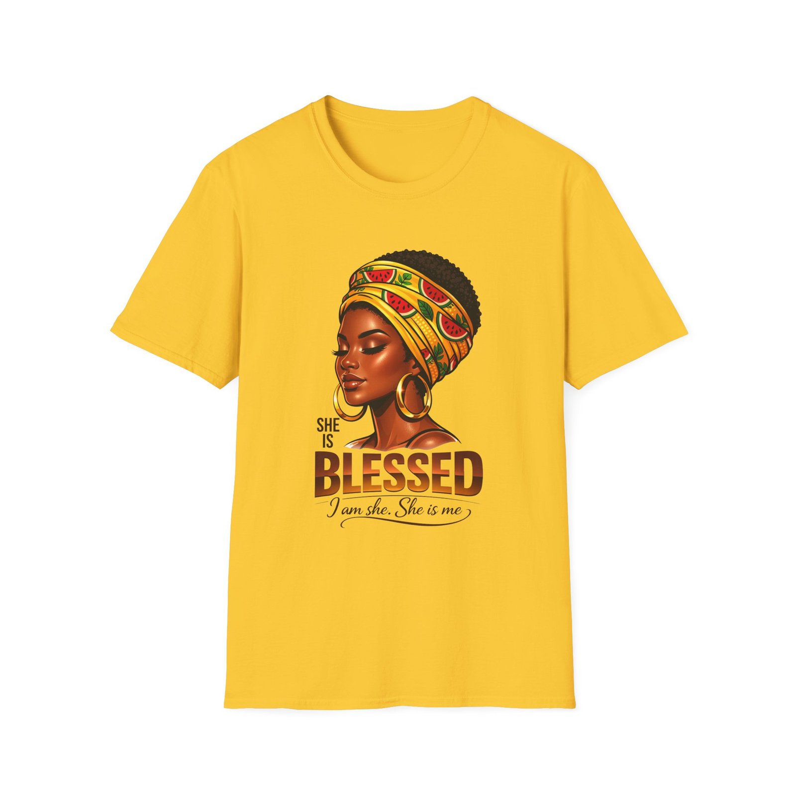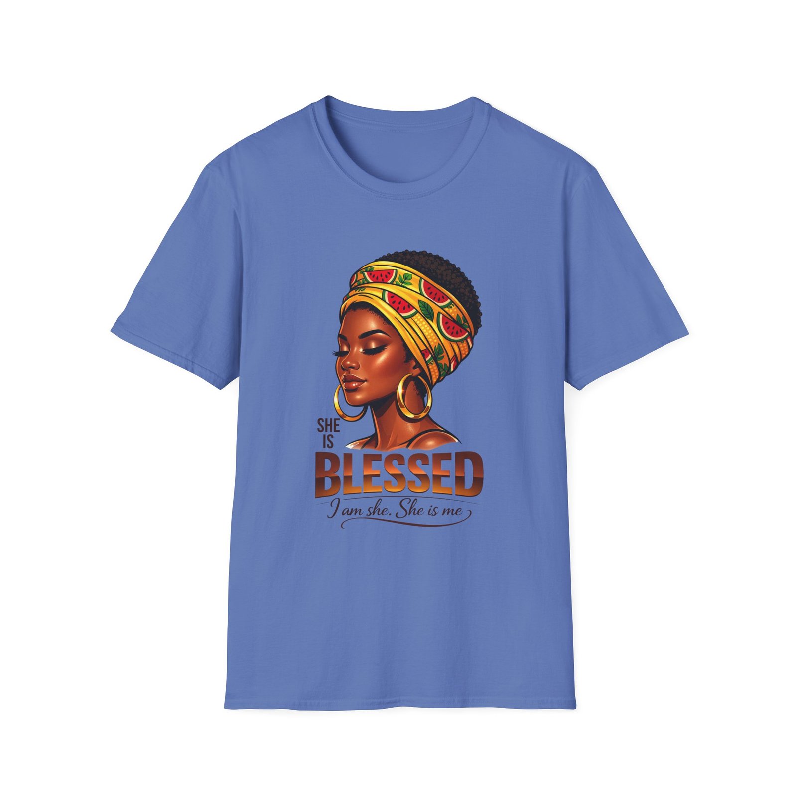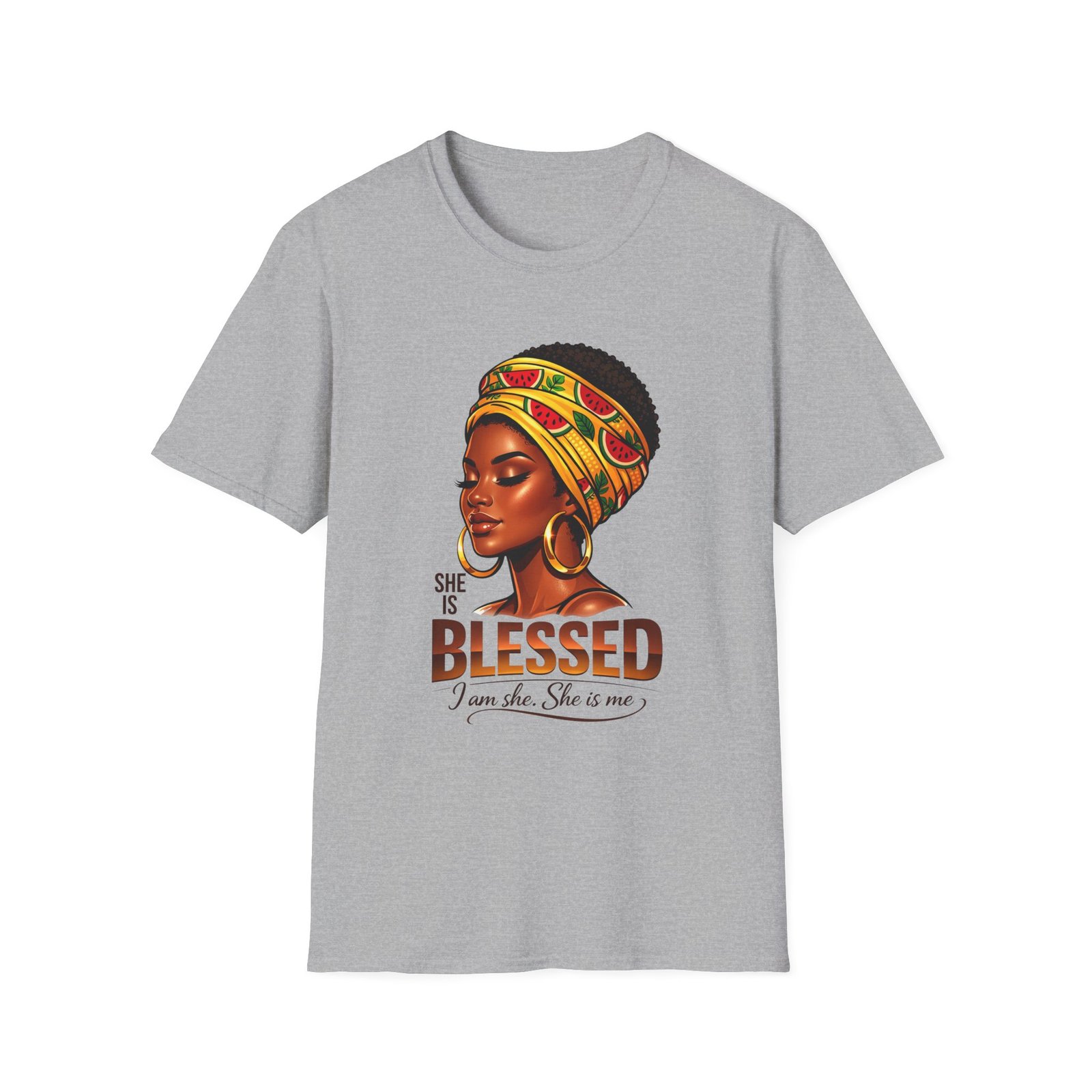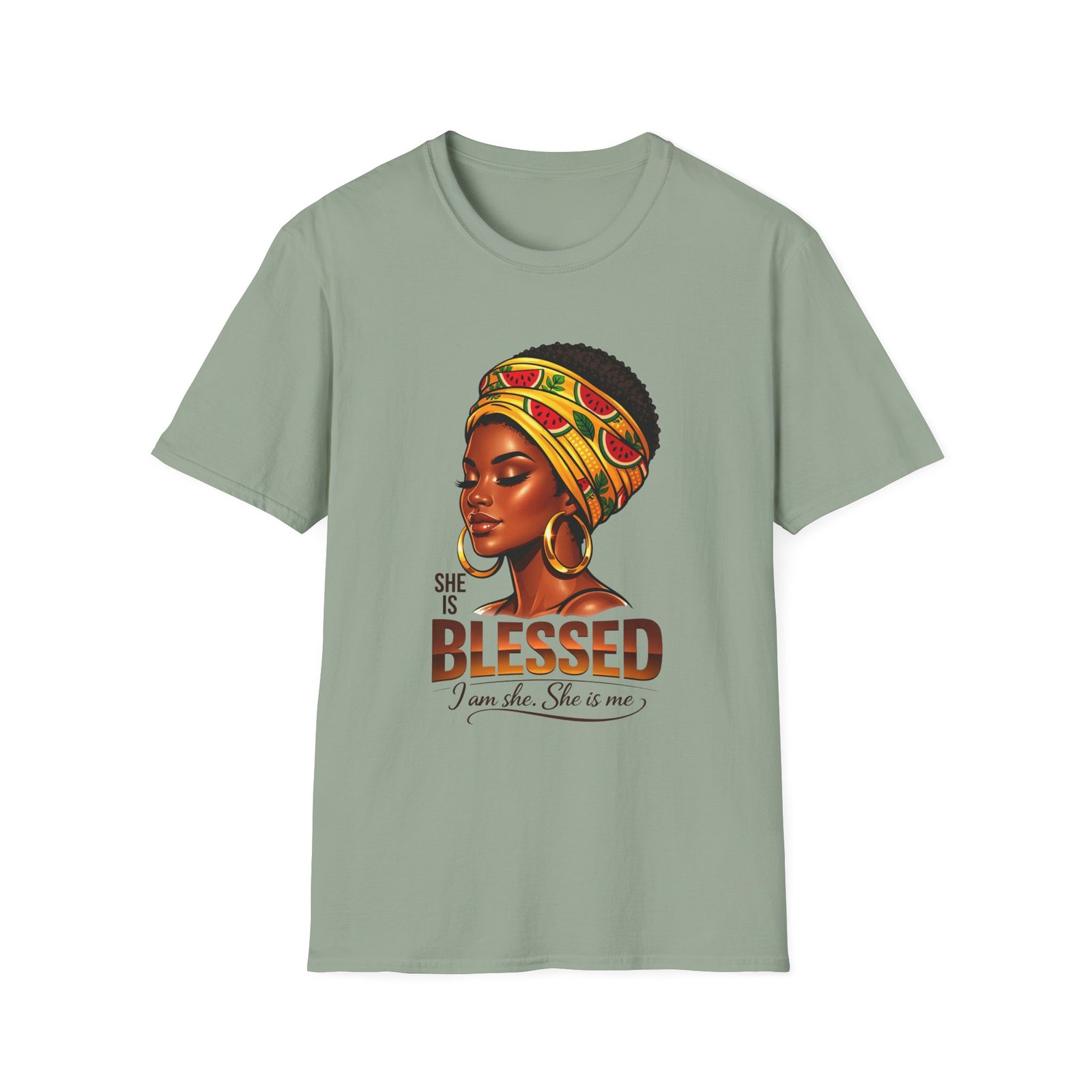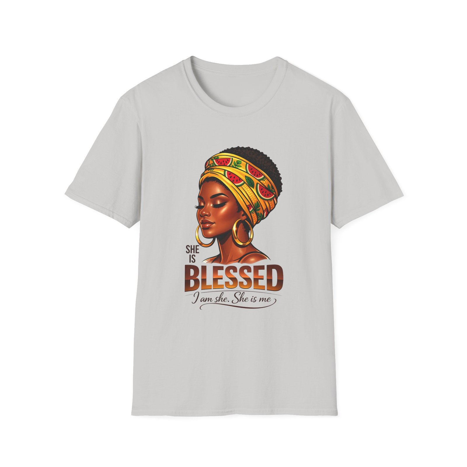 This soft, breathable tee carries quiet confidence. The front artwork—an elegant Black woman wearing a colorful headwrap—pairs warm earth tones with rich, soulful detail. Below her portrait, the uplifting message reads: “She is Blessed — I am she. She is me.” Wear it on slow mornings, community gatherings, or days when you want your outfit to speak gently but clearly. The lightweight cotton feels comfortable against the skin and the classic crew silhouette layers easily under jackets or overalls. It’s made to age with you: the ribbed collar keeps its shape, shoulder tape prevents stretching, and the clean tubular knit gives a smooth, seam-free look. This shirt slips into everyday life for those who celebrate heritage, resilience, and quiet joy.