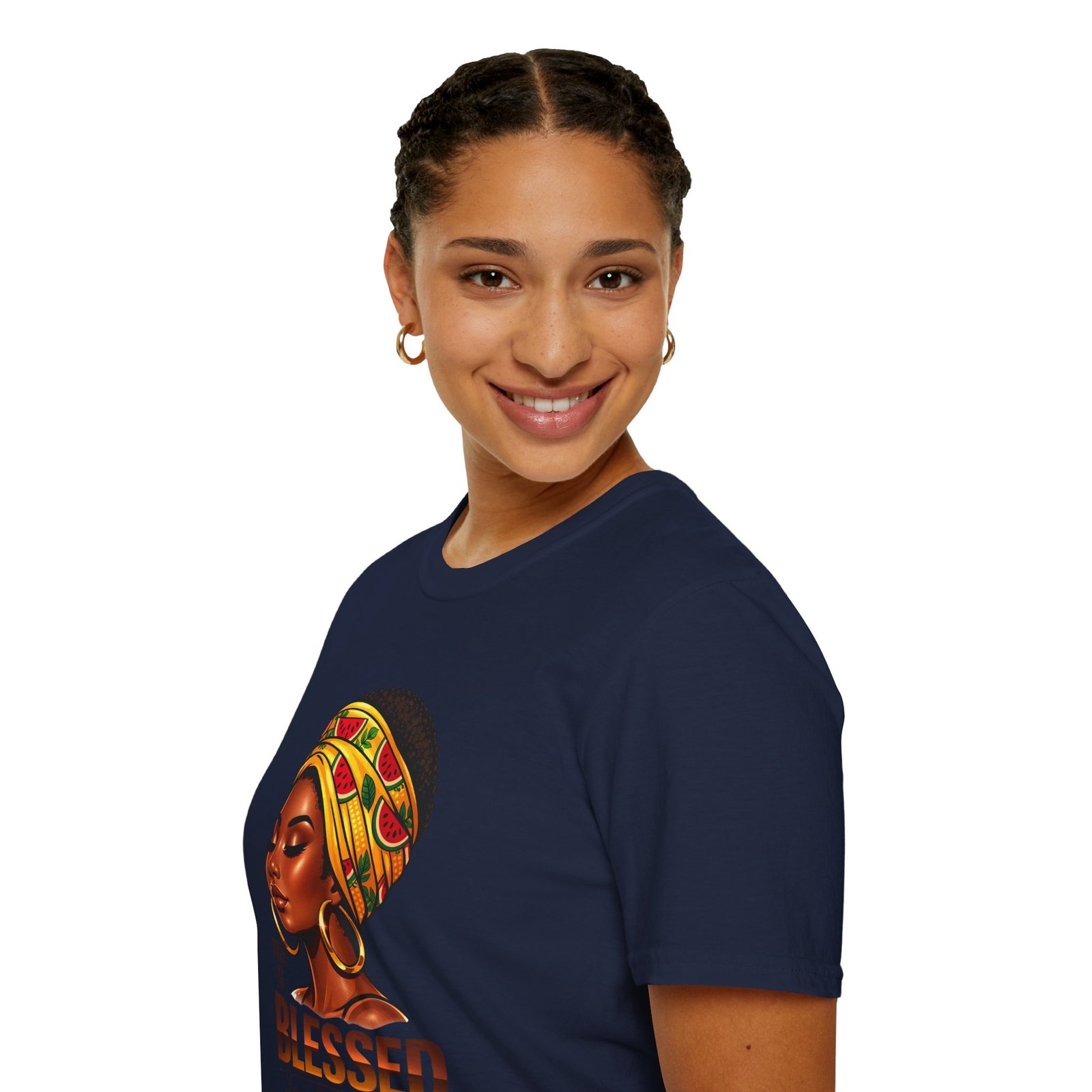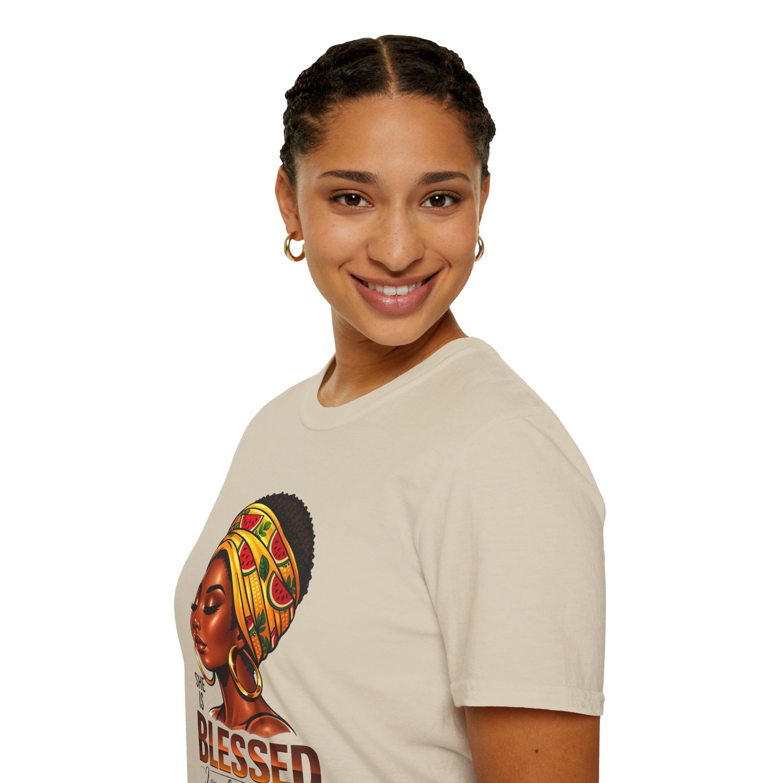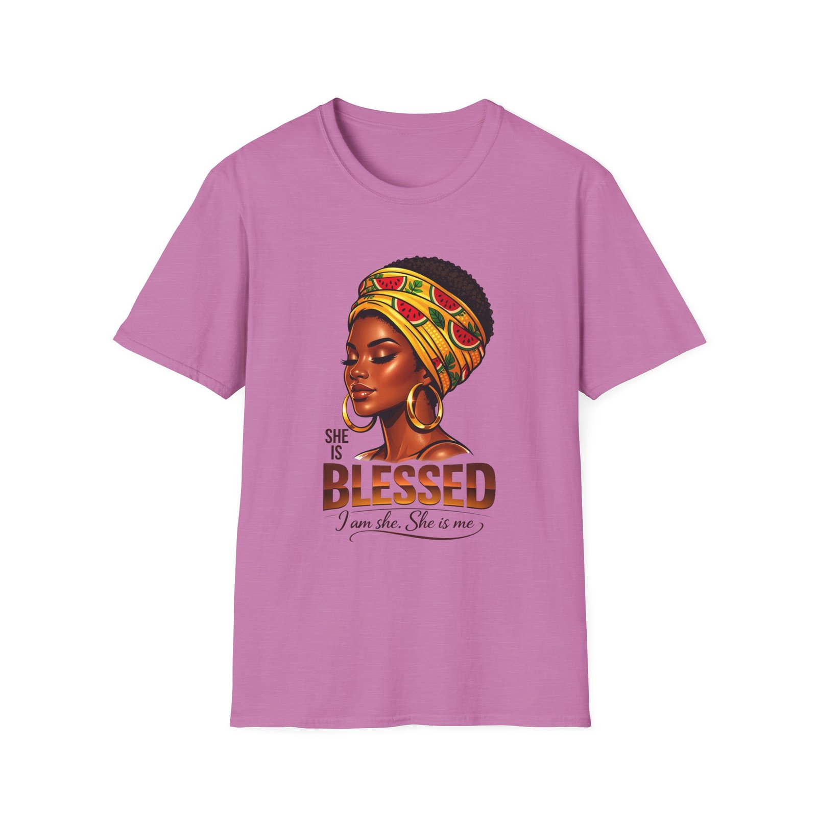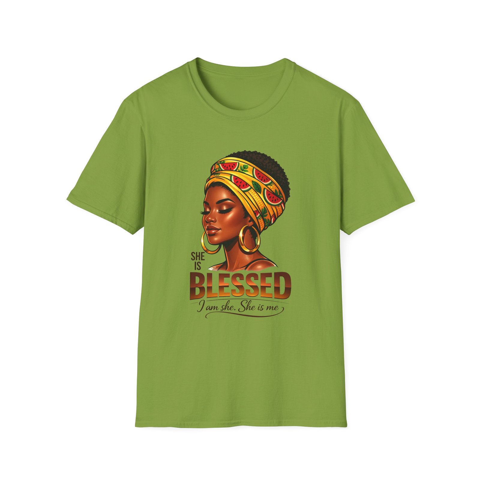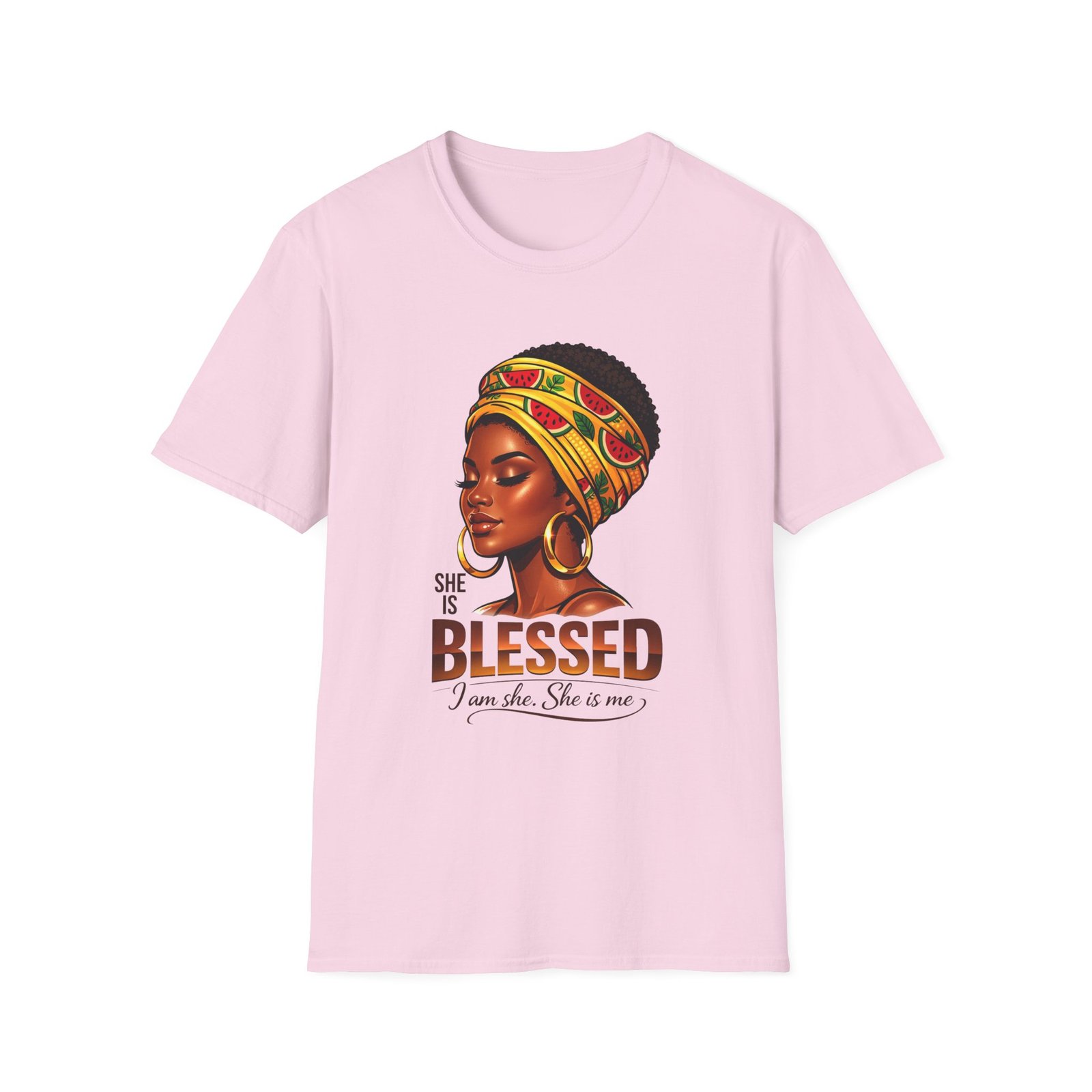 This soft, breathable tee carries quiet confidence. The front artwork—an elegant Black woman wearing a colorful headwrap—pairs warm earth tones with rich, soulful detail. Below her portrait, the uplifting message reads: “She is Blessed — I am she. She is me.” Wear it on slow mornings, community gatherings, or days when you want your outfit to speak gently but clearly. The lightweight cotton feels comfortable against the skin and the classic crew silhouette layers easily under jackets or overalls. It’s made to age with you: the ribbed collar keeps its shape, shoulder tape prevents stretching, and the clean tubular knit gives a smooth, seam-free look. This shirt slips into everyday life for those who celebrate heritage, resilience, and quiet joy.