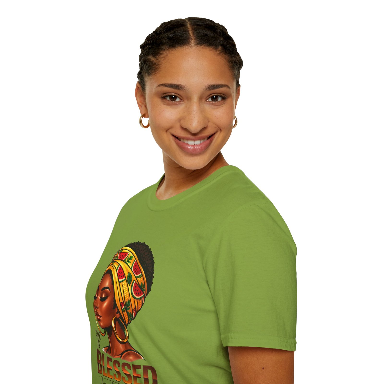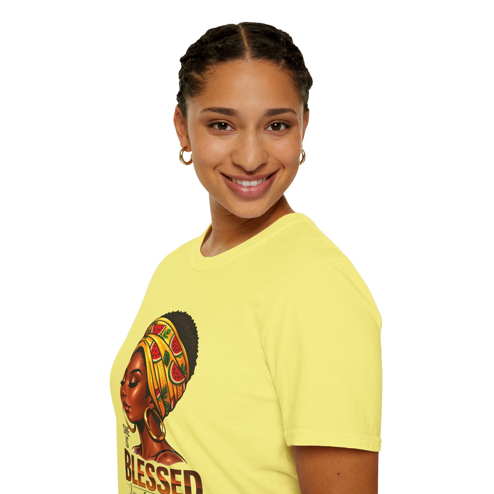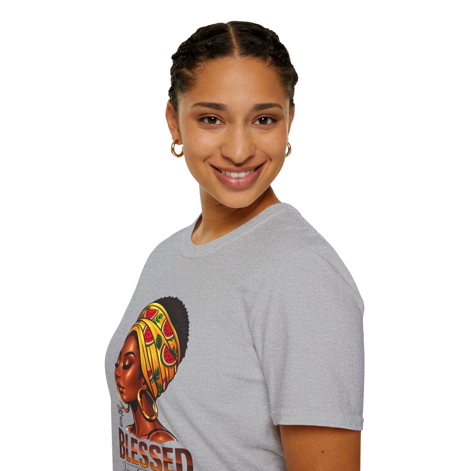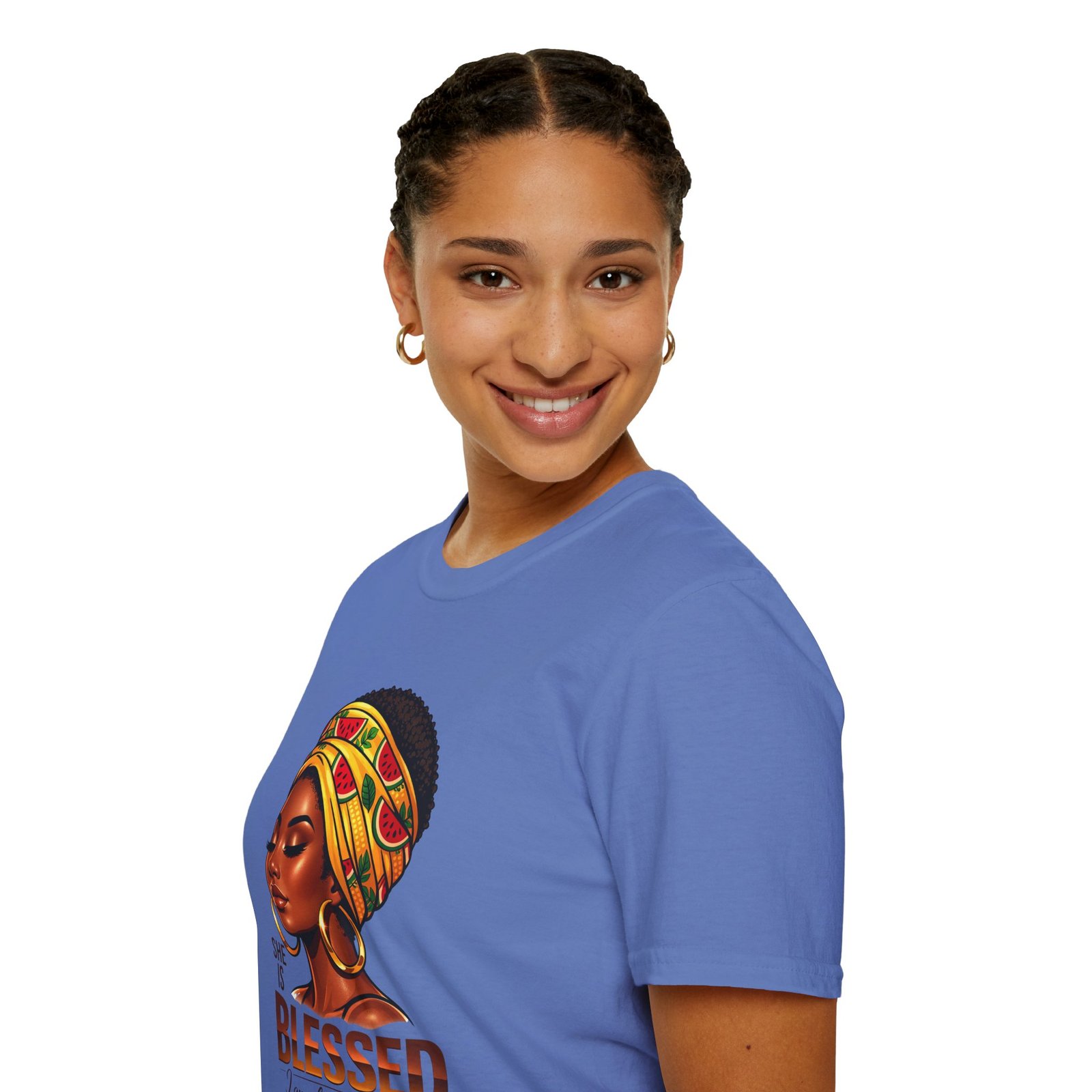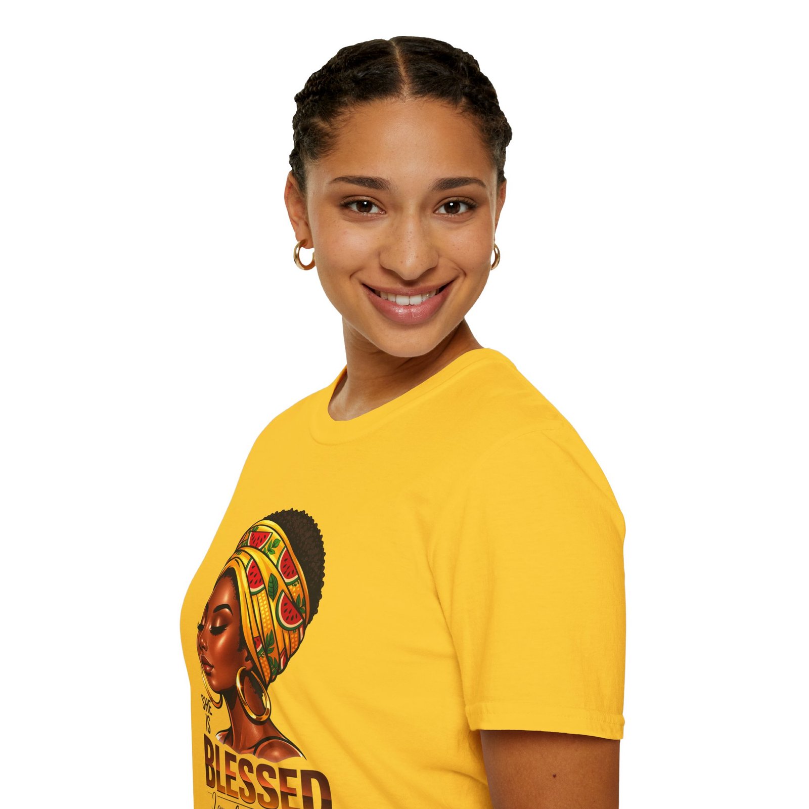 This soft, breathable tee carries quiet confidence. The front artwork—an elegant Black woman wearing a colorful headwrap—pairs warm earth tones with rich, soulful detail. Below her portrait, the uplifting message reads: “She is Blessed — I am she. She is me.” Wear it on slow mornings, community gatherings, or days when you want your outfit to speak gently but clearly. The lightweight cotton feels comfortable against the skin and the classic crew silhouette layers easily under jackets or overalls. It’s made to age with you: the ribbed collar keeps its shape, shoulder tape prevents stretching, and the clean tubular knit gives a smooth, seam-free look. This shirt slips into everyday life for those who celebrate heritage, resilience, and quiet joy.