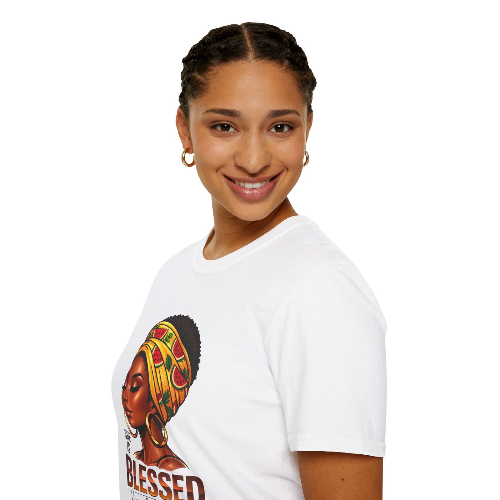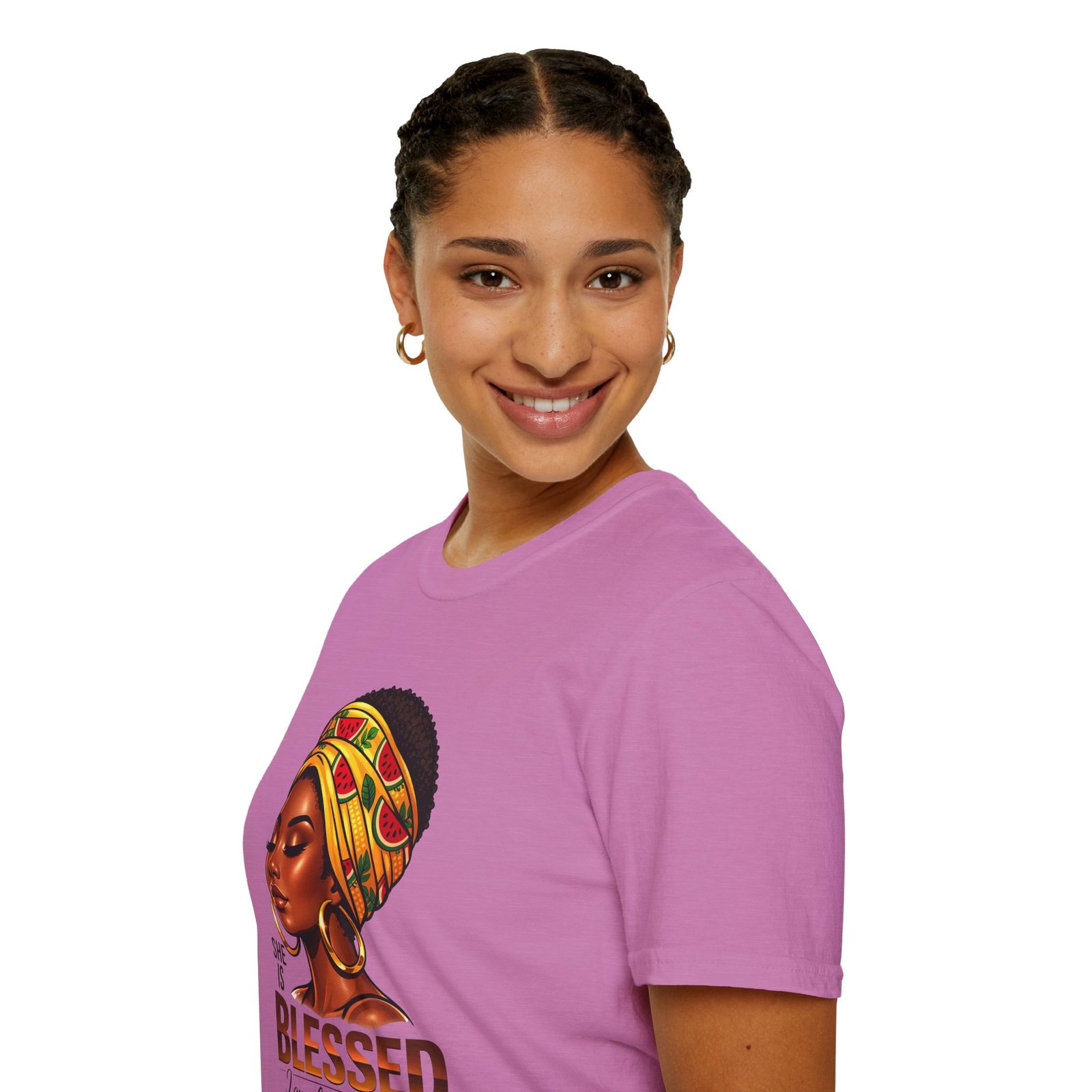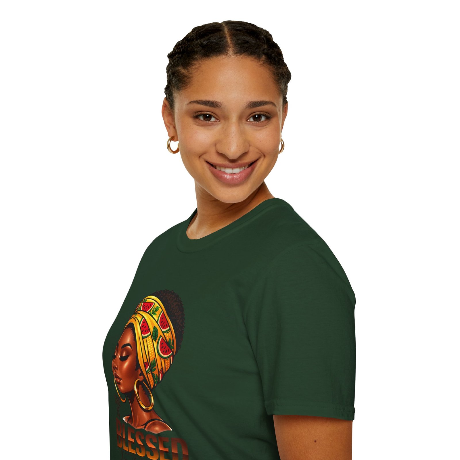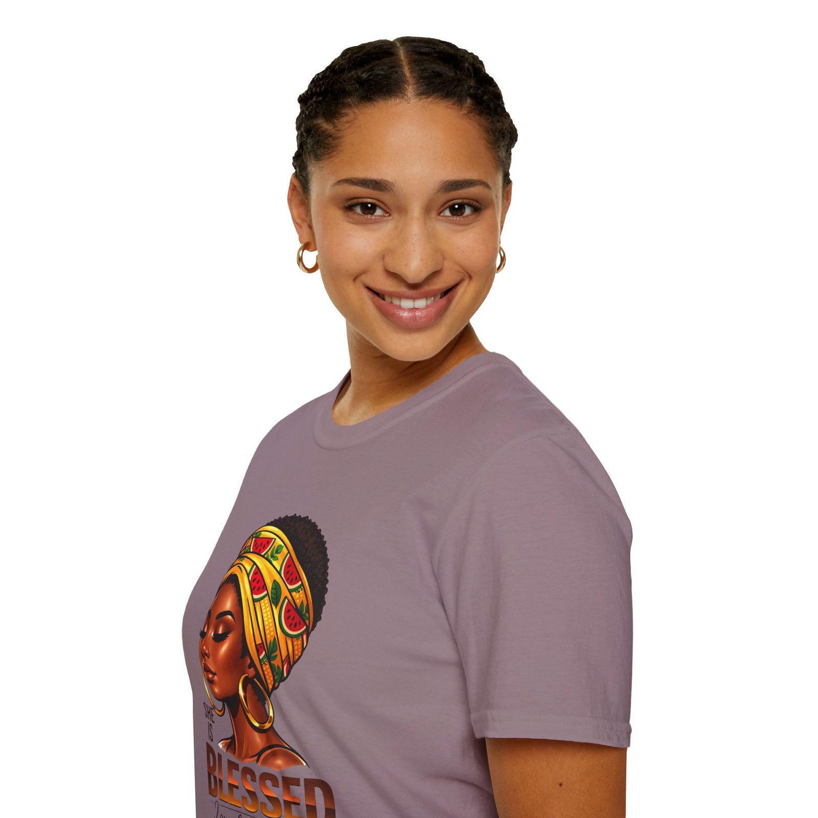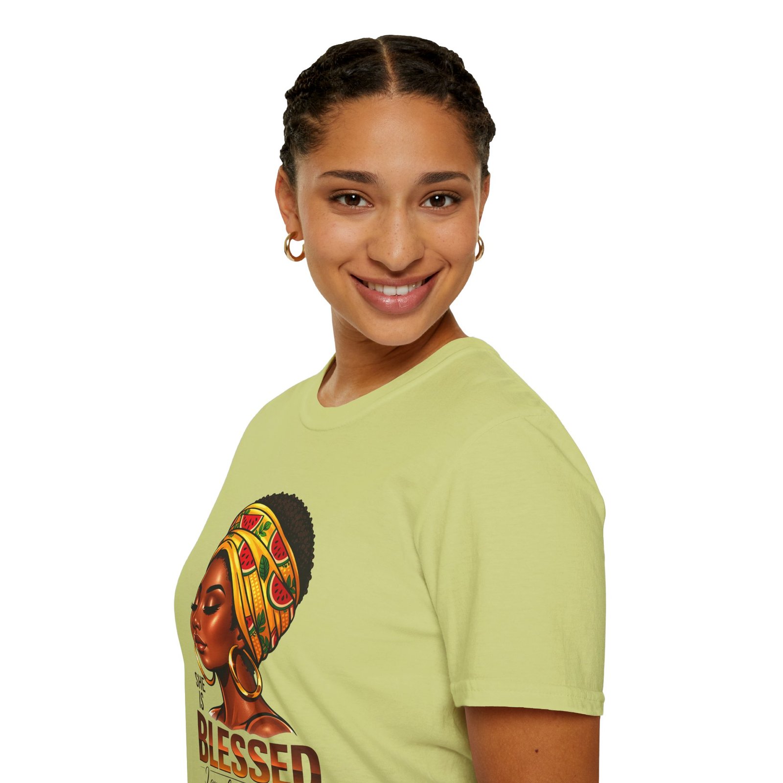 This soft, breathable tee carries quiet confidence. The front artwork—an elegant Black woman wearing a colorful headwrap—pairs warm earth tones with rich, soulful detail. Below her portrait, the uplifting message reads: “She is Blessed — I am she. She is me.” Wear it on slow mornings, community gatherings, or days when you want your outfit to speak gently but clearly. The lightweight cotton feels comfortable against the skin and the classic crew silhouette layers easily under jackets or overalls. It’s made to age with you: the ribbed collar keeps its shape, shoulder tape prevents stretching, and the clean tubular knit gives a smooth, seam-free look. This shirt slips into everyday life for those who celebrate heritage, resilience, and quiet joy.