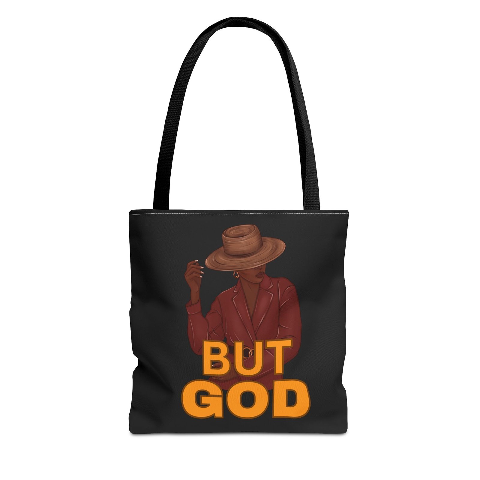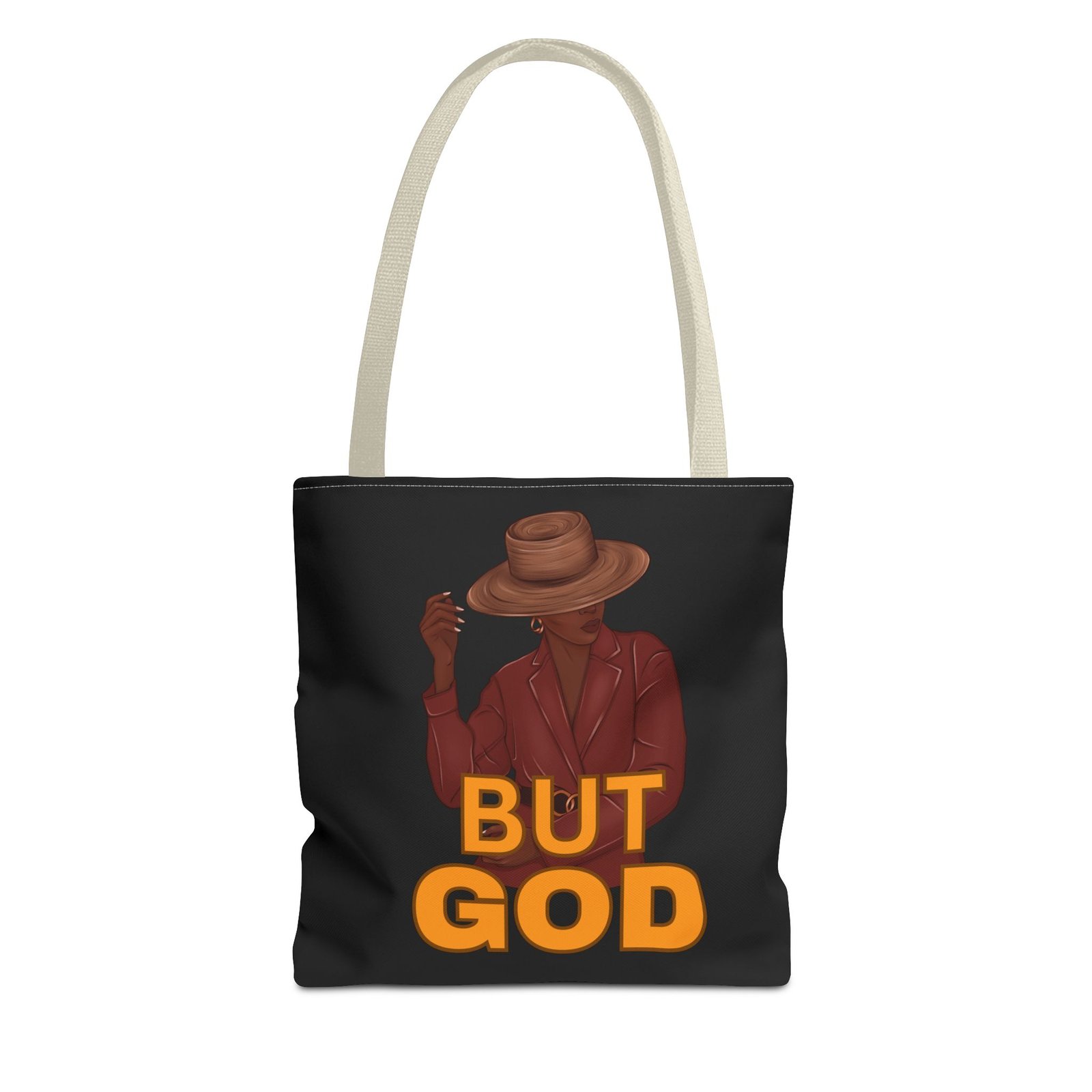 This roomy, durable tote brings quiet confidence to everyday carry. Matte black fabric makes the warm ochre “BUT GOD” lettering pop, while the illustrated figure — hat brim low, cigarette poised — gives the bag a slow, elegant attitude. It holds groceries, notebooks, or market finds without sagging thanks to reinforced handles and boxed corners. Choose from five handle colors to match your look, and pick the size that fits your rhythm. Wear it to church socials, weekend markets, study sessions, or city strolls; it reads like a statement and settles into daily life like a trusted companion.