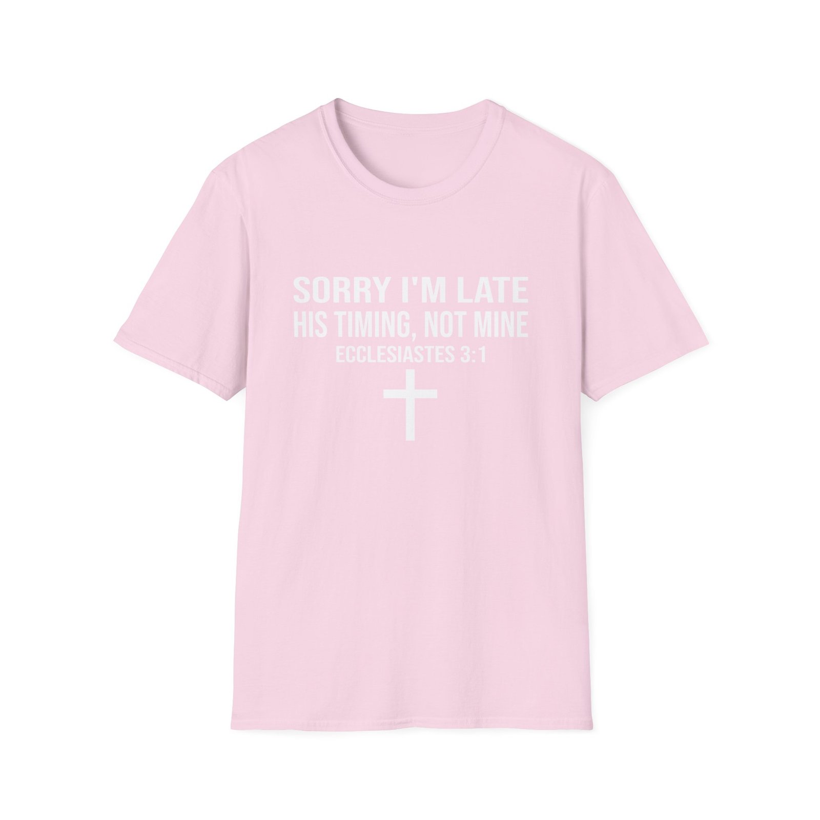 Wear a little faith and a lighthearted wink with this soft cotton tee. The front features bold, white lettering reading “SORRY I’M LATE — HIS TIMING, NOT MINE” with a simple cross and the reference Ecclesiastes 3:1 beneath. The shirt’s clean, minimalist layout puts the message front-and-center without fuss, so it reads clearly from a distance. Lightweight ring-spun cotton feels soft against the skin and drapes casually for everyday wear. This tee slips easily into a Sunday morning wardrobe, a coffee run after service, or a relaxed gathering with church friends. It’s for people who live their faith with humor and humility — those who appreciate Scripture, small reminders of God’s timing, and clothing that speaks gently rather than shouts. The neutral styling pairs with jeans, leggings, or layered under a cardigan or jacket when the temperature dips.