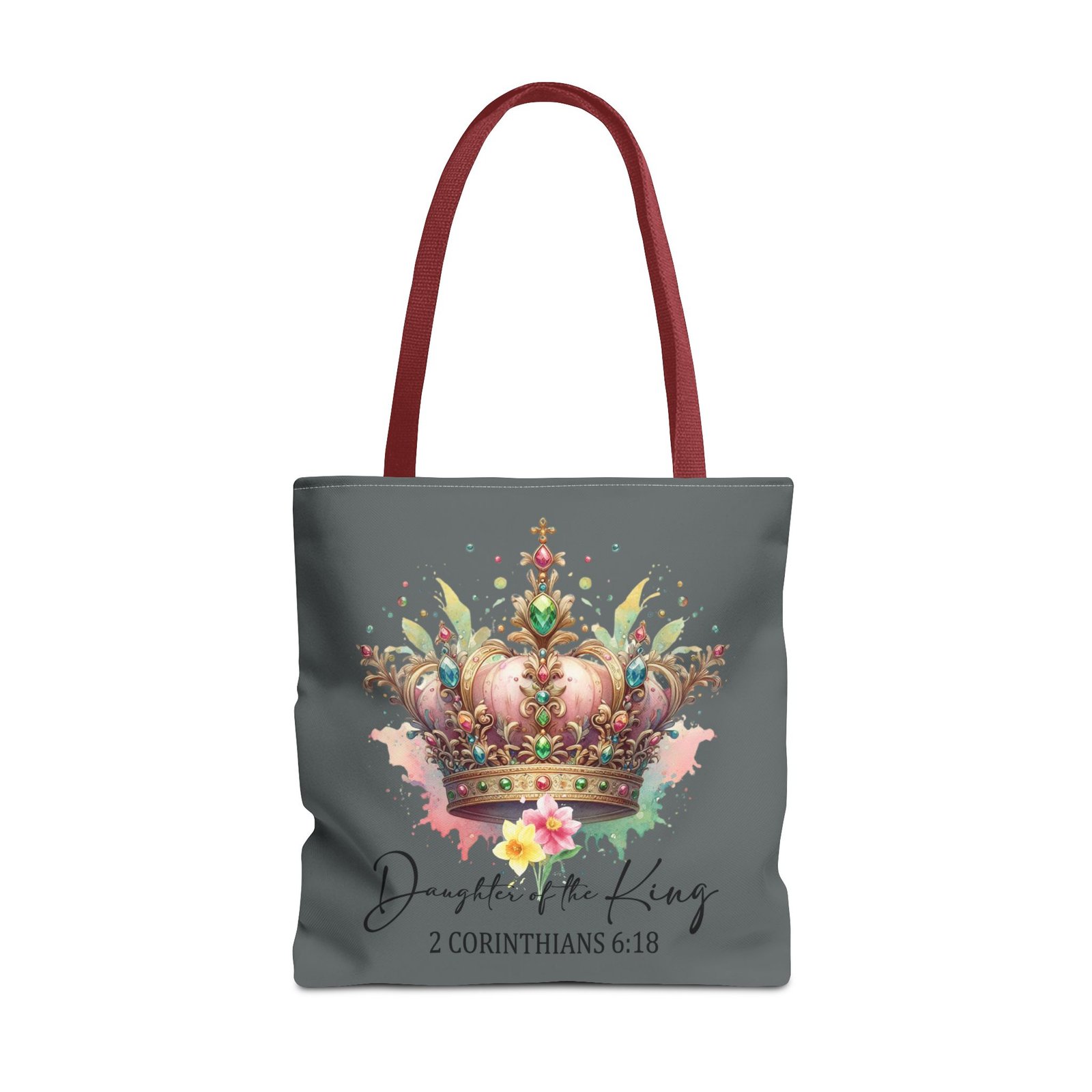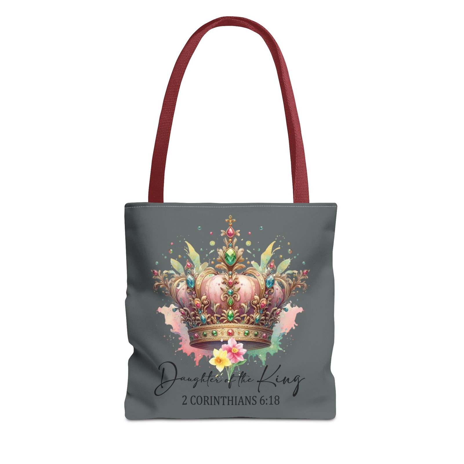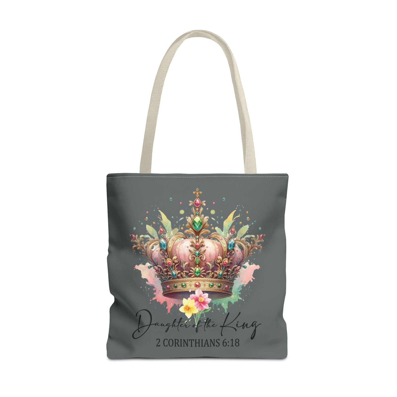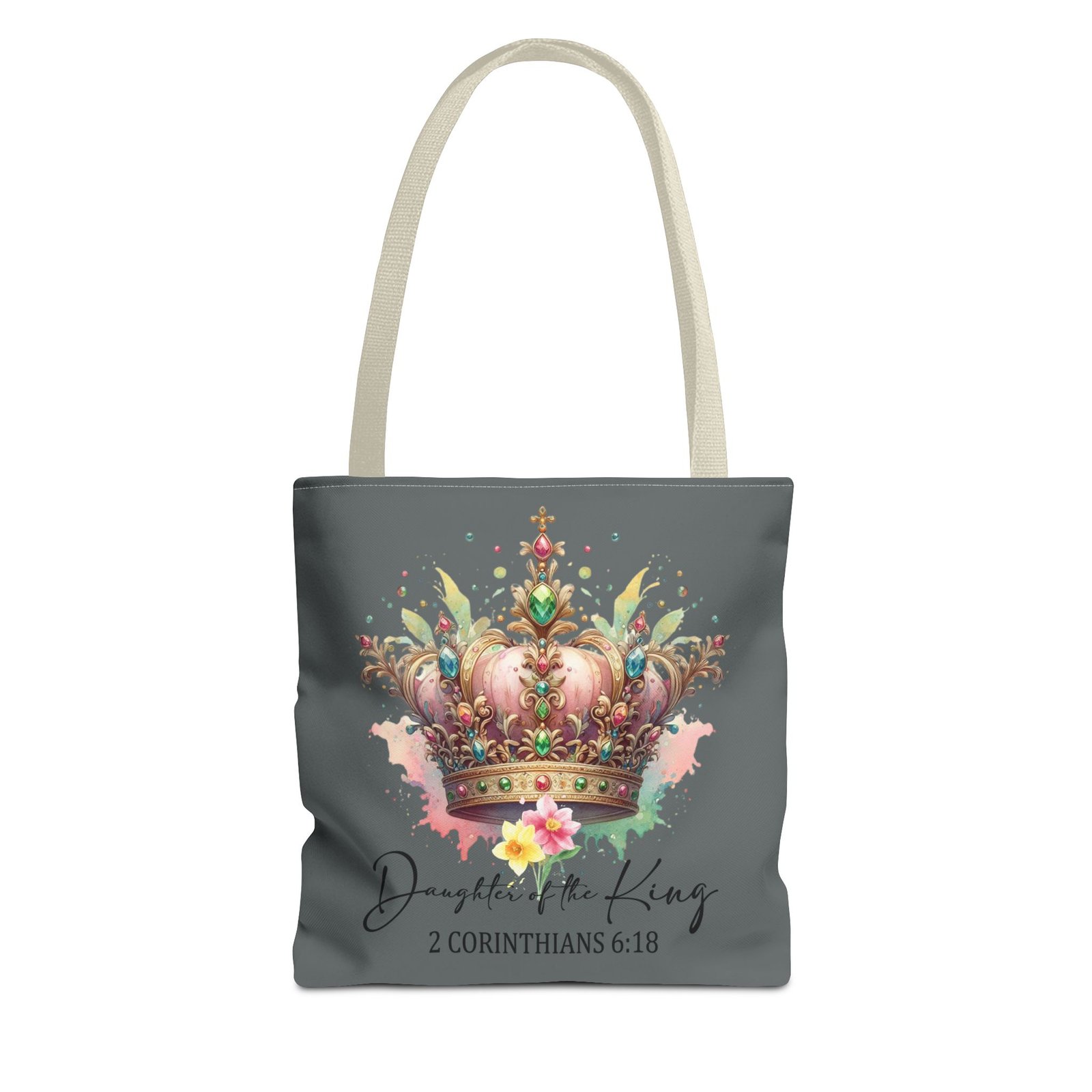 Carry a gentle reminder of worth and faith everywhere you go. This soft, durable tote features a watercolor-style crown in warm pinks and golds, with the script sentiment “Daughter of the King” and 2 Corinthians 6:18 beneath. The muted gray background keeps the artwork serene and wearable, while the black handles add contrast and everyday practicality. It’s roomy enough for a Bible, journal, or market finds, and the boxed corners give it structure without feeling bulky. Bring a little quiet confidence to errands, church, or fellowship gatherings with a piece that feels personal and uplifting.