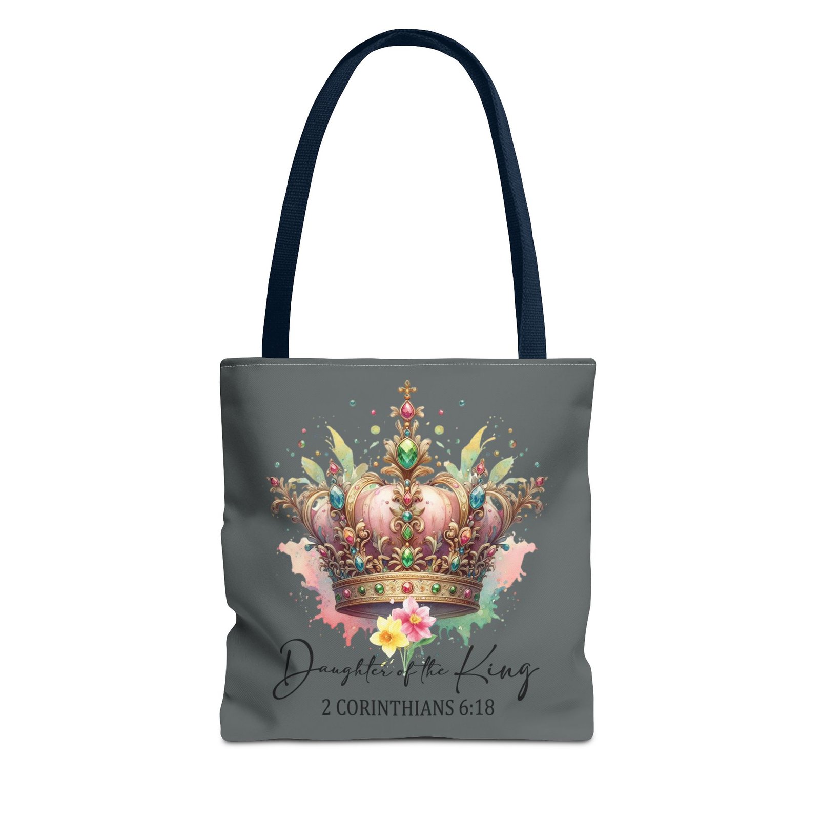 Be the first to review “Daughter of the King Crown Tote Bag — 2 Corinthians 6:18 Christian Faith Tote – Dark Grey”