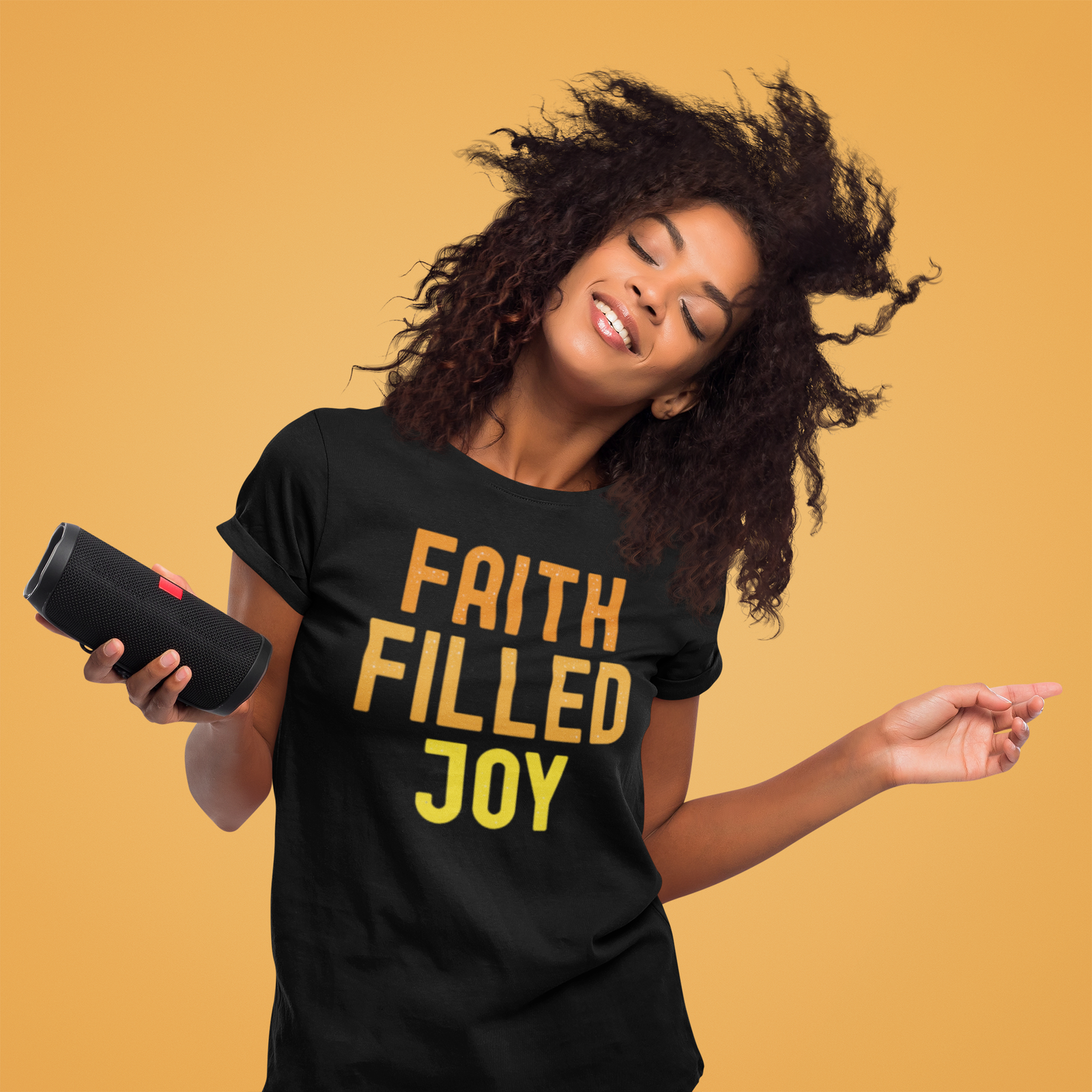 This soft, classic tee speaks with quiet confidence. The front wears a warm gradient message — Faith Filled Joy — in sunset tones that fade from coral to golden yellow, while the back carries a graceful heart