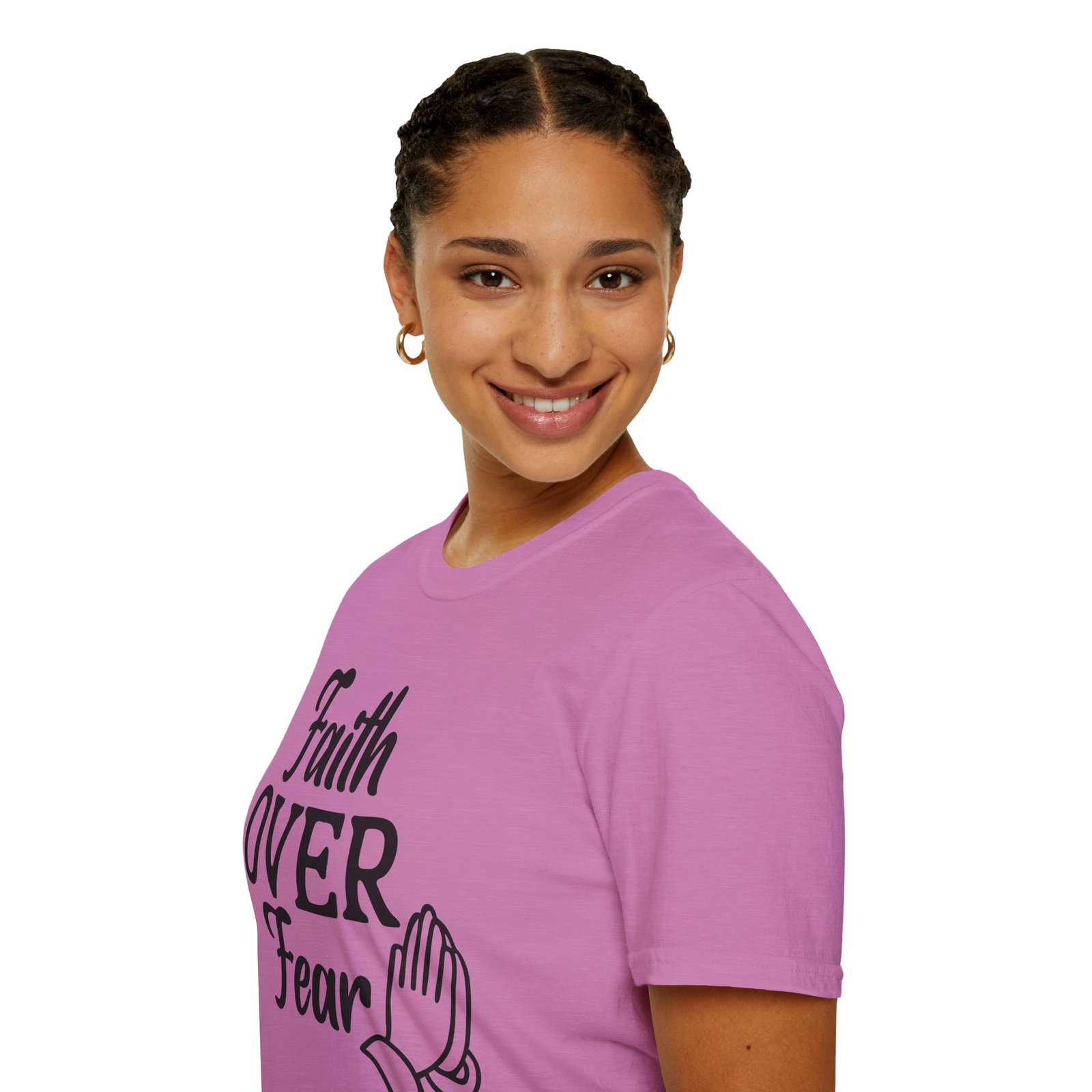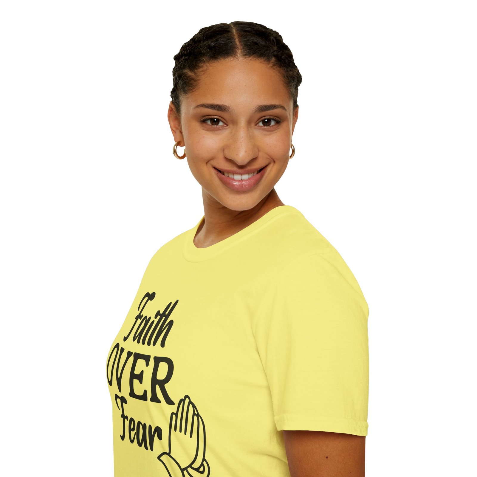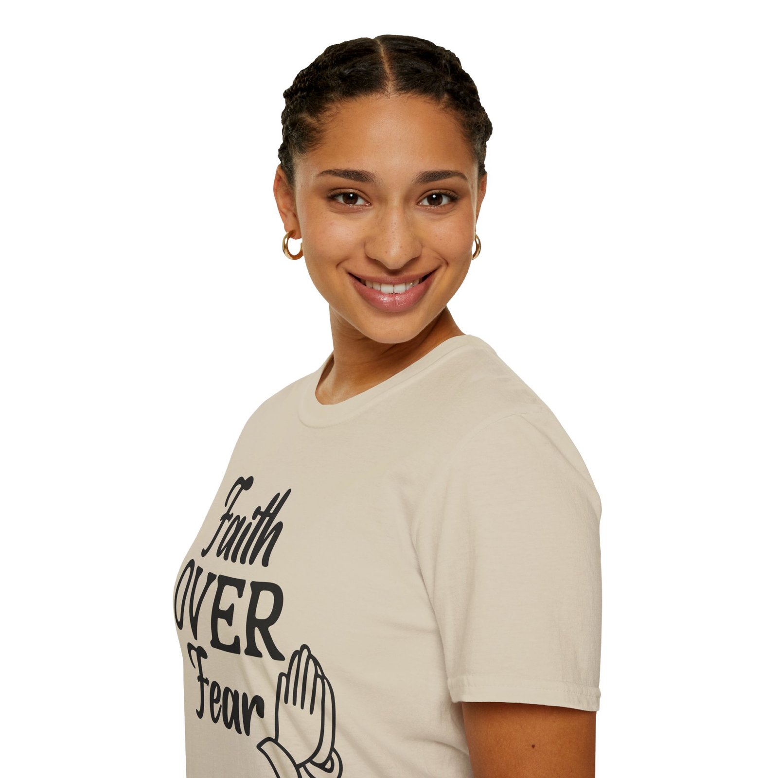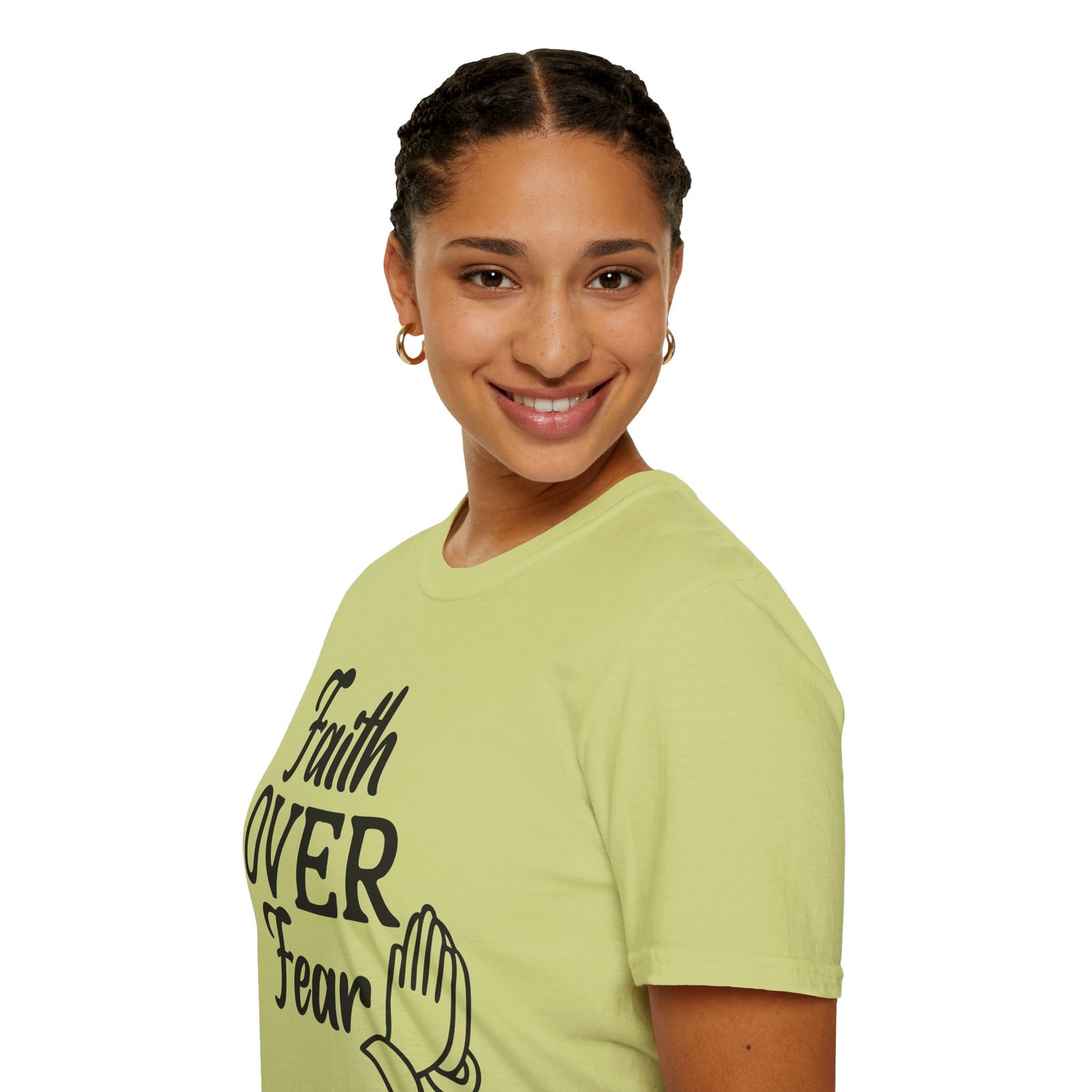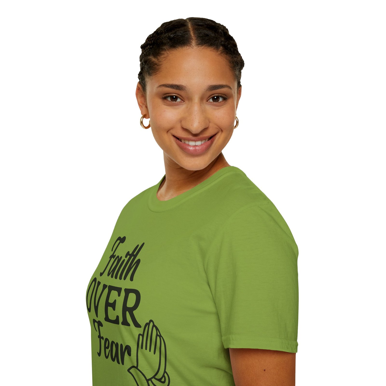 A soft, breathable tee that wears like a quiet affirmation. This lightweight cotton shirt carries a simple, hand-lettered message — “Faith OVER Fear” — paired with a small prayer-hands icon. It sits clean and calm on the chest, letting the message speak without shouting. Wear it to church, a morning walk, volunteer days, or when you need a wearable reminder to steady your heart. The classic crew neck and regular fit layer easily under jackets or over long-sleeve tees. Subtle natural flecks are visible on unprocessed colorways, adding a lived-in, honest feel. Ethically sourced cotton and thoughtful construction mean this shirt feels gentle against the skin and holds its shape through repeated wear.
