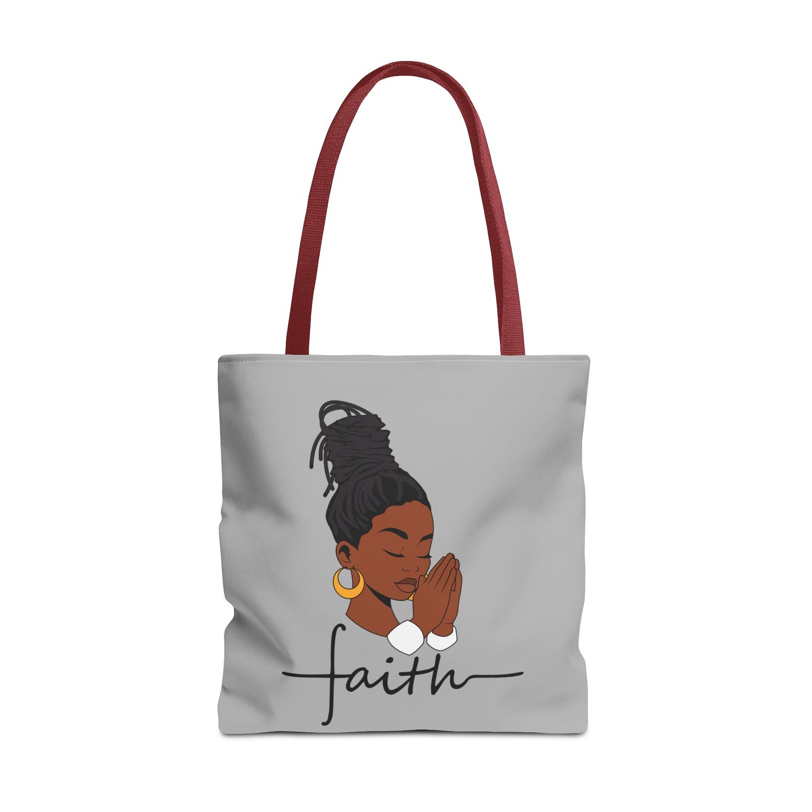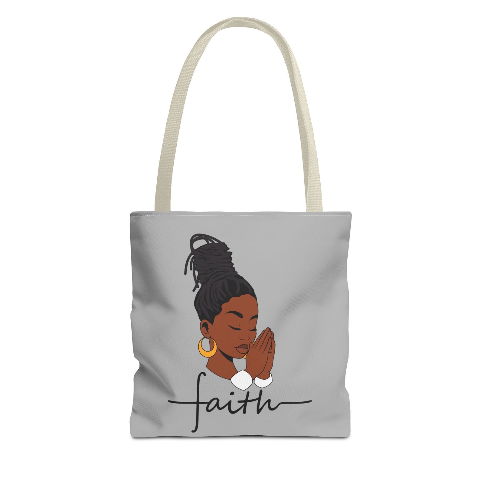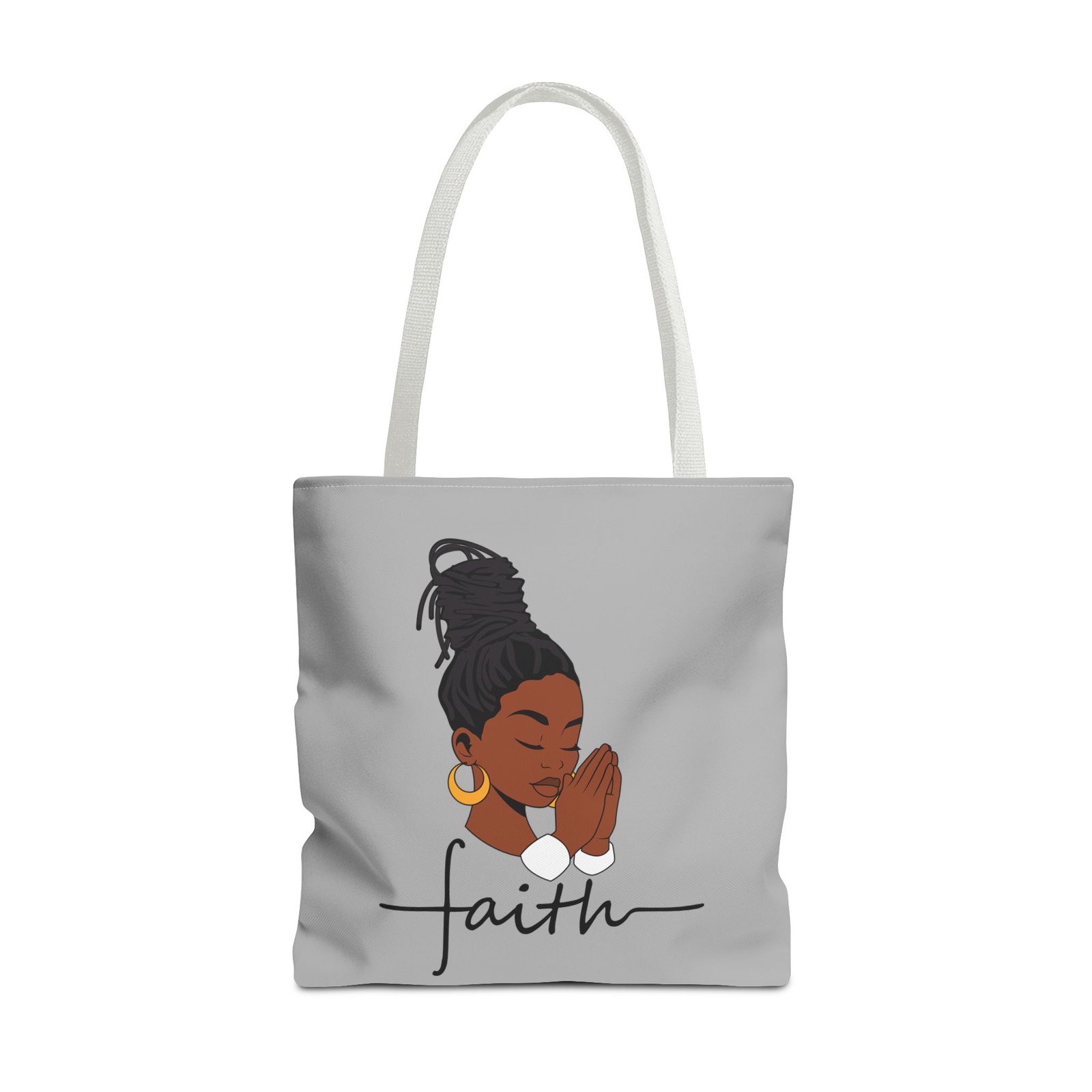 A soft, everyday tote that carries calm and purpose. This printed polyester bag shows a serene portrait of a woman with her hands folded in prayer and the word “faith” penned beneath—an artful reminder to move through busy days grounded and hopeful. The muted background and bold illustration make it easy to pair with casual looks while the roomy boxed corners and reinforced handles stand up to errands, church gatherings, or quiet mornings at a coffee shop. Lightweight yet sturdy, it’s designed to be used every day and to age with the small marks of a well-lived life.