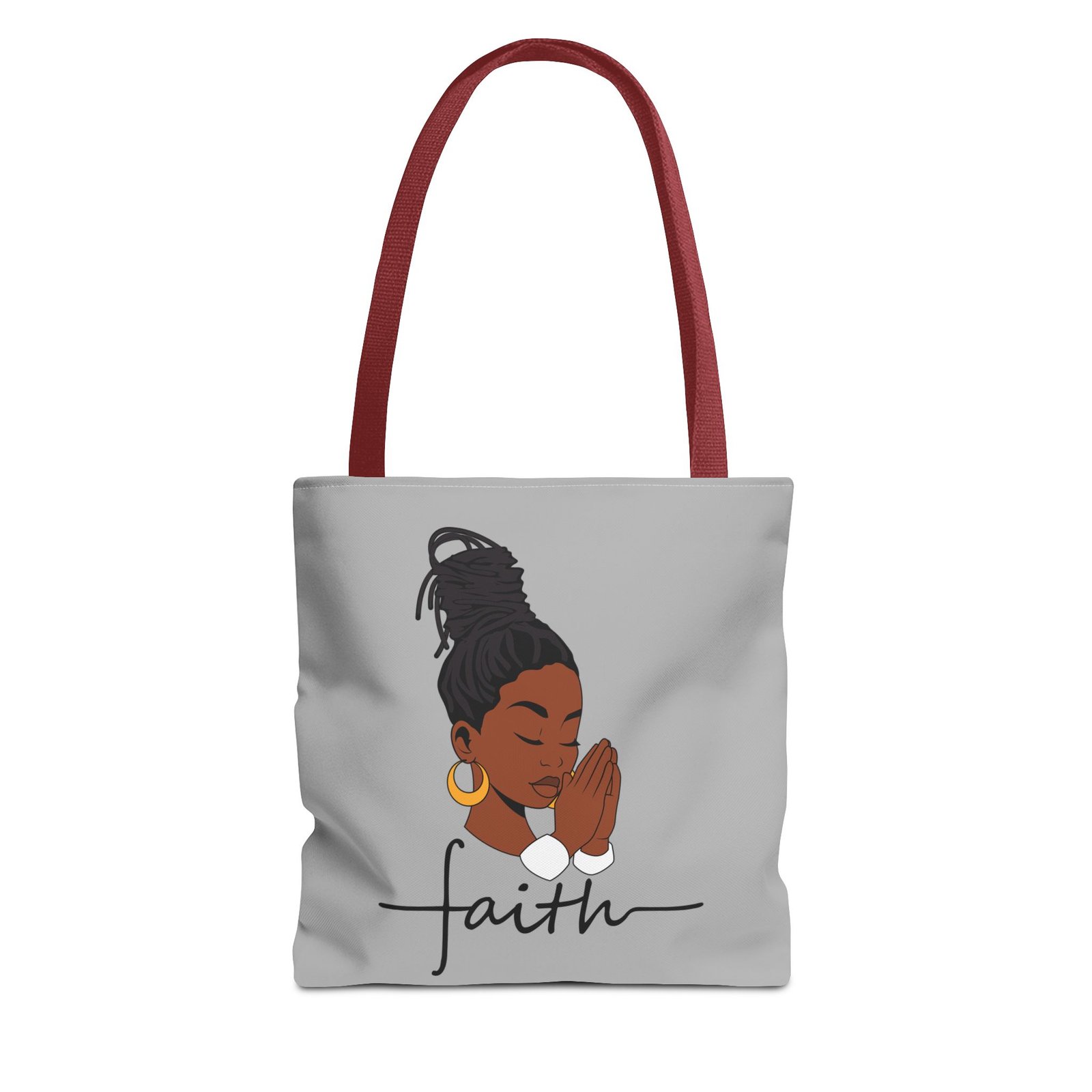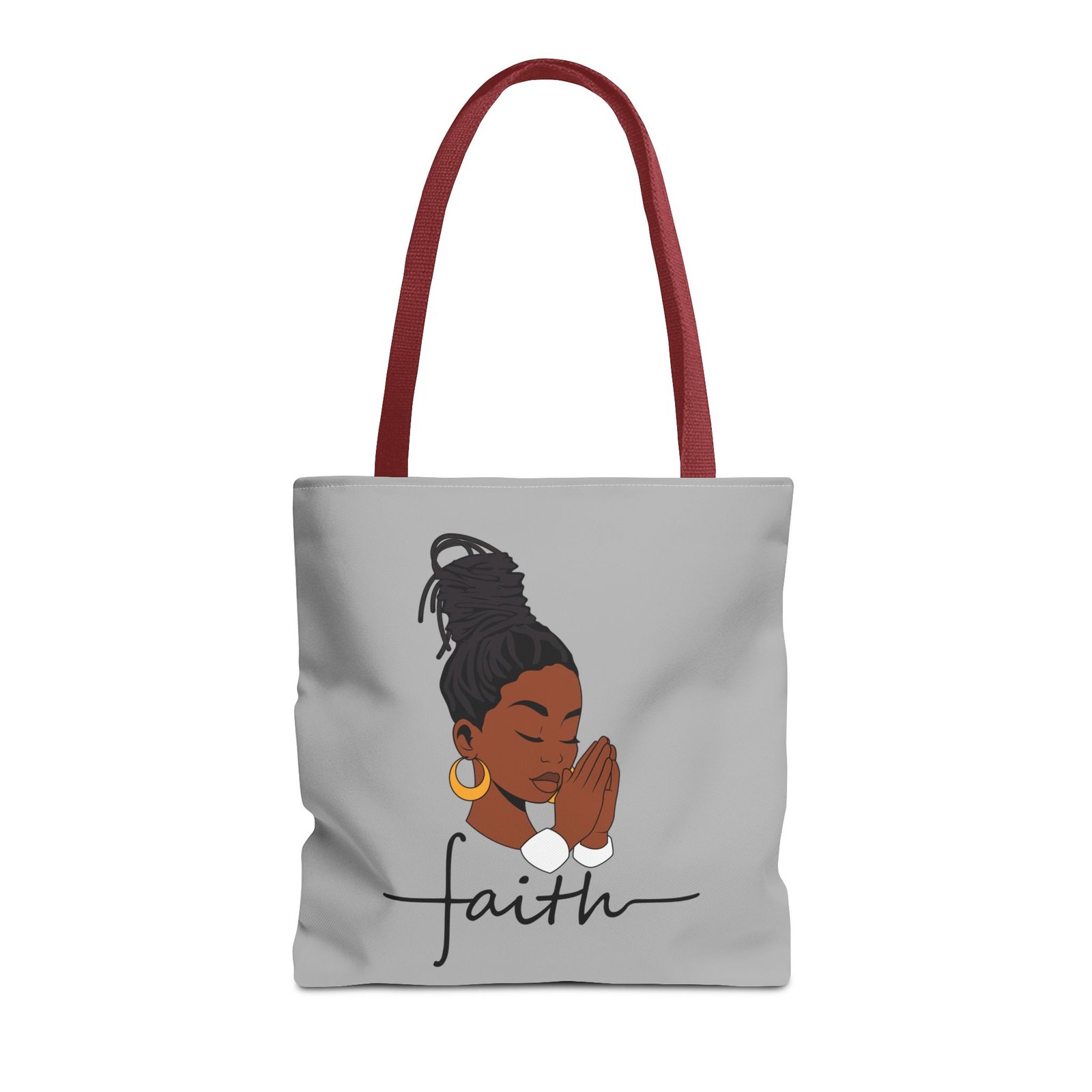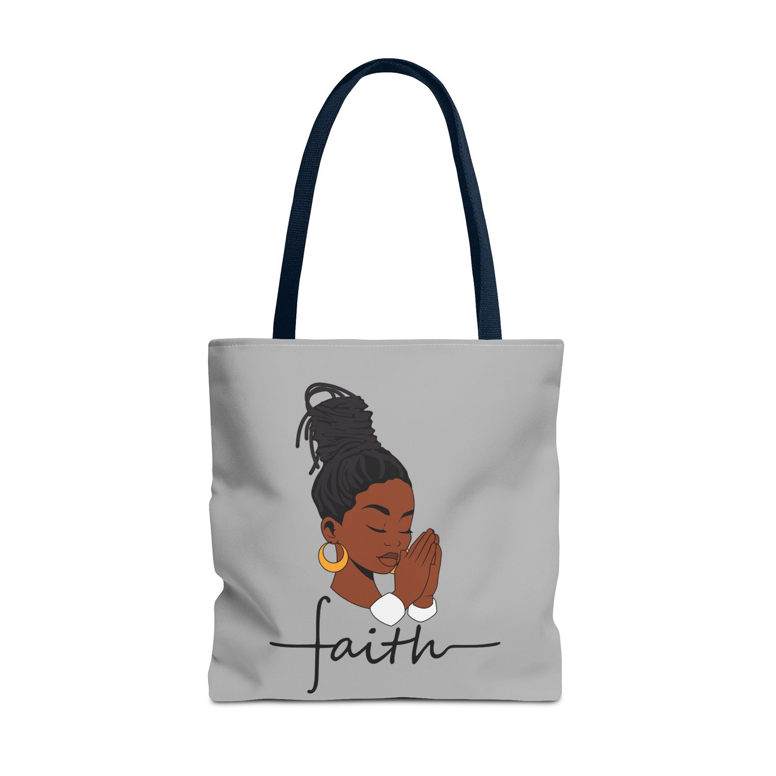 A soft, everyday tote that carries calm and purpose. This printed polyester bag shows a serene portrait of a woman with her hands folded in prayer and the word “faith” penned beneath—an artful reminder to move through busy days grounded and hopeful. The muted background and bold illustration make it easy to pair with casual looks while the roomy boxed corners and reinforced handles stand up to errands, church gatherings, or quiet mornings at a coffee shop. Lightweight yet sturdy, it’s designed to be used every day and to age with the small marks of a well-lived life.