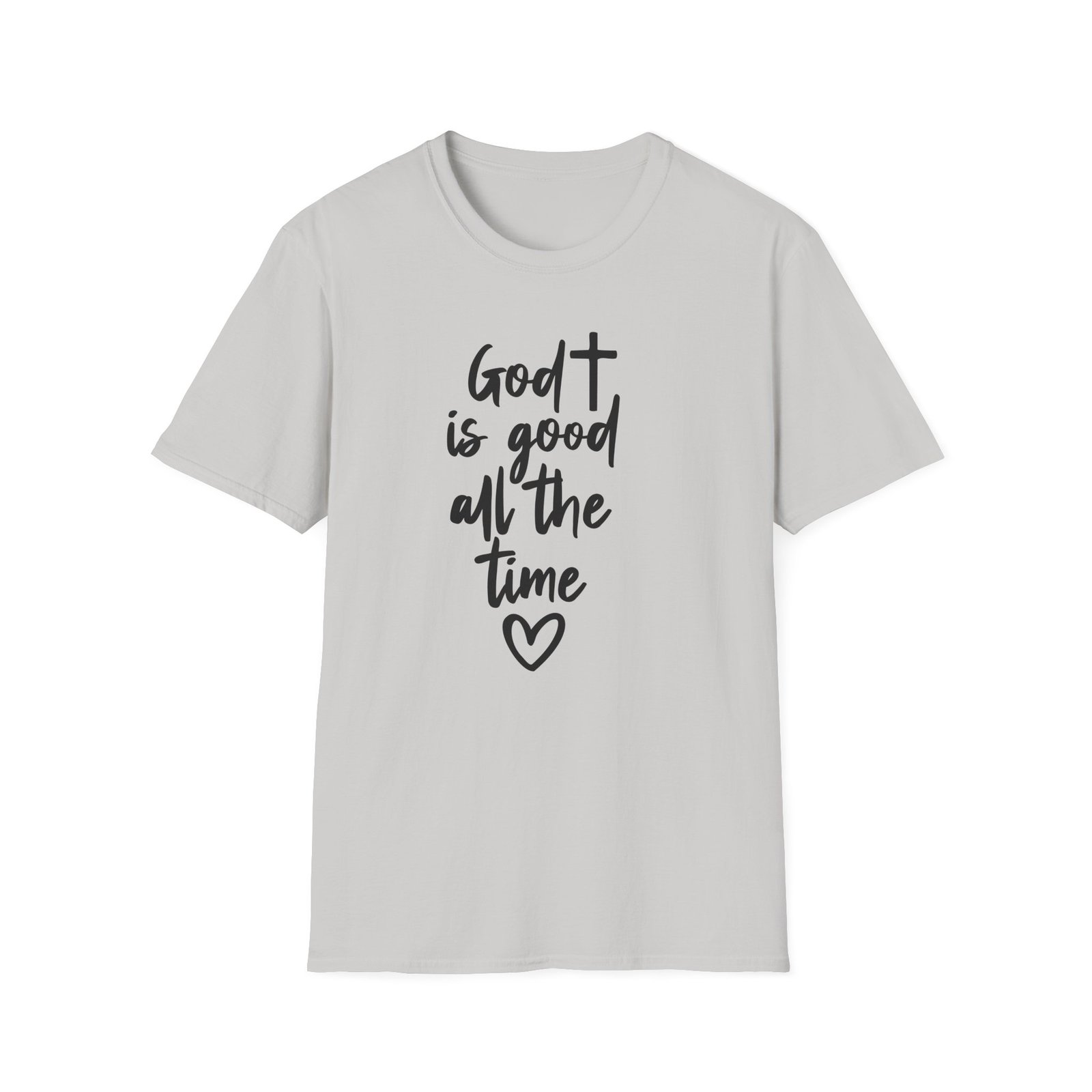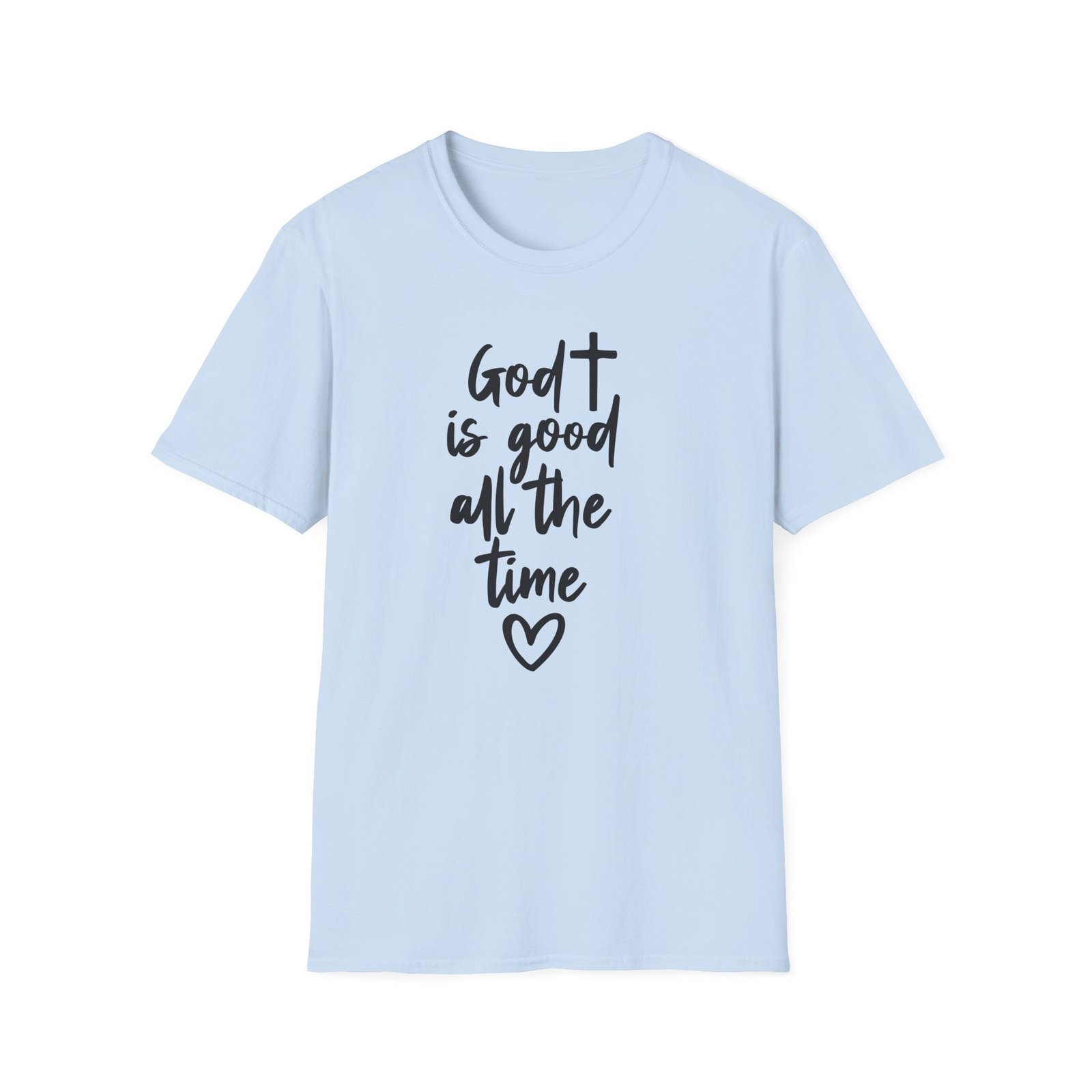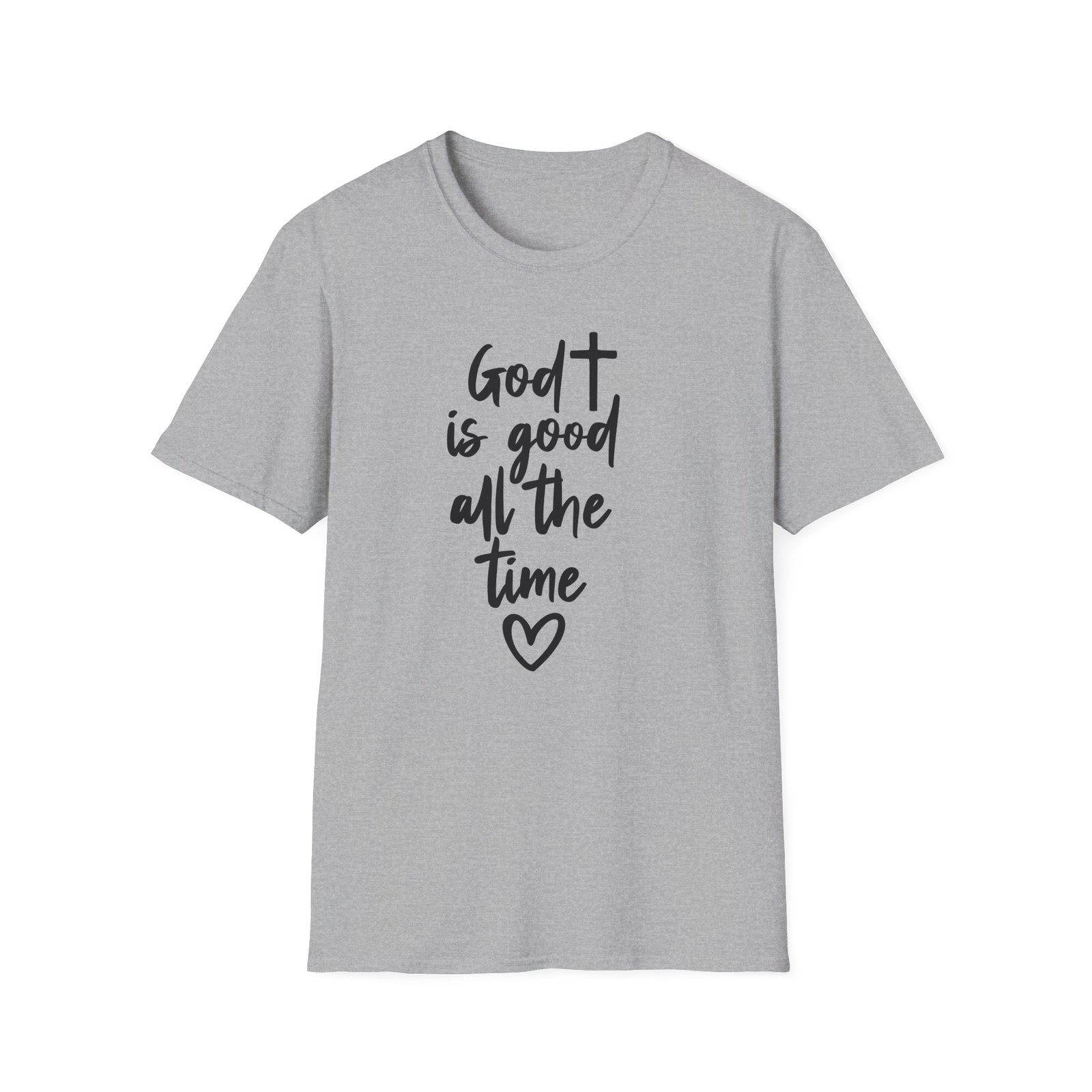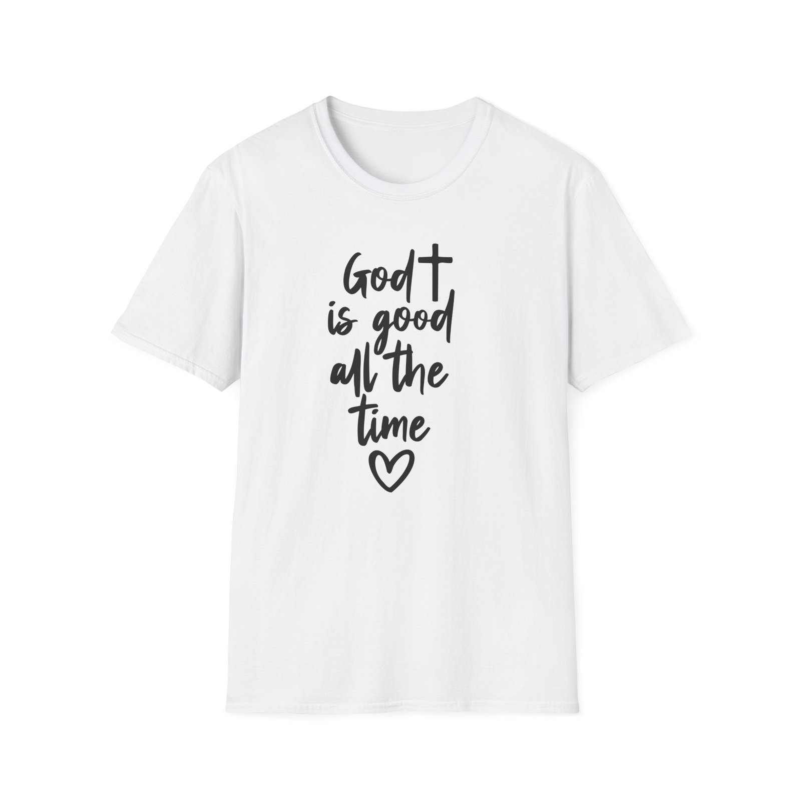 A lightweight, soft cotton tee that says faith out loud with quiet confidence. The hand-lettered message “God is good all the time” flows down the front in casual black script, finished with a small heart that keeps the sentiment warm and personal. It wears like your favorite go-to shirt — breathable, smooth, and easy to layer under a cardigan or over a pair of denim. The clean white canvas makes the lettering stand out for gatherings, church events, or everyday moments when you want your faith to be seen without shouting. Comfortable enough for long Sundays, dependable enough for volunteer days, and simple enough to pair with sneakers or flats.