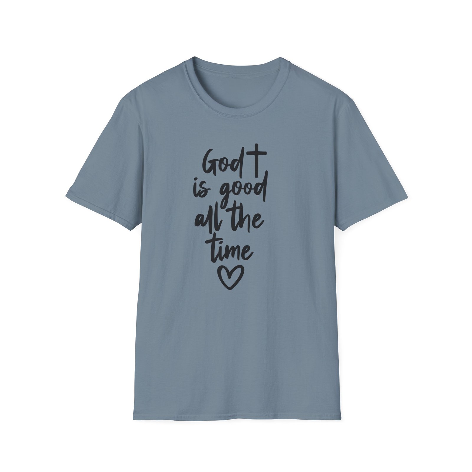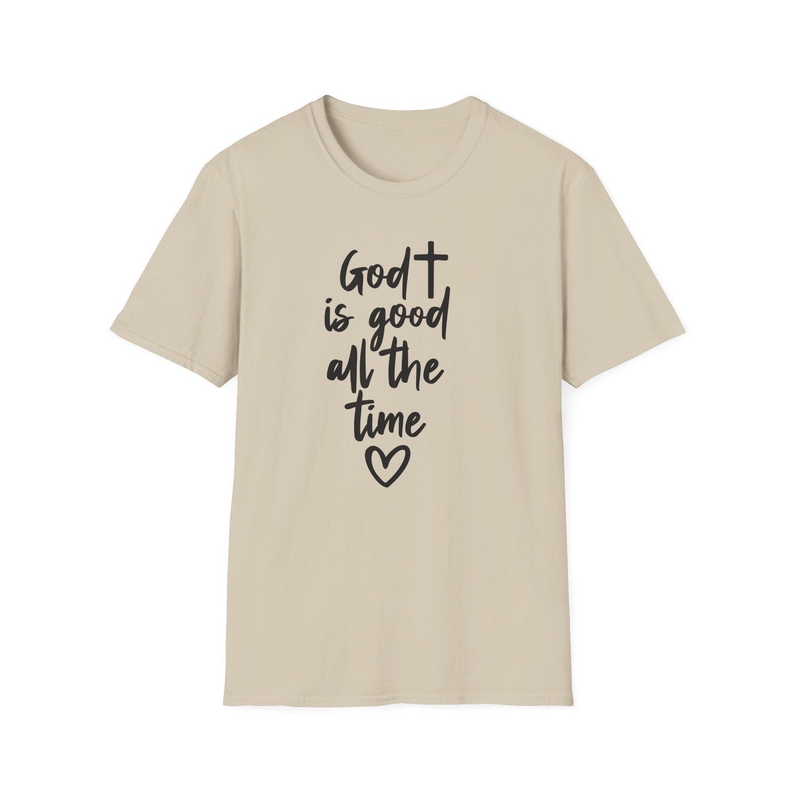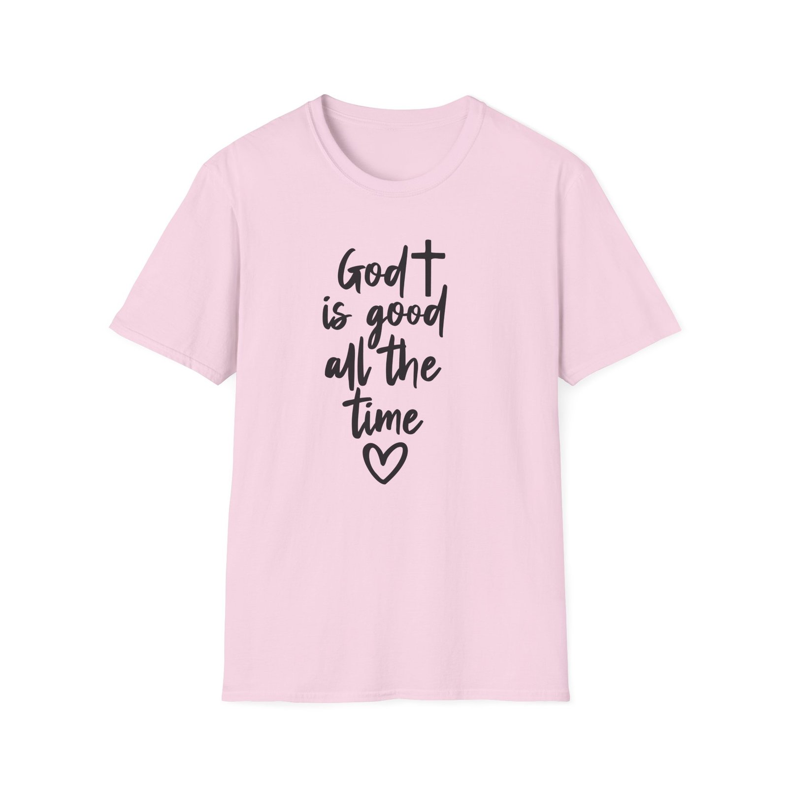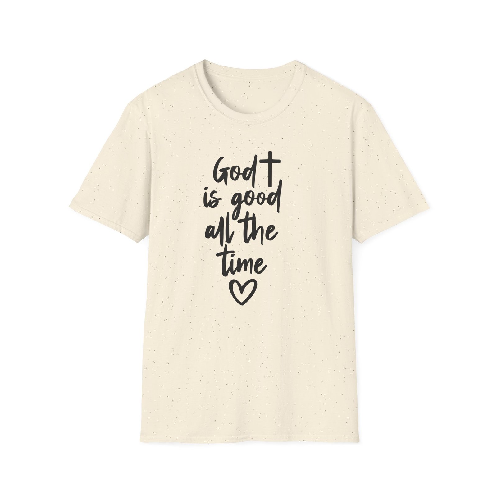 A lightweight, soft cotton tee that says faith out loud with quiet confidence. The hand-lettered message “God is good all the time” flows down the front in casual black script, finished with a small heart that keeps the sentiment warm and personal. It wears like your favorite go-to shirt — breathable, smooth, and easy to layer under a cardigan or over a pair of denim. The clean white canvas makes the lettering stand out for gatherings, church events, or everyday moments when you want your faith to be seen without shouting. Comfortable enough for long Sundays, dependable enough for volunteer days, and simple enough to pair with sneakers or flats.