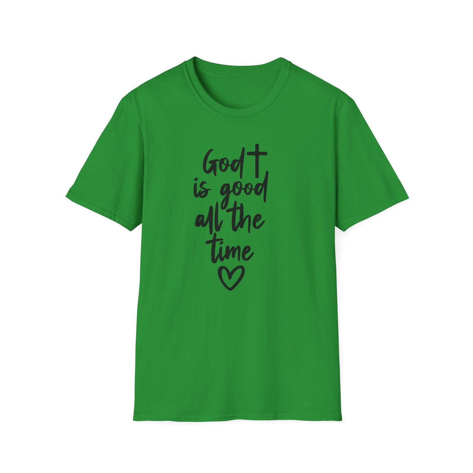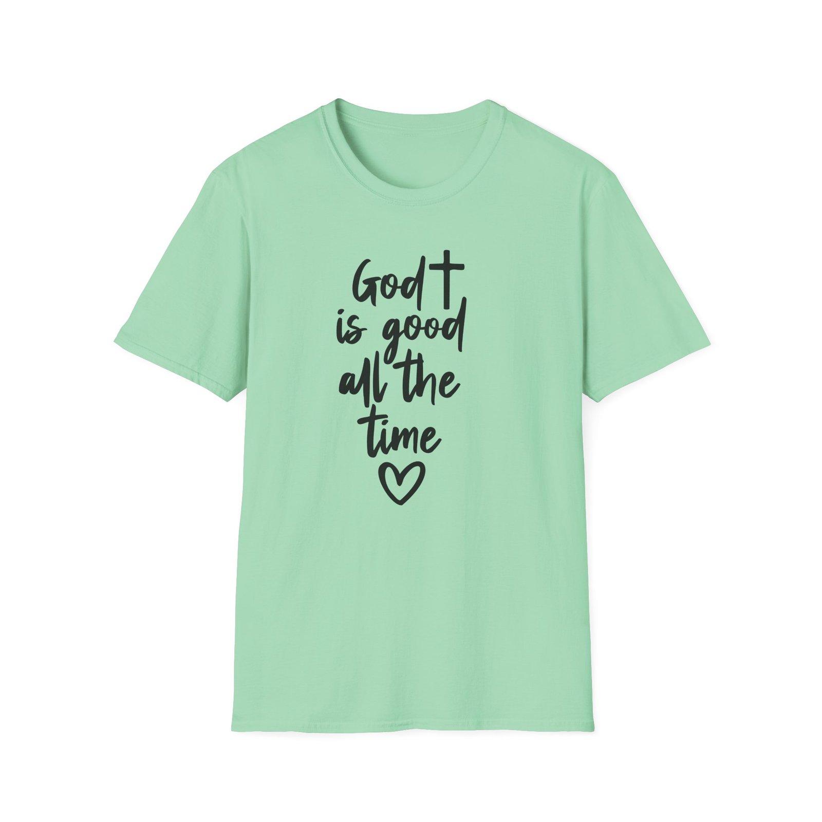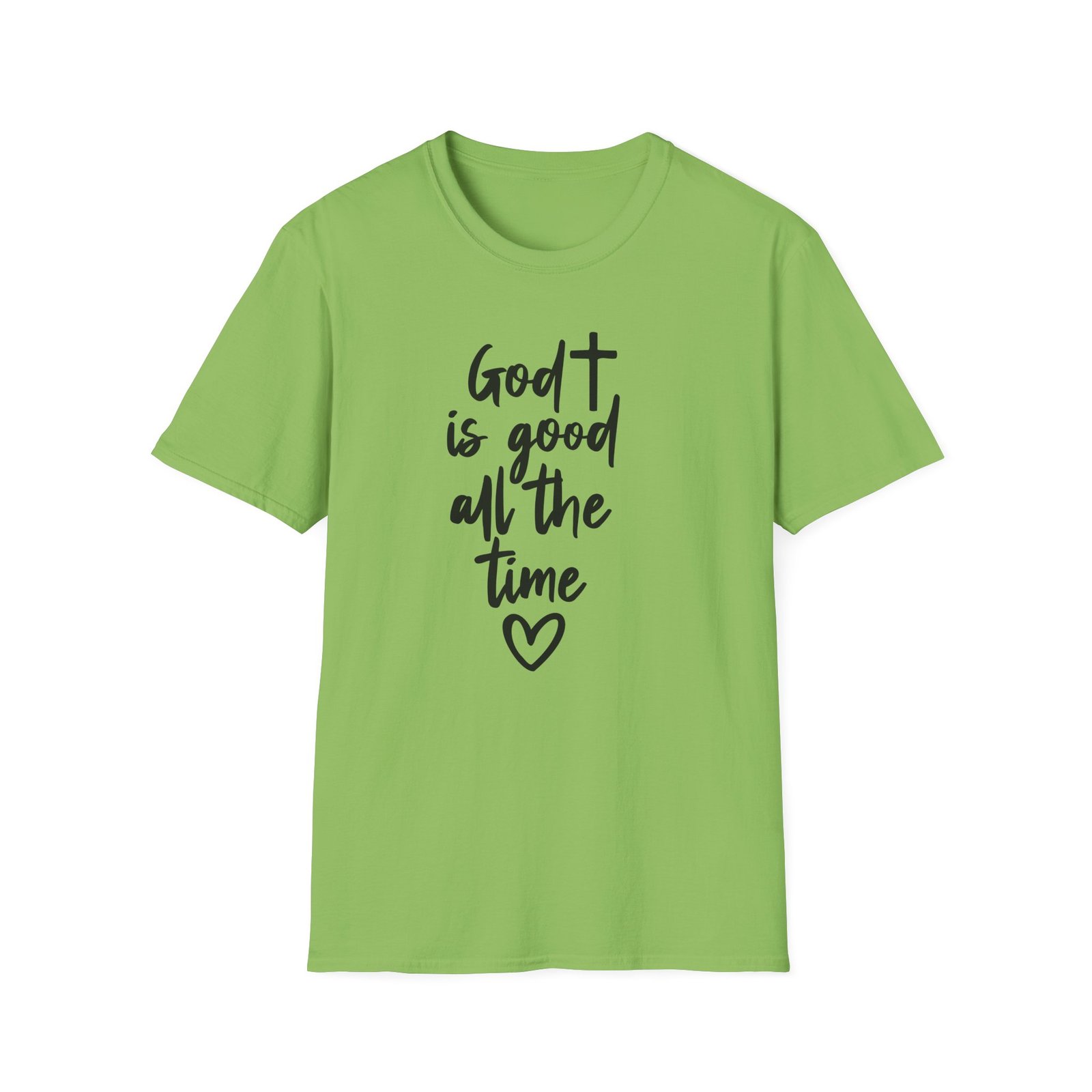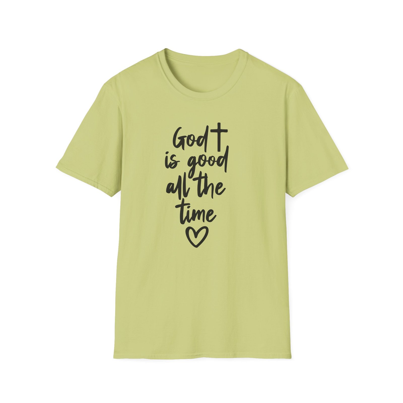 A lightweight, soft cotton tee that says faith out loud with quiet confidence. The hand-lettered message “God is good all the time” flows down the front in casual black script, finished with a small heart that keeps the sentiment warm and personal. It wears like your favorite go-to shirt — breathable, smooth, and easy to layer under a cardigan or over a pair of denim. The clean white canvas makes the lettering stand out for gatherings, church events, or everyday moments when you want your faith to be seen without shouting. Comfortable enough for long Sundays, dependable enough for volunteer days, and simple enough to pair with sneakers or flats.