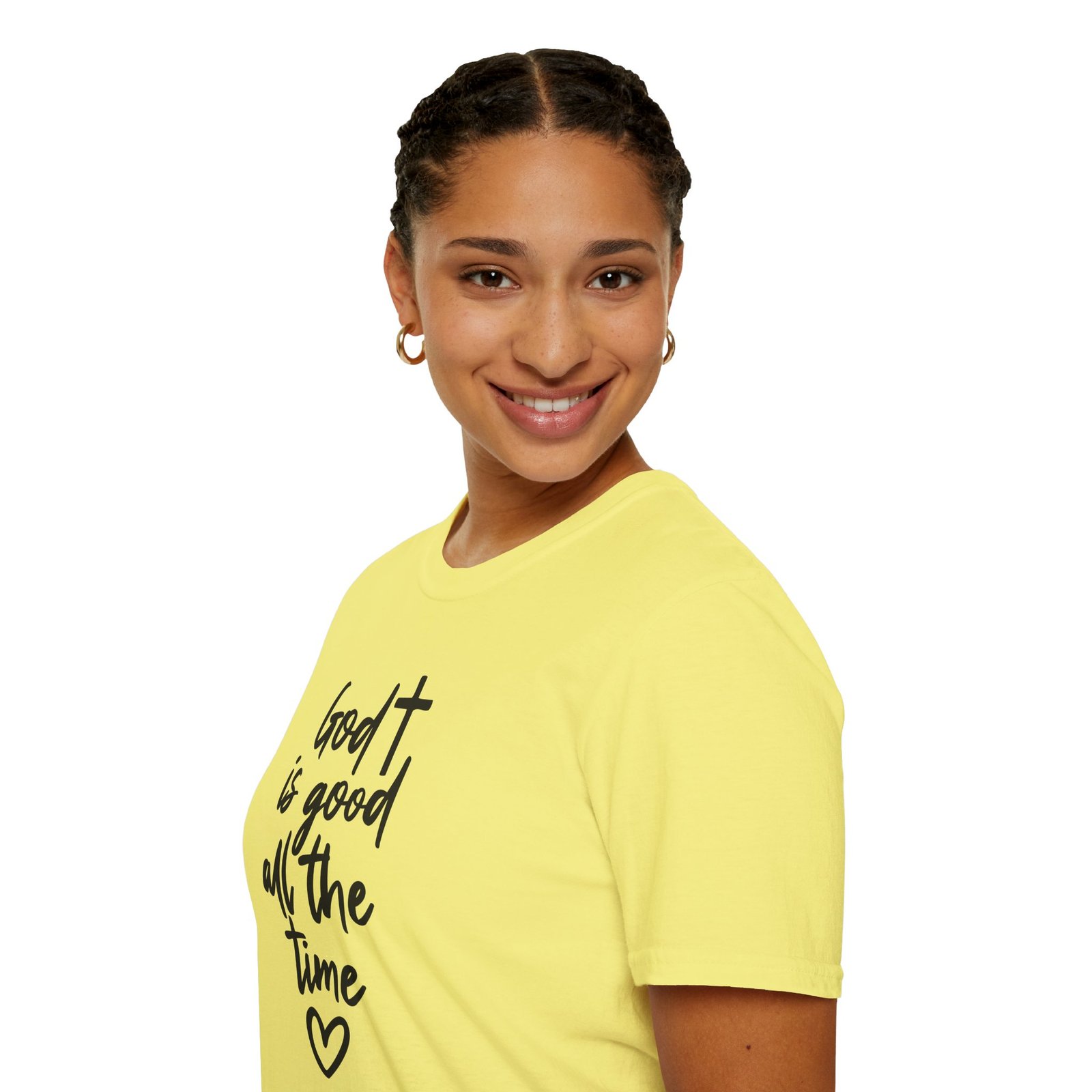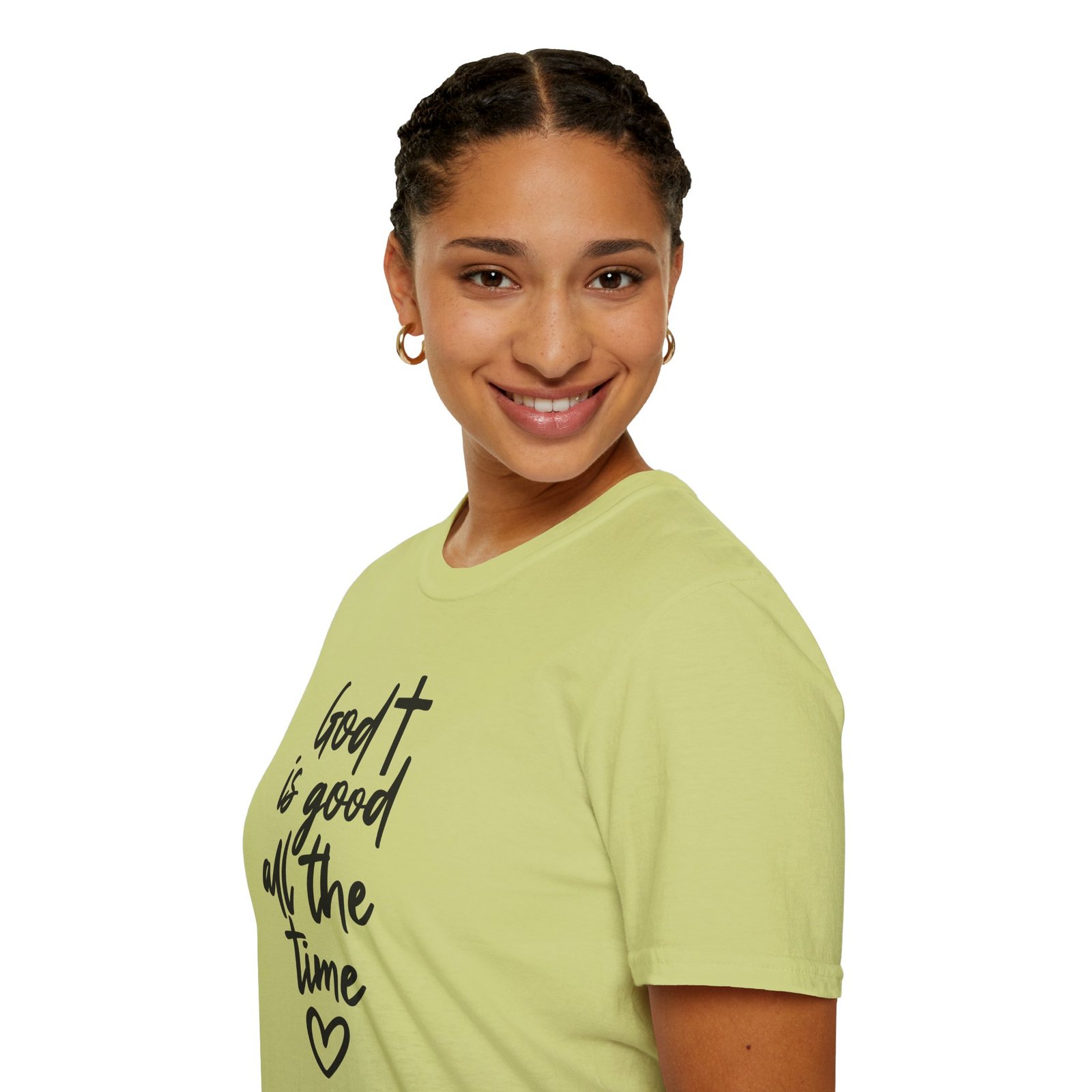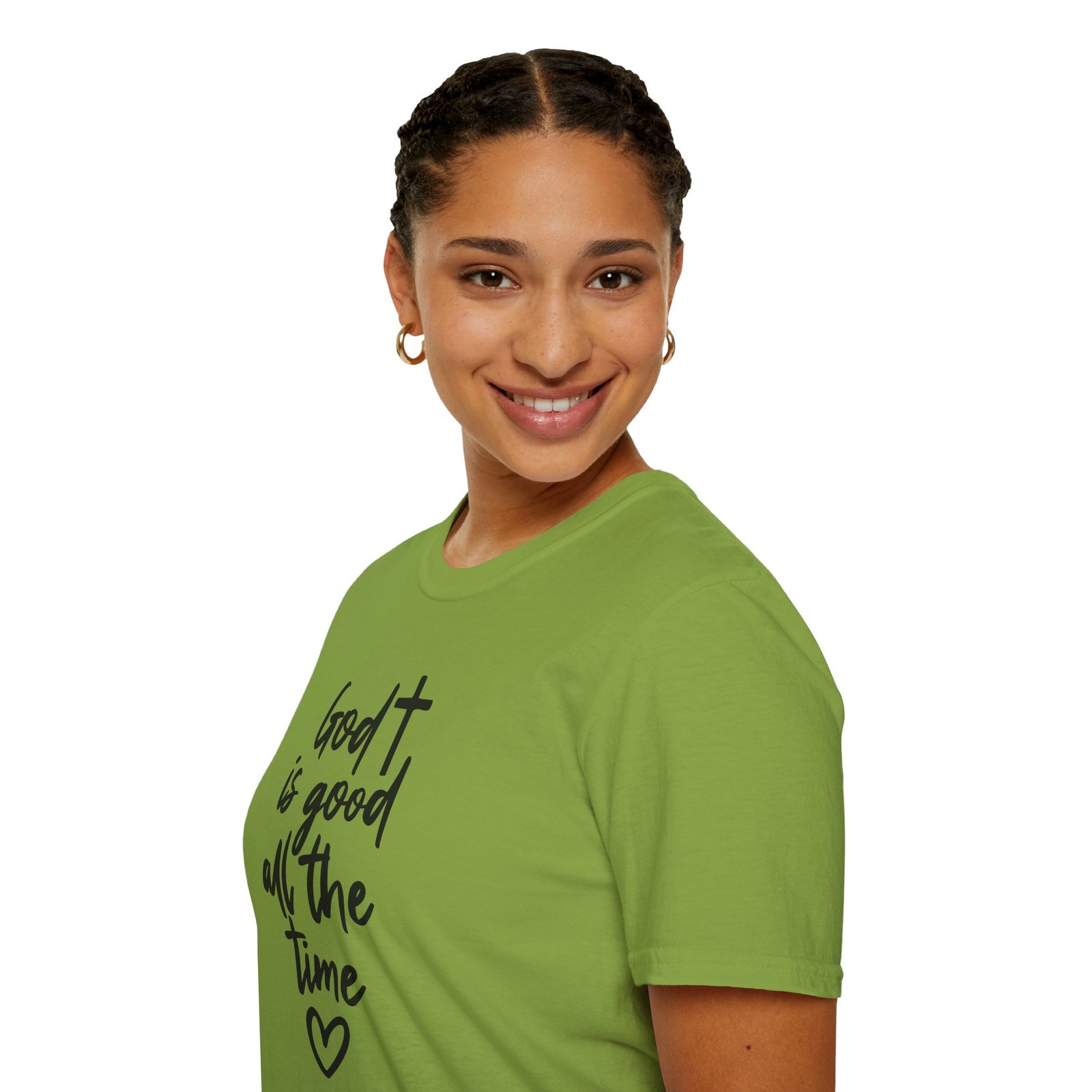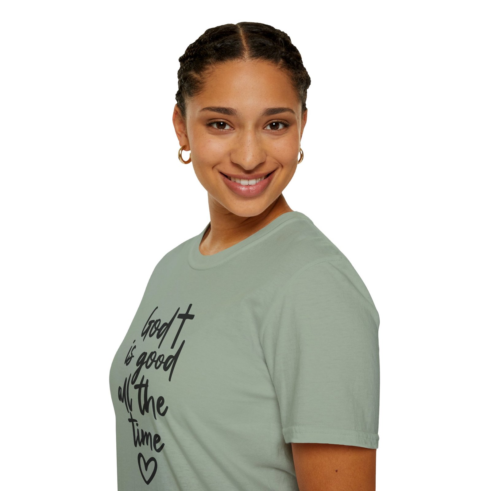 A lightweight, soft cotton tee that says faith out loud with quiet confidence. The hand-lettered message “God is good all the time” flows down the front in casual black script, finished with a small heart that keeps the sentiment warm and personal. It wears like your favorite go-to shirt — breathable, smooth, and easy to layer under a cardigan or over a pair of denim. The clean white canvas makes the lettering stand out for gatherings, church events, or everyday moments when you want your faith to be seen without shouting. Comfortable enough for long Sundays, dependable enough for volunteer days, and simple enough to pair with sneakers or flats.