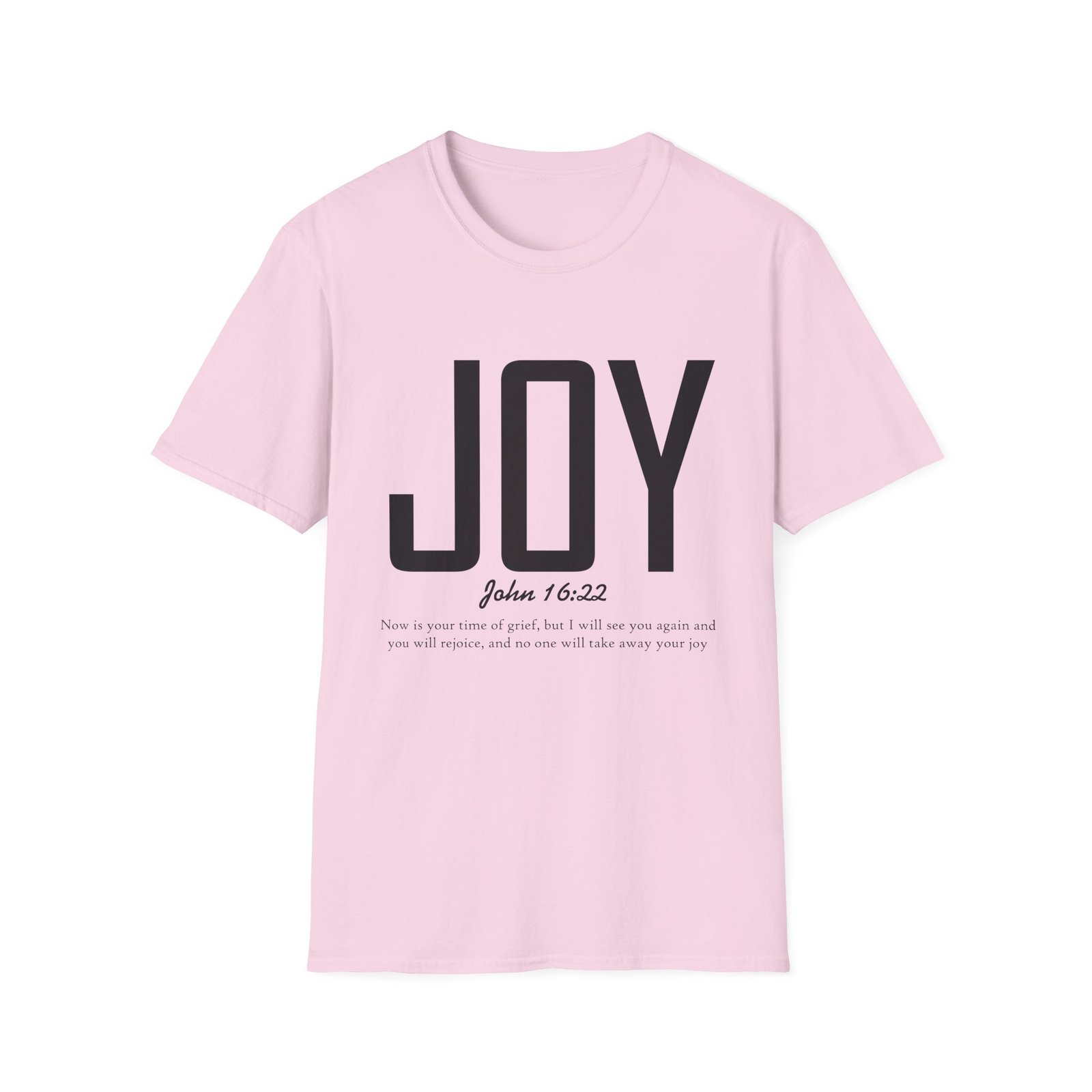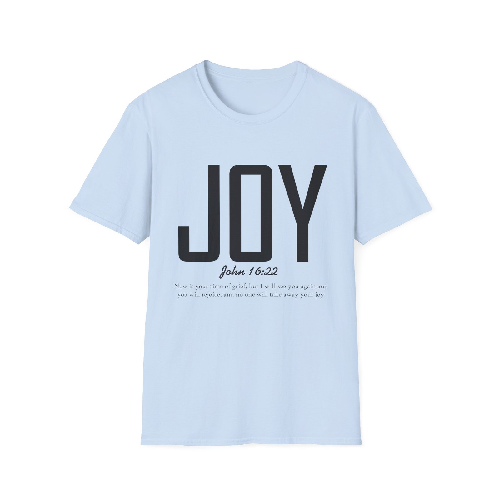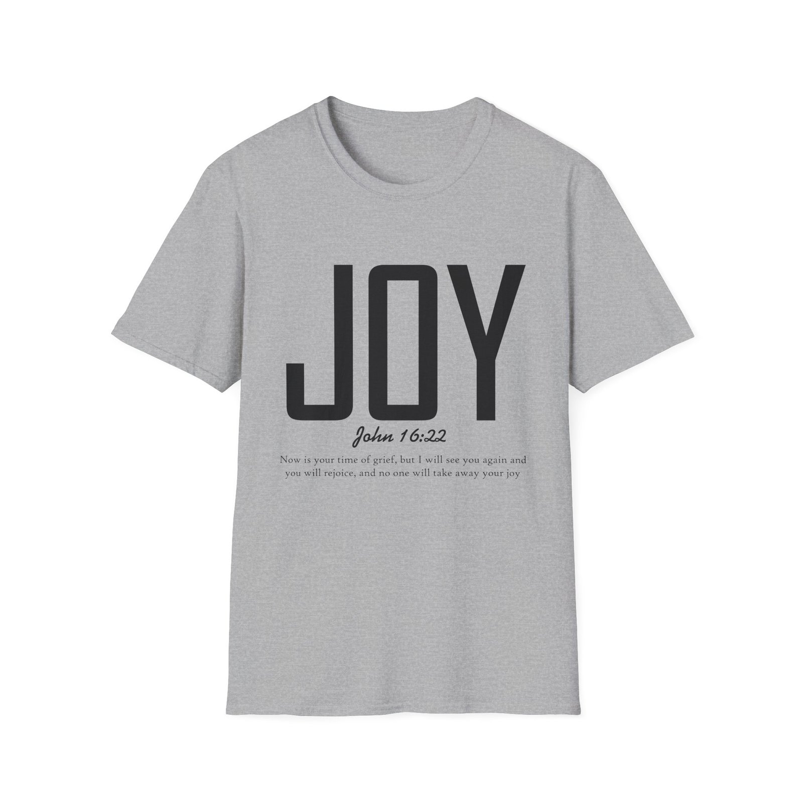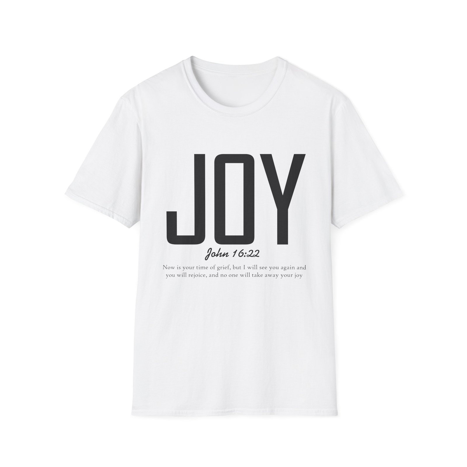Lightweight, soft, and quietly confident — this crew-neck tee carries a simple, modern message: JOY. Big, clean lettering with a subtle scripture reference (John 16:22) sits on a smooth white canvas, letting the design breathe. The fabric feels breathable and gentle against skin, so it moves easily from weekend mornings to church gatherings or volunteer days. Wear it layered under a jacket or on its own; it’s for people who prefer calm, meaningful style over noise. The shirt’s understated look invites conversation without shouting, offering a small, wearable reminder of hope and gratitude.