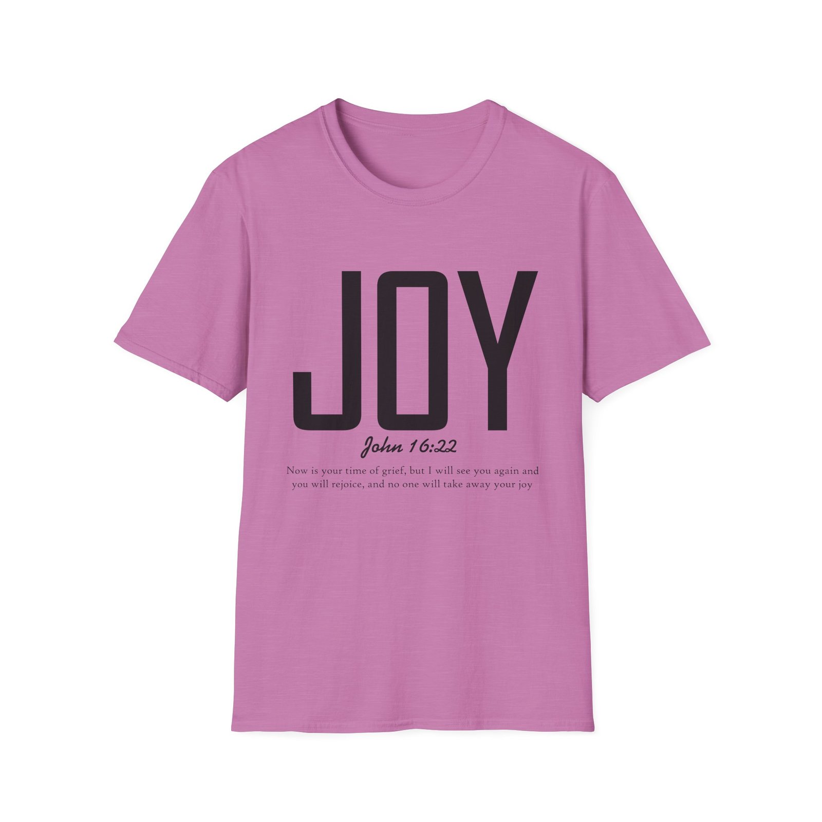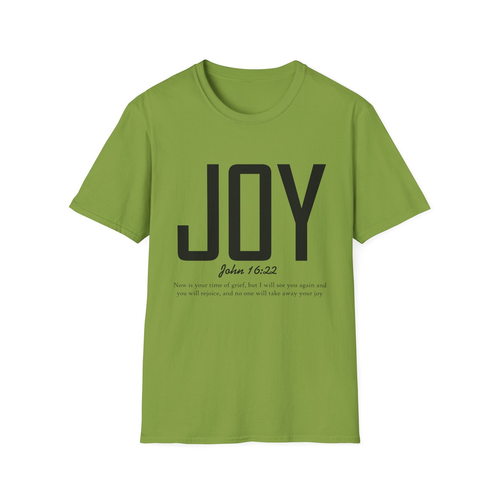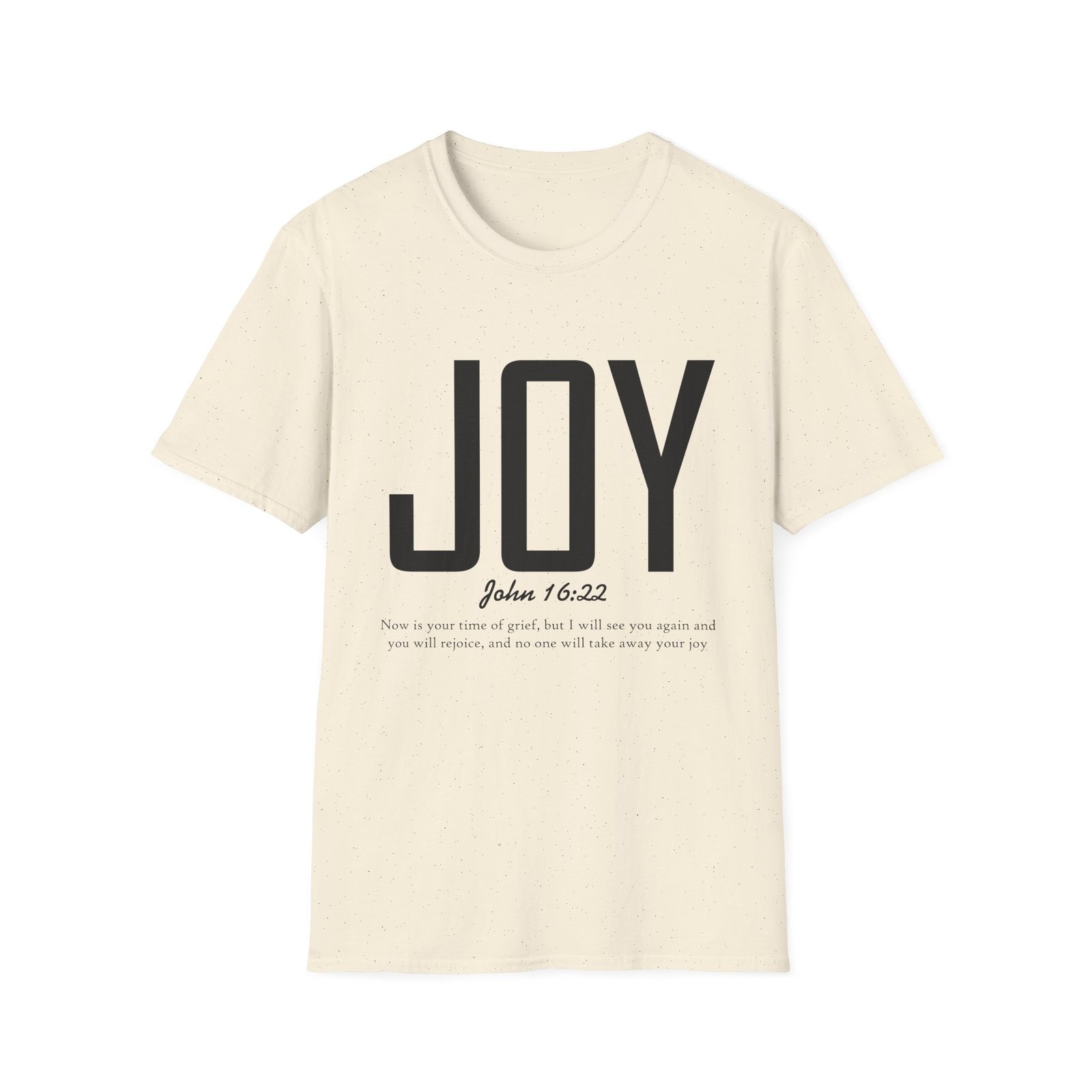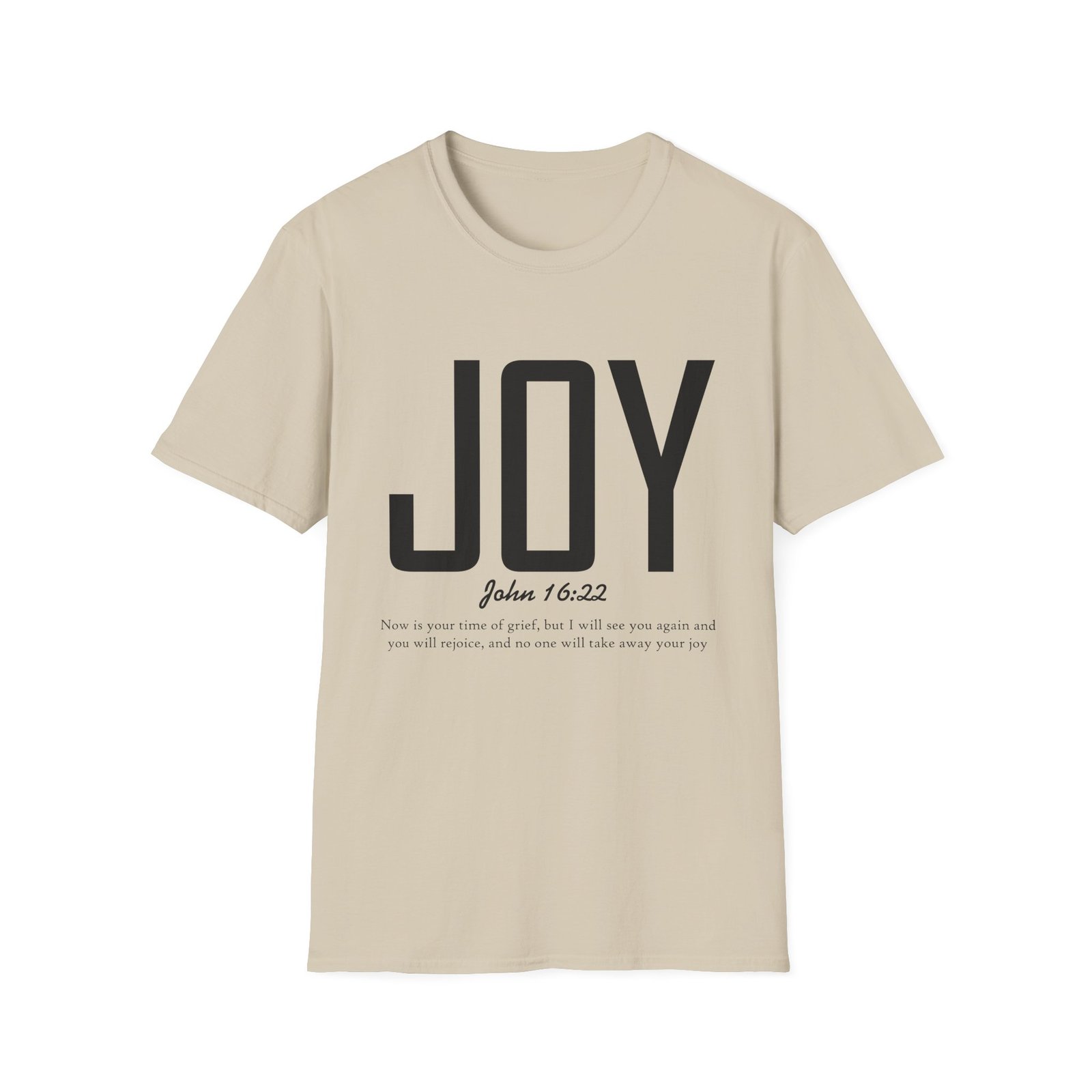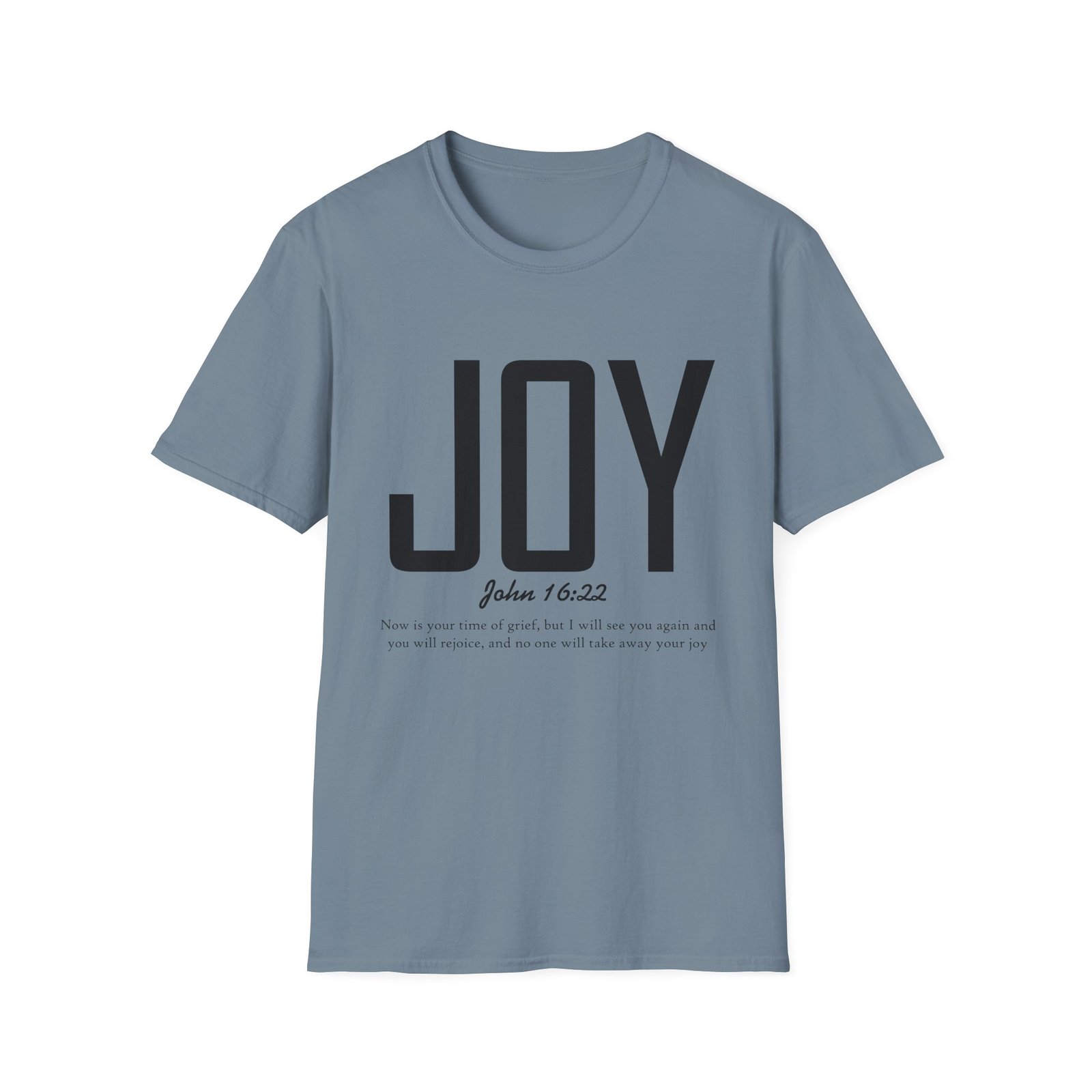 Lightweight, soft, and quietly confident — this crew-neck tee carries a simple, modern message: JOY. Big, clean lettering with a subtle scripture reference (John 16:22) sits on a smooth white canvas, letting the design breathe. The fabric feels breathable and gentle against skin, so it moves easily from weekend mornings to church gatherings or volunteer days. Wear it layered under a jacket or on its own; it’s for people who prefer calm, meaningful style over noise. The shirt’s understated look invites conversation without shouting, offering a small, wearable reminder of hope and gratitude.