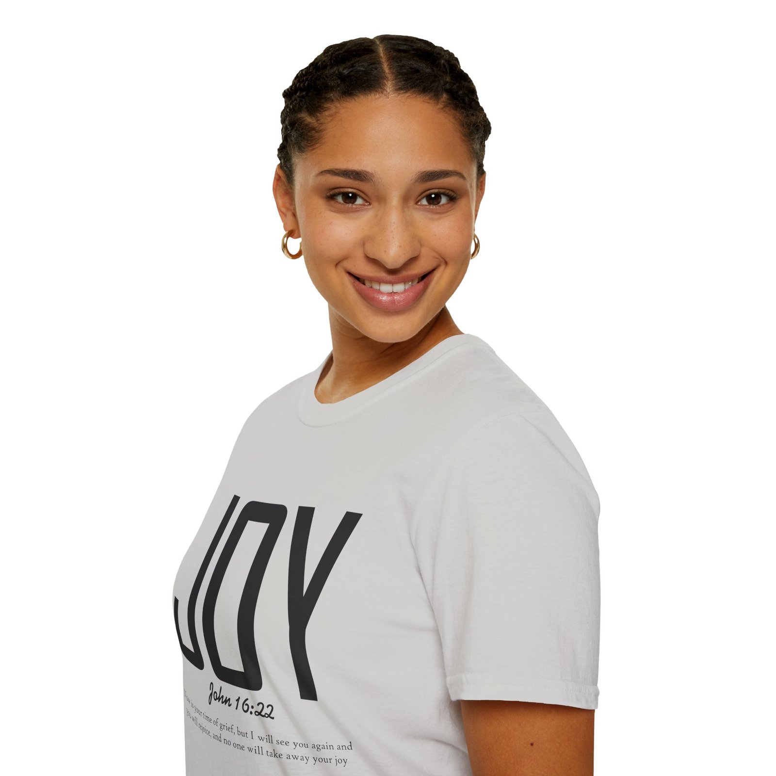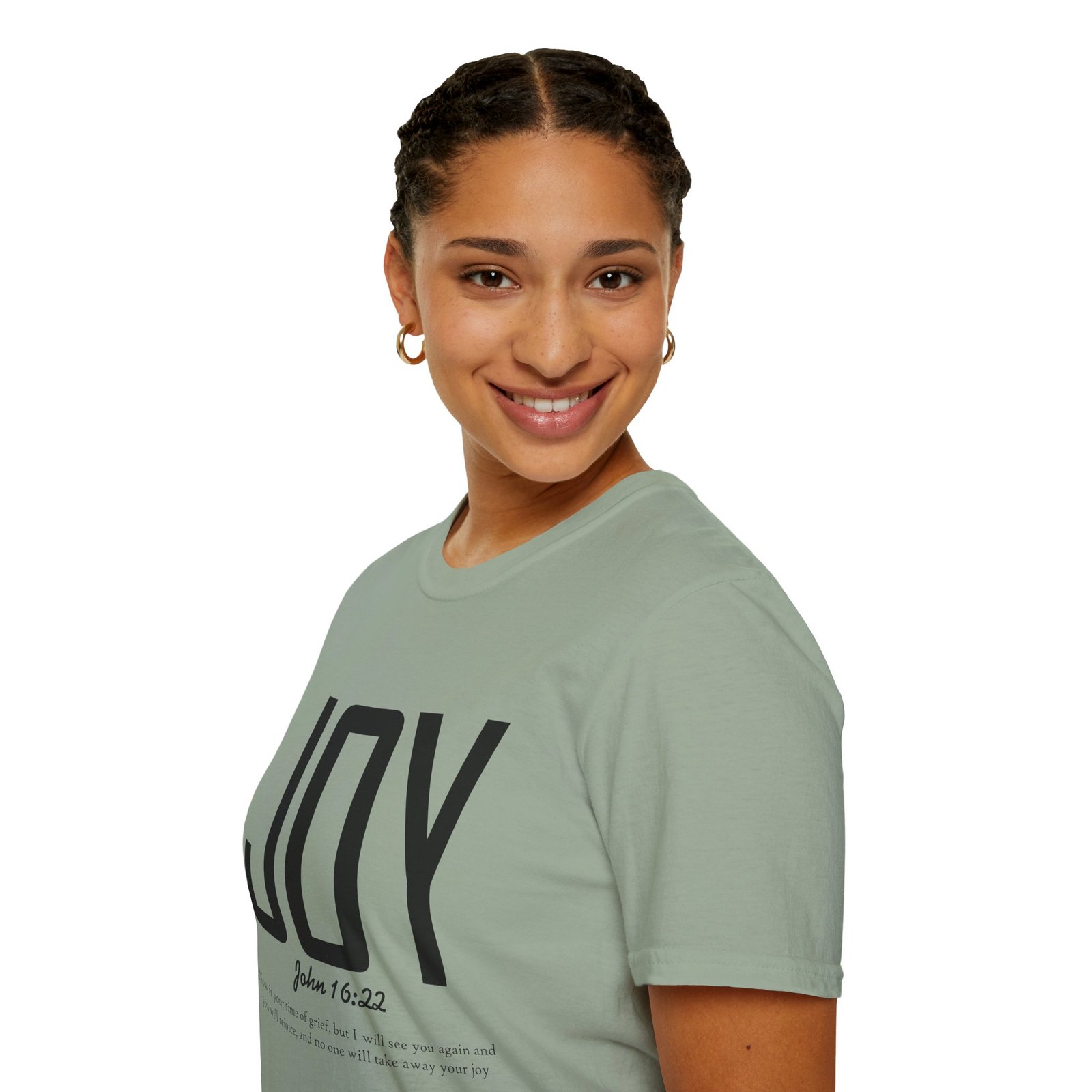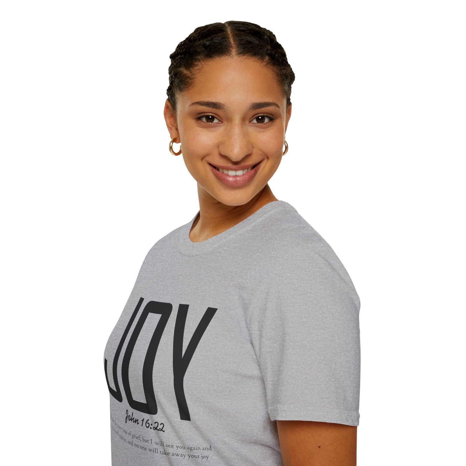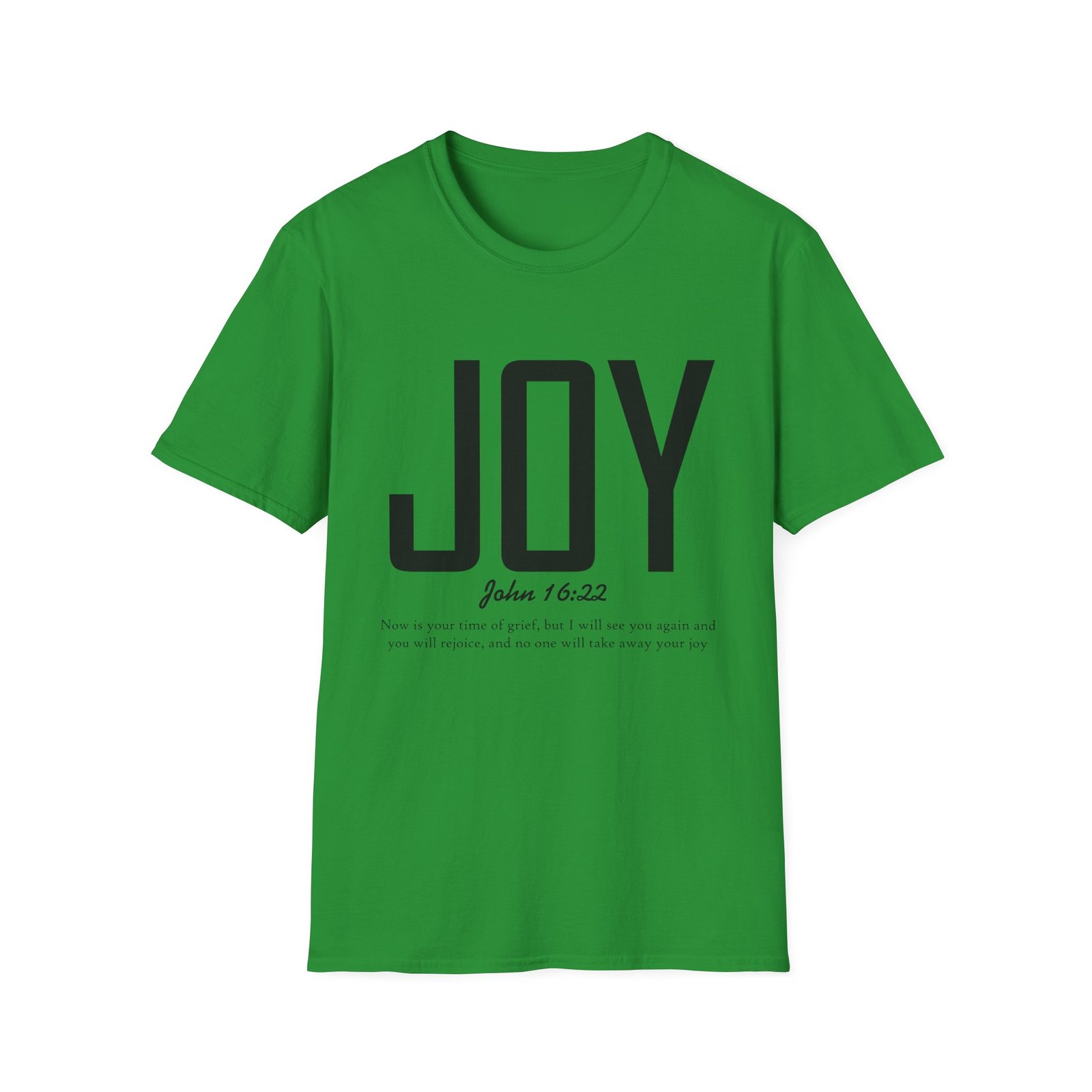Lightweight, soft, and quietly confident — this crew-neck tee carries a simple, modern message: JOY. Big, clean lettering with a subtle scripture reference (John 16:22) sits on a smooth white canvas, letting the design breathe. The fabric feels breathable and gentle against skin, so it moves easily from weekend mornings to church gatherings or volunteer days. Wear it layered under a jacket or on its own; it’s for people who prefer calm, meaningful style over noise. The shirt’s understated look invites conversation without shouting, offering a small, wearable reminder of hope and gratitude.