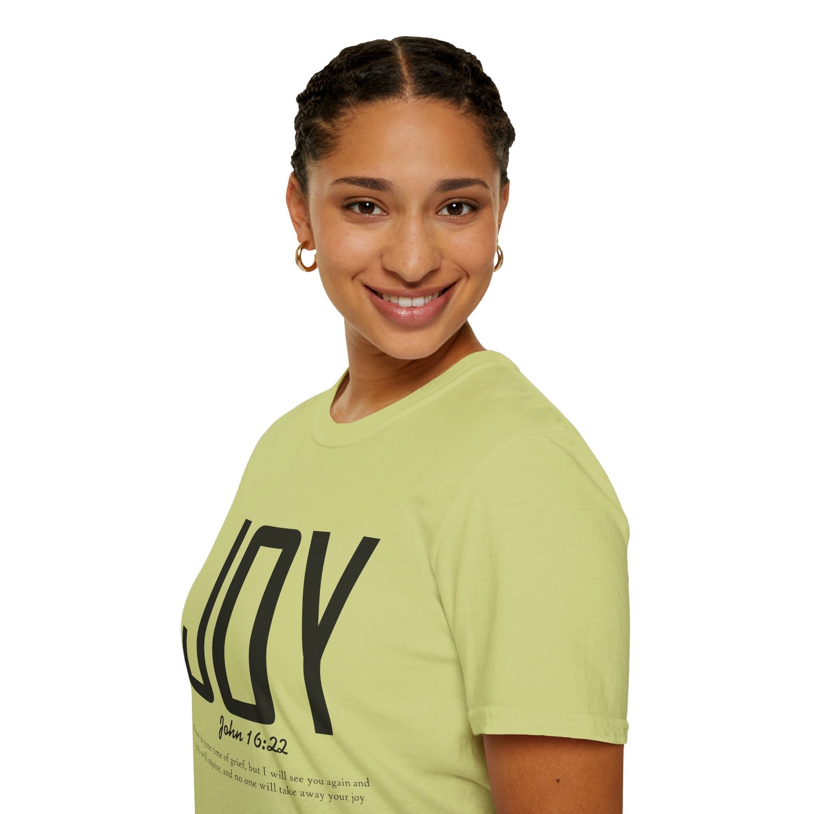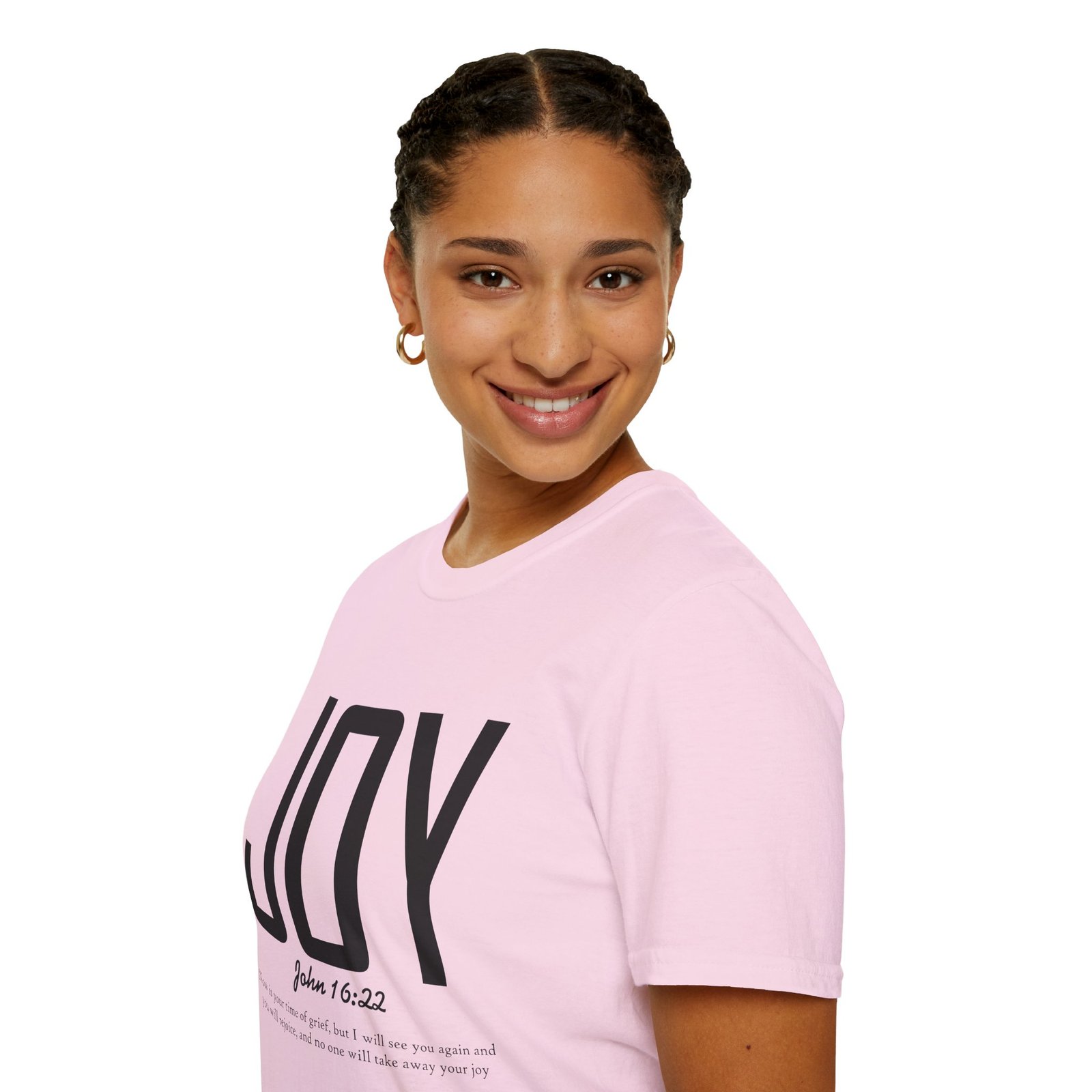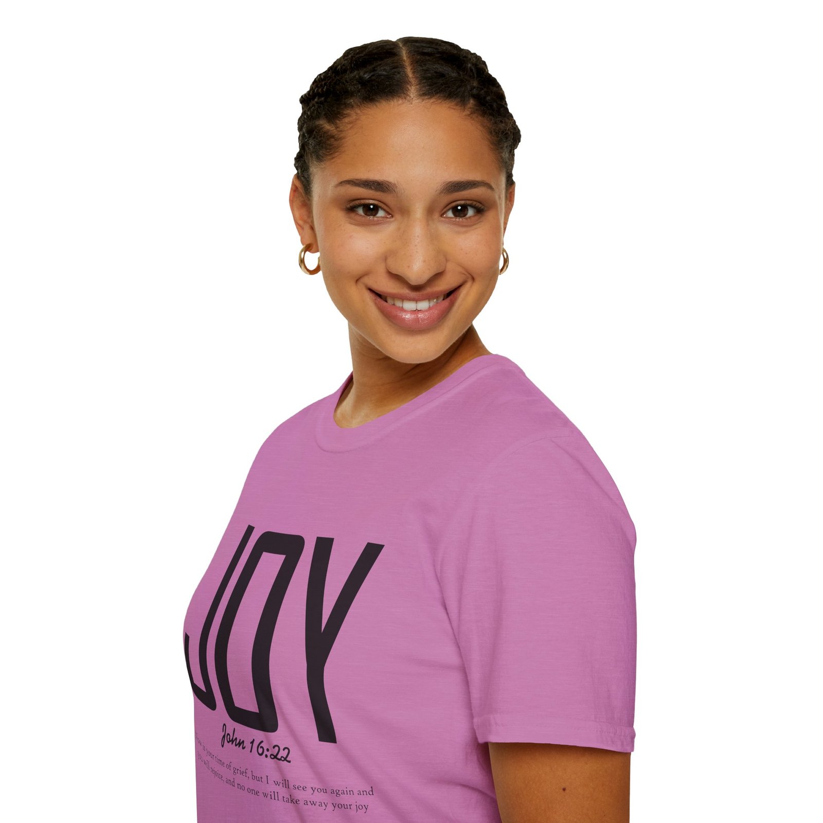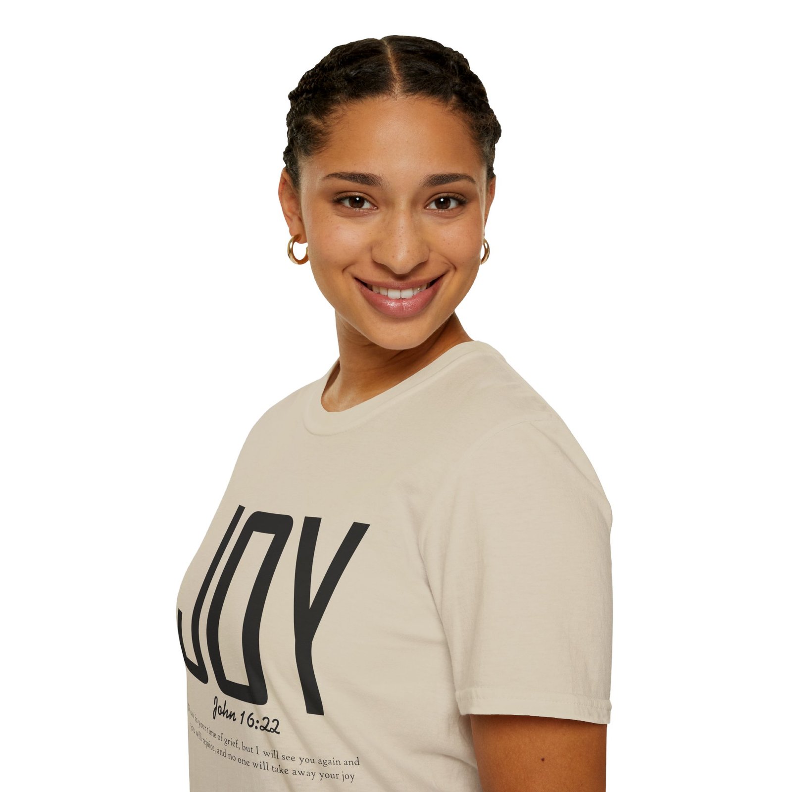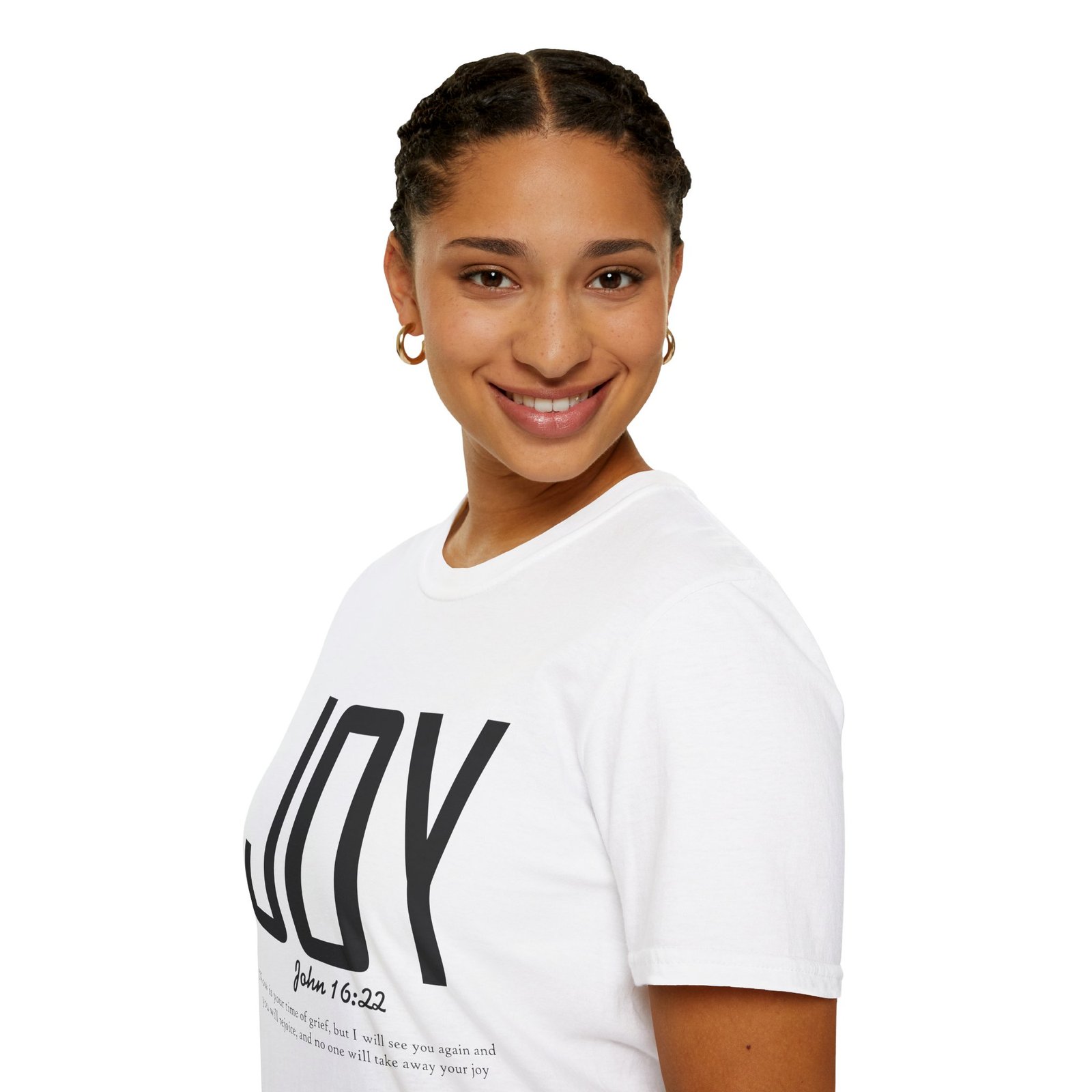 Lightweight, soft, and quietly confident — this crew-neck tee carries a simple, modern message: JOY. Big, clean lettering with a subtle scripture reference (John 16:22) sits on a smooth white canvas, letting the design breathe. The fabric feels breathable and gentle against skin, so it moves easily from weekend mornings to church gatherings or volunteer days. Wear it layered under a jacket or on its own; it’s for people who prefer calm, meaningful style over noise. The shirt’s understated look invites conversation without shouting, offering a small, wearable reminder of hope and gratitude.