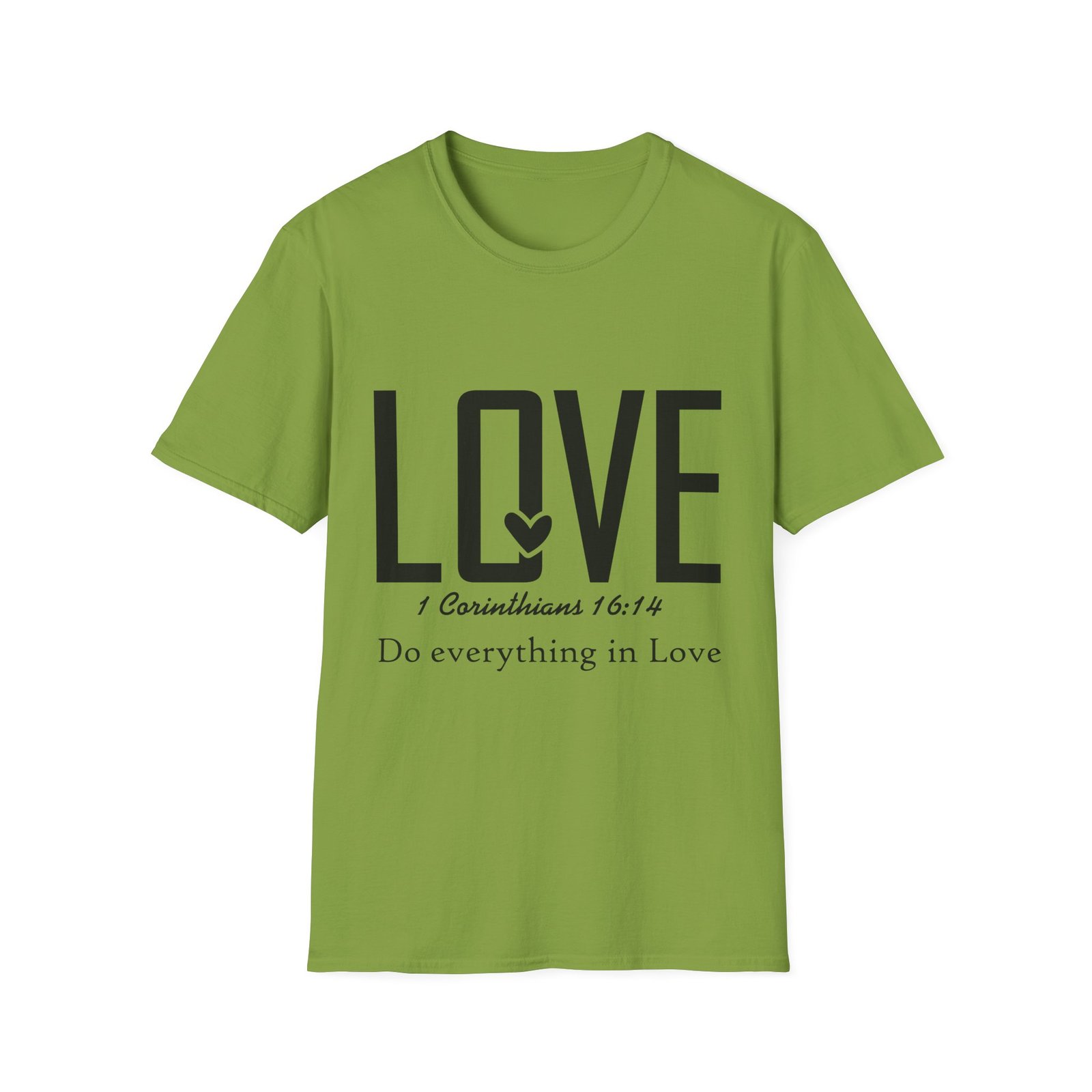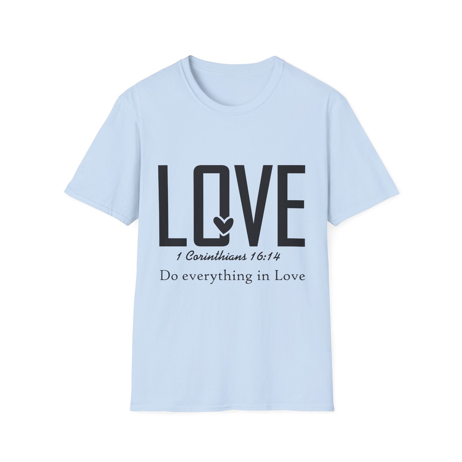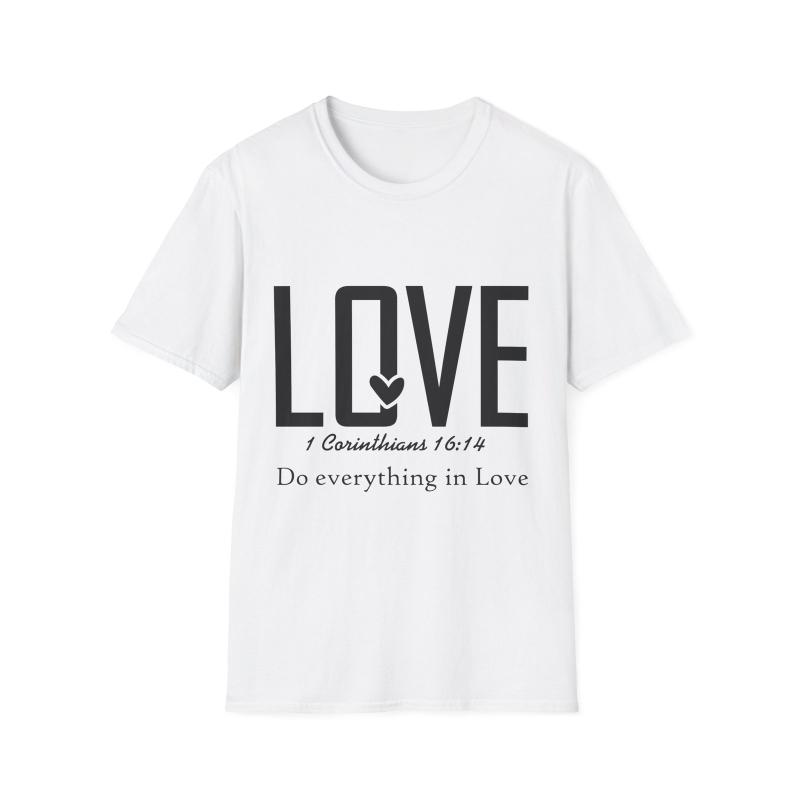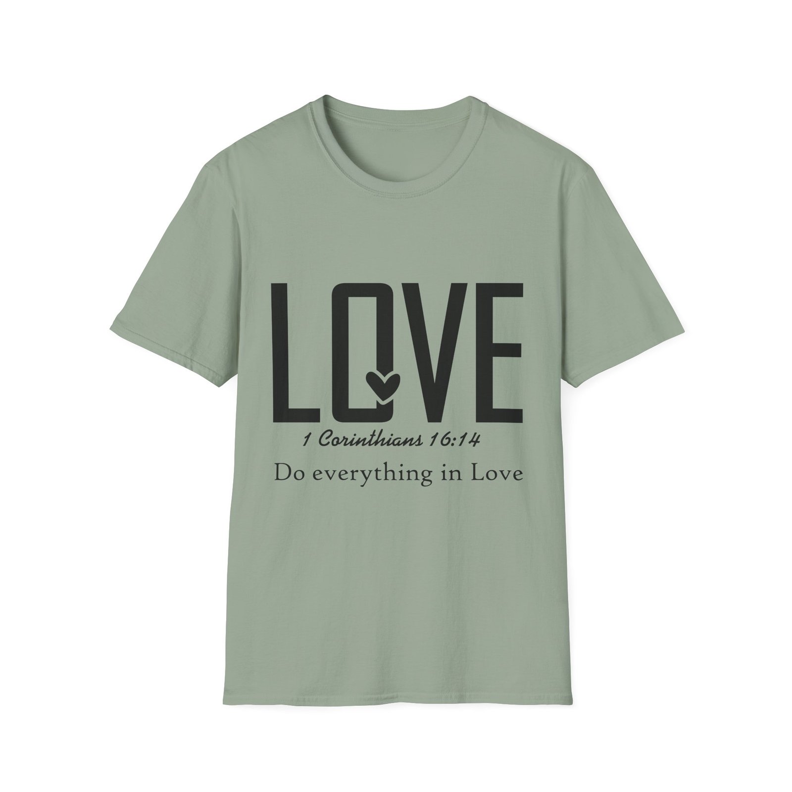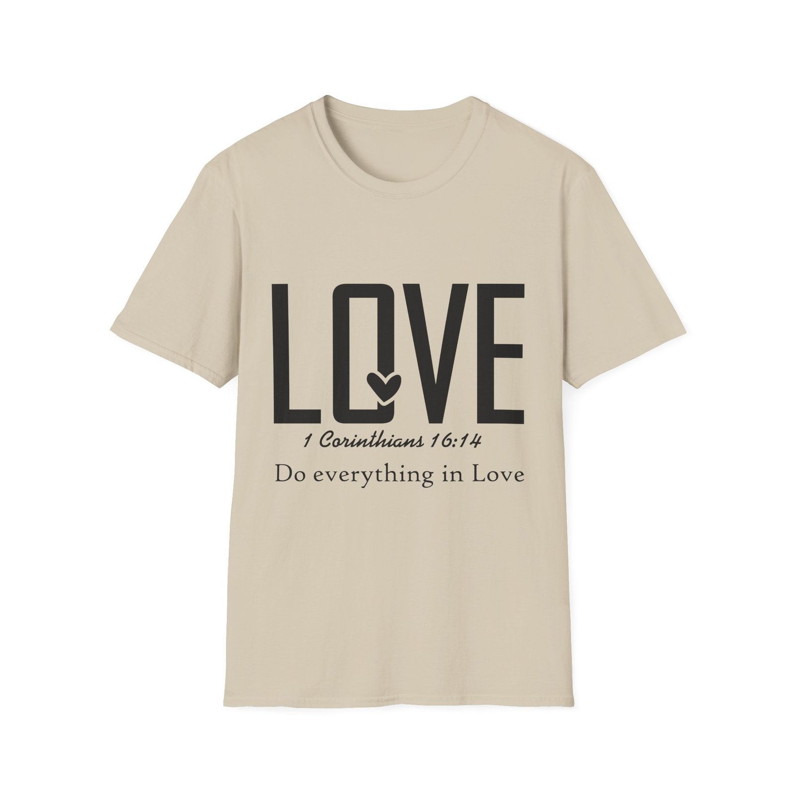 This lightweight tee carries a quiet, faith-forward message: a bold “LOVE” block with a small heart and the script of 1 Corinthians 16:14 beneath — “Do everything in Love.” It wears like a lived-in favorite: soft, breathable, and low-profile so the message can speak without shouting. Slip it on for volunteer days, casual church gatherings, or slow Sunday mornings. The clean crew neckline and classic fit layer easily under a cardigan or over a pair of jeans, becoming a gentle reminder to lead with kindness in everyday moments.