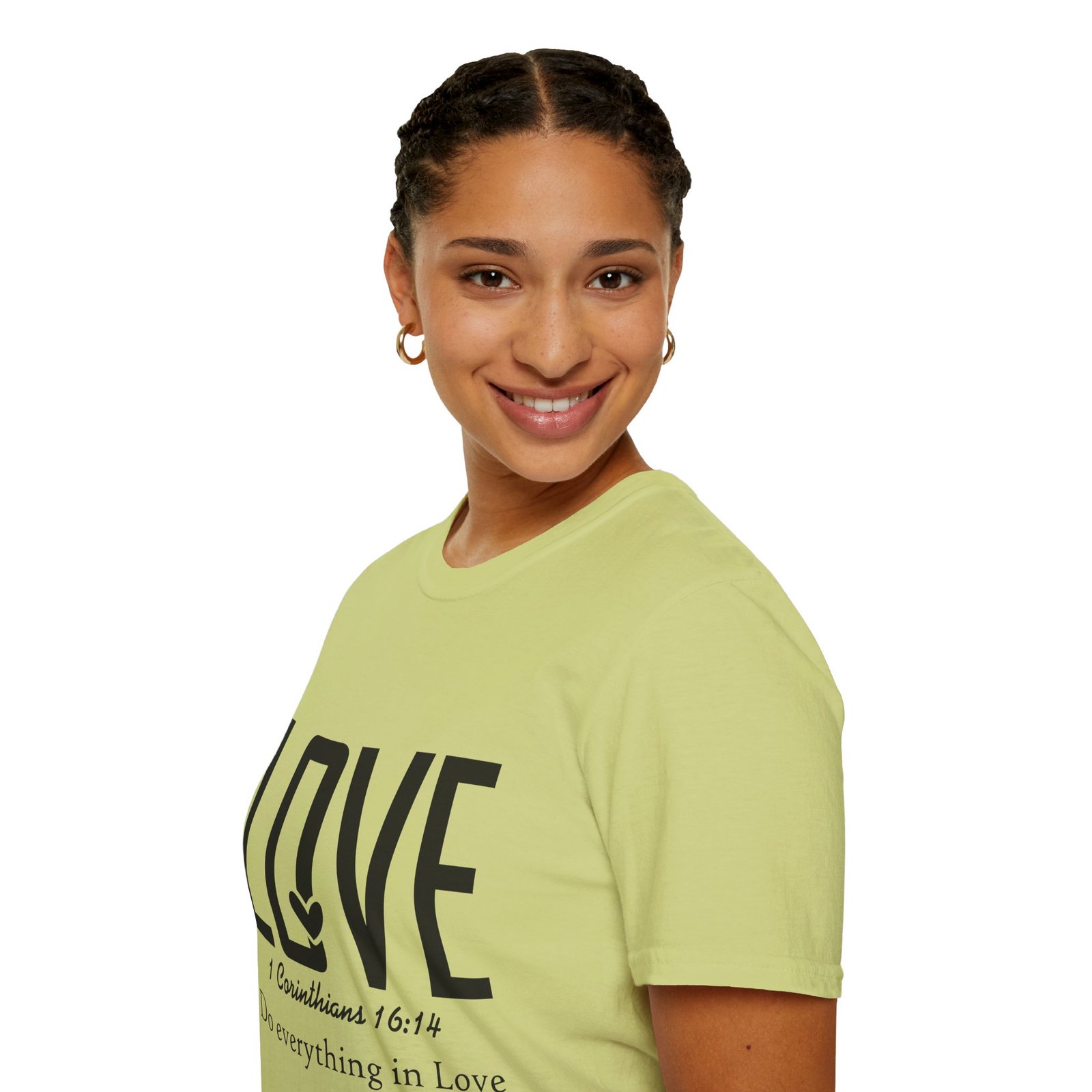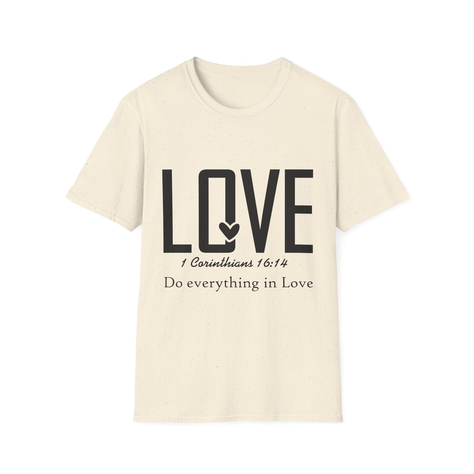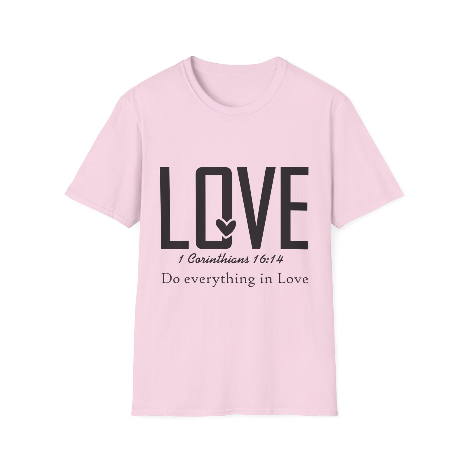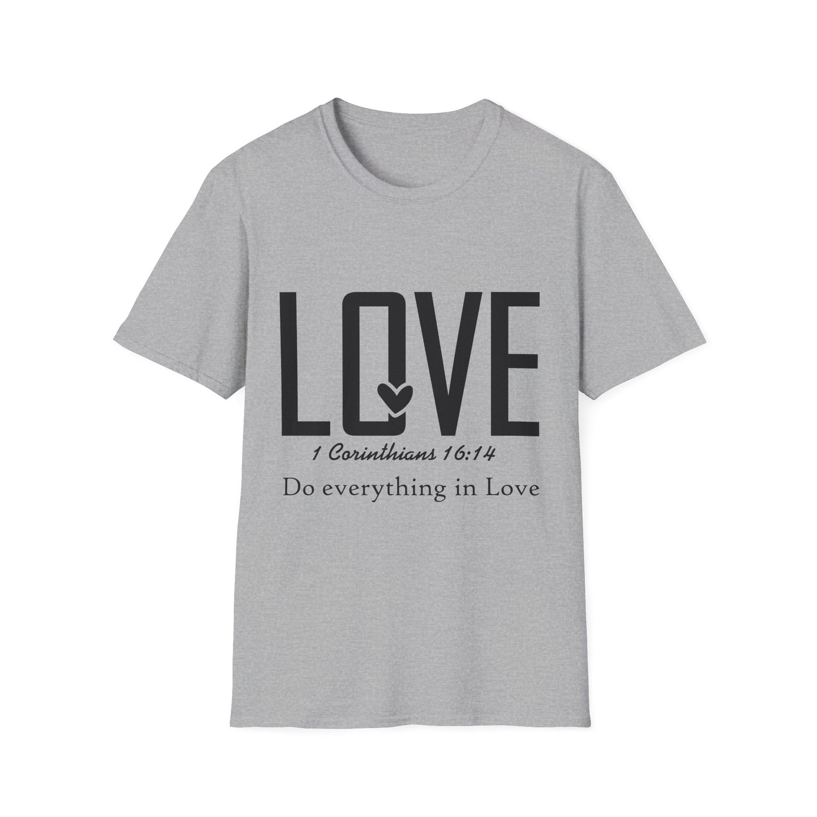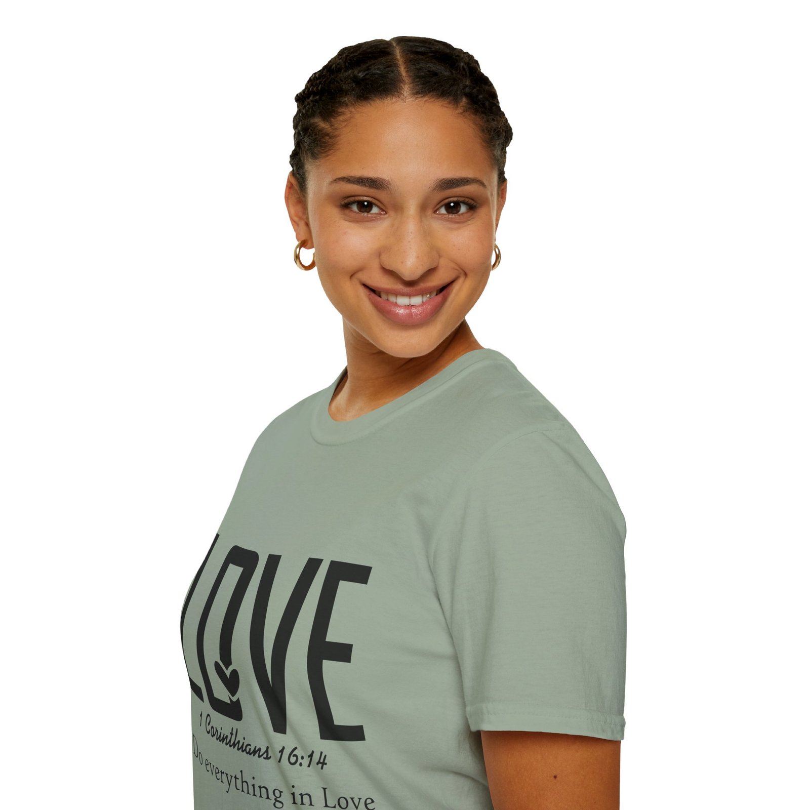 This lightweight tee carries a quiet, faith-forward message: a bold “LOVE” block with a small heart and the script of 1 Corinthians 16:14 beneath — “Do everything in Love.” It wears like a lived-in favorite: soft, breathable, and low-profile so the message can speak without shouting. Slip it on for volunteer days, casual church gatherings, or slow Sunday mornings. The clean crew neckline and classic fit layer easily under a cardigan or over a pair of jeans, becoming a gentle reminder to lead with kindness in everyday moments.