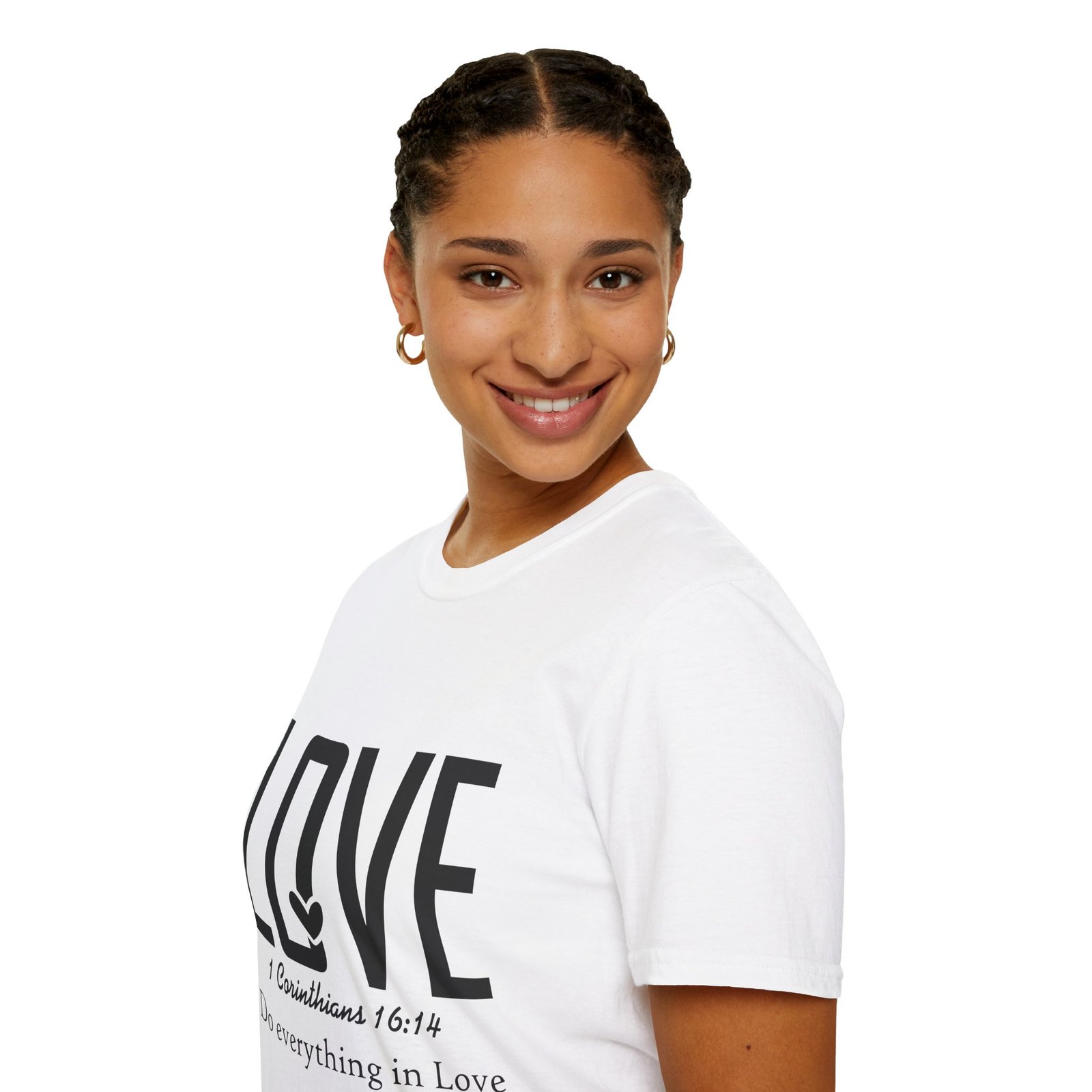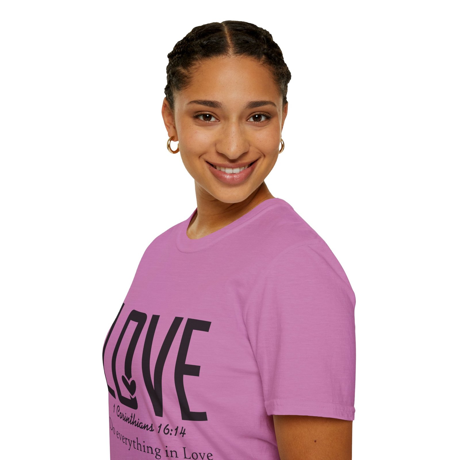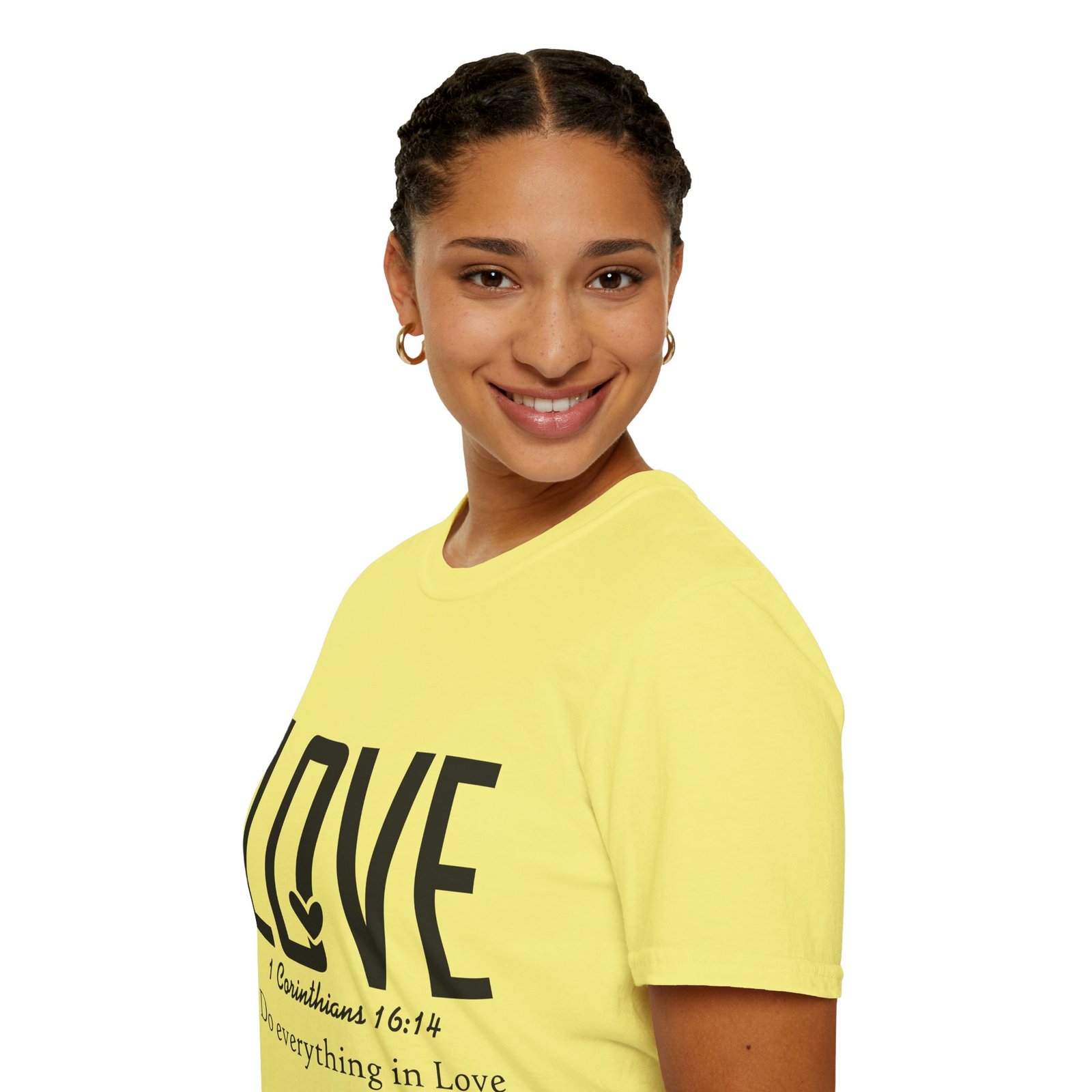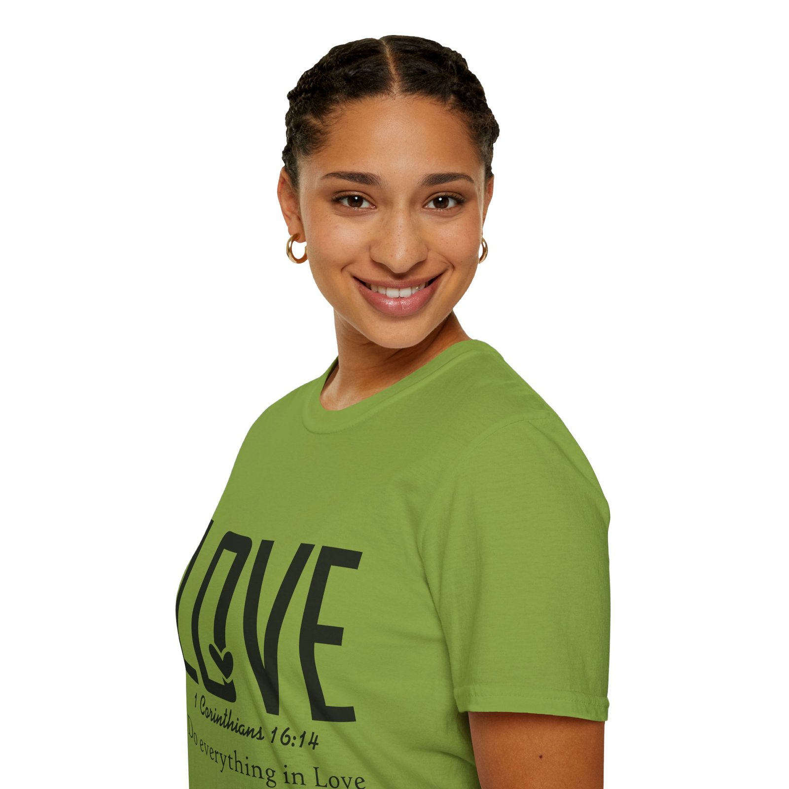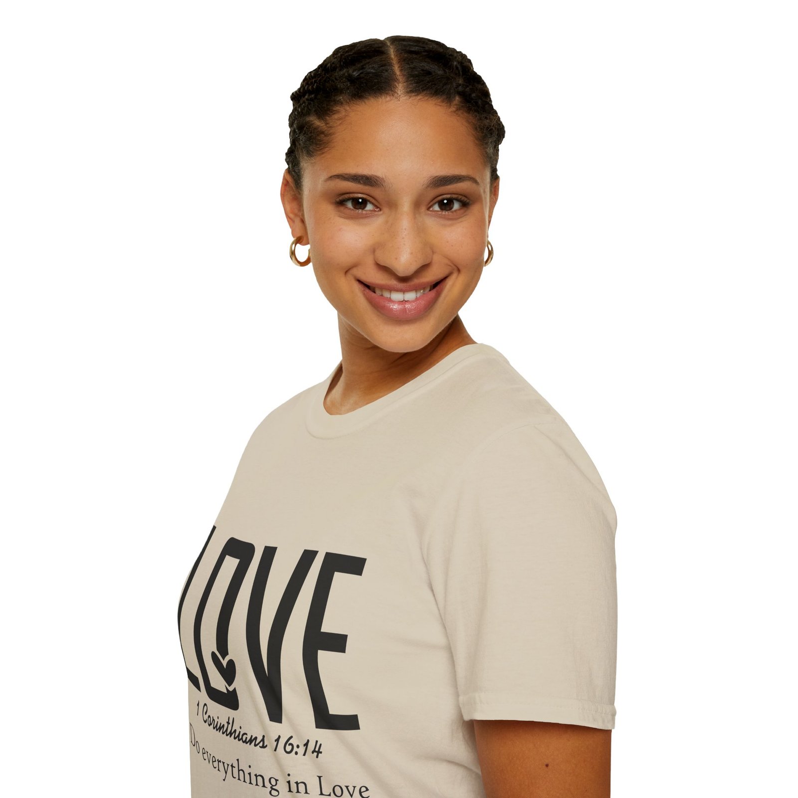 This lightweight tee carries a quiet, faith-forward message: a bold “LOVE” block with a small heart and the script of 1 Corinthians 16:14 beneath — “Do everything in Love.” It wears like a lived-in favorite: soft, breathable, and low-profile so the message can speak without shouting. Slip it on for volunteer days, casual church gatherings, or slow Sunday mornings. The clean crew neckline and classic fit layer easily under a cardigan or over a pair of jeans, becoming a gentle reminder to lead with kindness in everyday moments.
