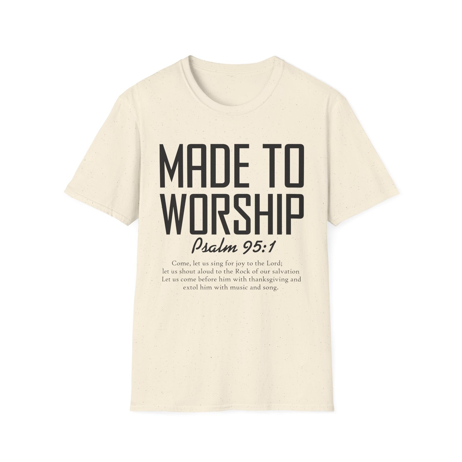 A lightweight, breathable tee designed for quiet confidence and daily devotion. This soft cotton shirt carries a simple, bold front message—Made to Worship—paired with Psalm 95:1 text beneath, creating a wearable reminder of faith that reads clearly without shouting. The classic crew neckline and clean, tubular knit keep the silhouette tidy and comfortable; shoulder tape and a ribbed collar hold shape through repeated wear. It layers easily under jackets or wears alone for worship nights, casual gatherings, or slow mornings with scripture. The subtle natural flecks in the unprocessed color add a lived-in, honest look that fits a humble, worshipful style.
