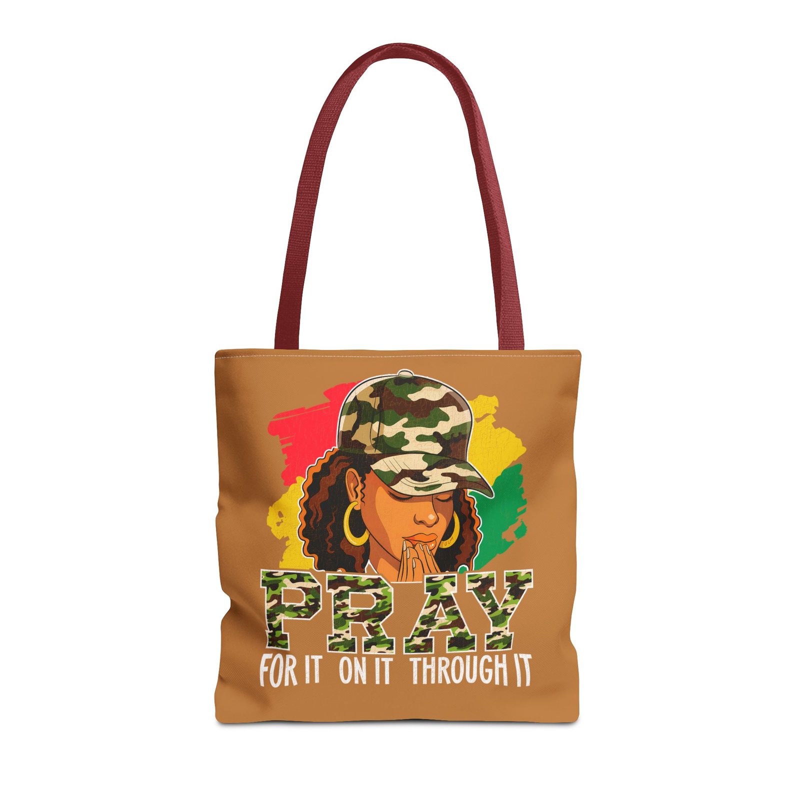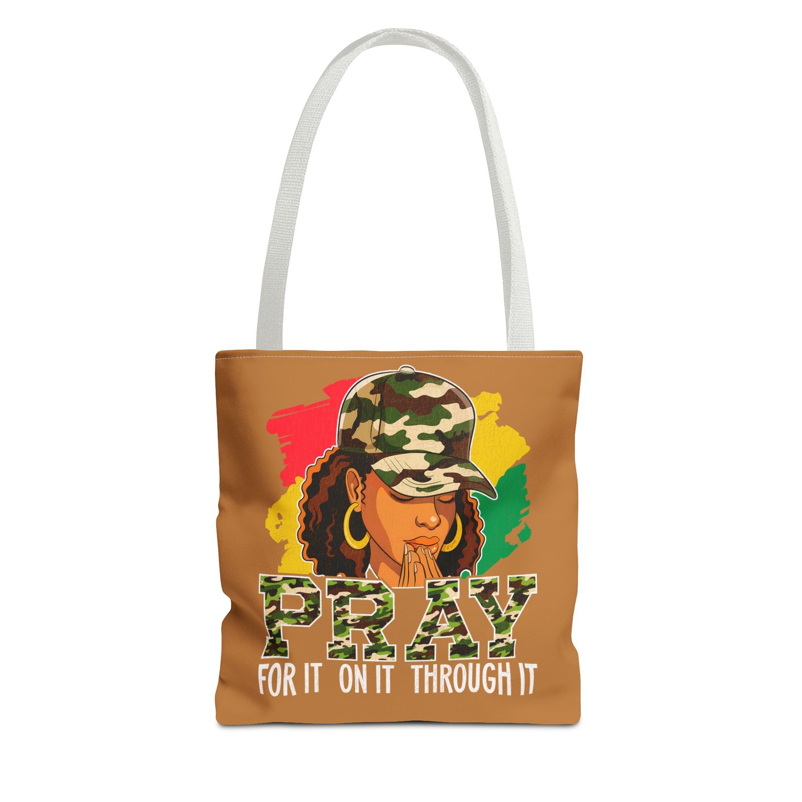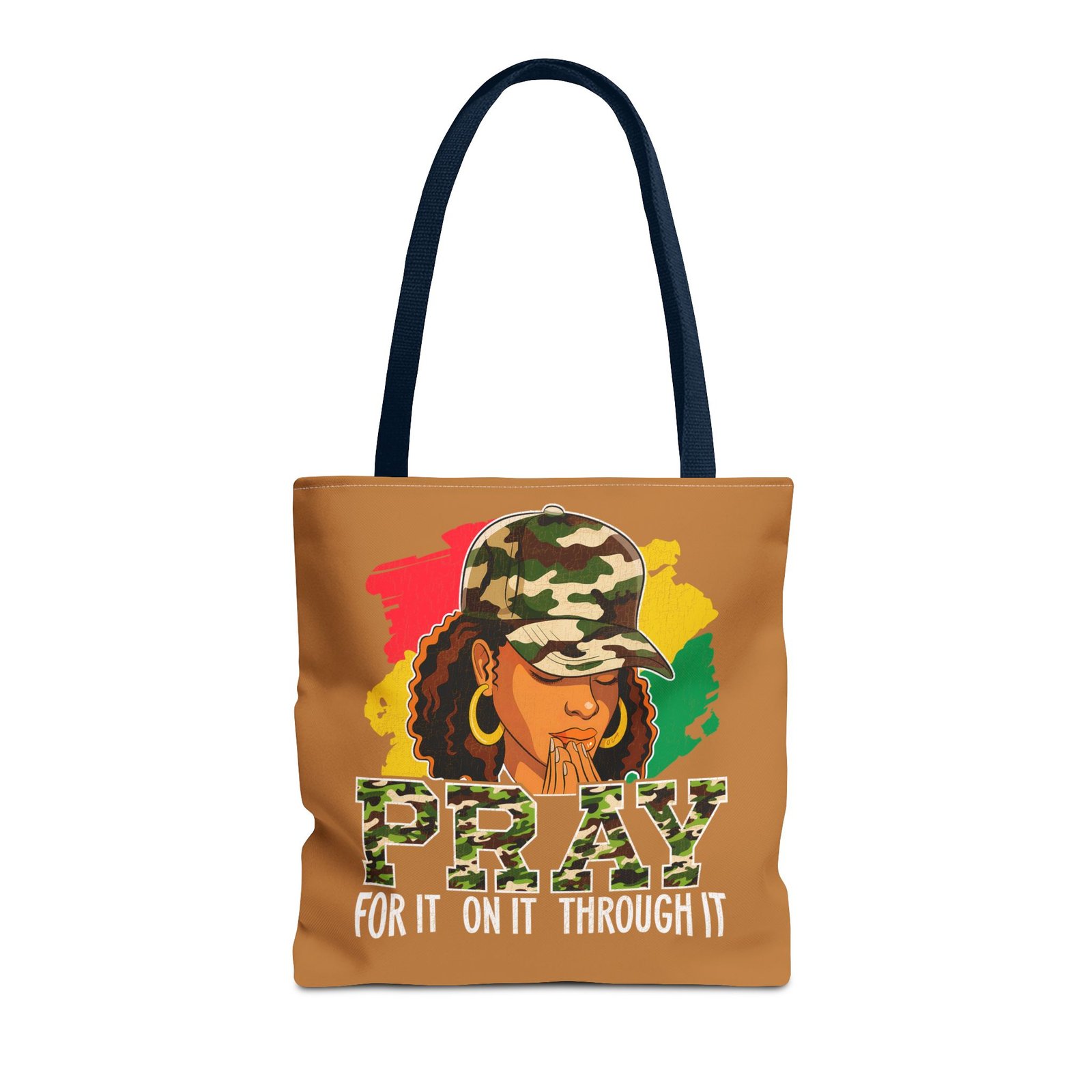 This roomy, art-forward tote brings quiet strength to everyday carry. Printed all-over on a durable polyester canvas, the design shows a woman in a camo cap with hands folded in prayer against bold red, yellow and green brushstrokes — a mix of streetwise energy and tender reverence. The bag’s boxed corners and reinforced handle stitching give structure and comfort when you load it up, while the interior laminate keeps contents supported. Wear it to church socials, community events, or while running errands to carry more than groceries — carry a statement of faith, resilience, and style.