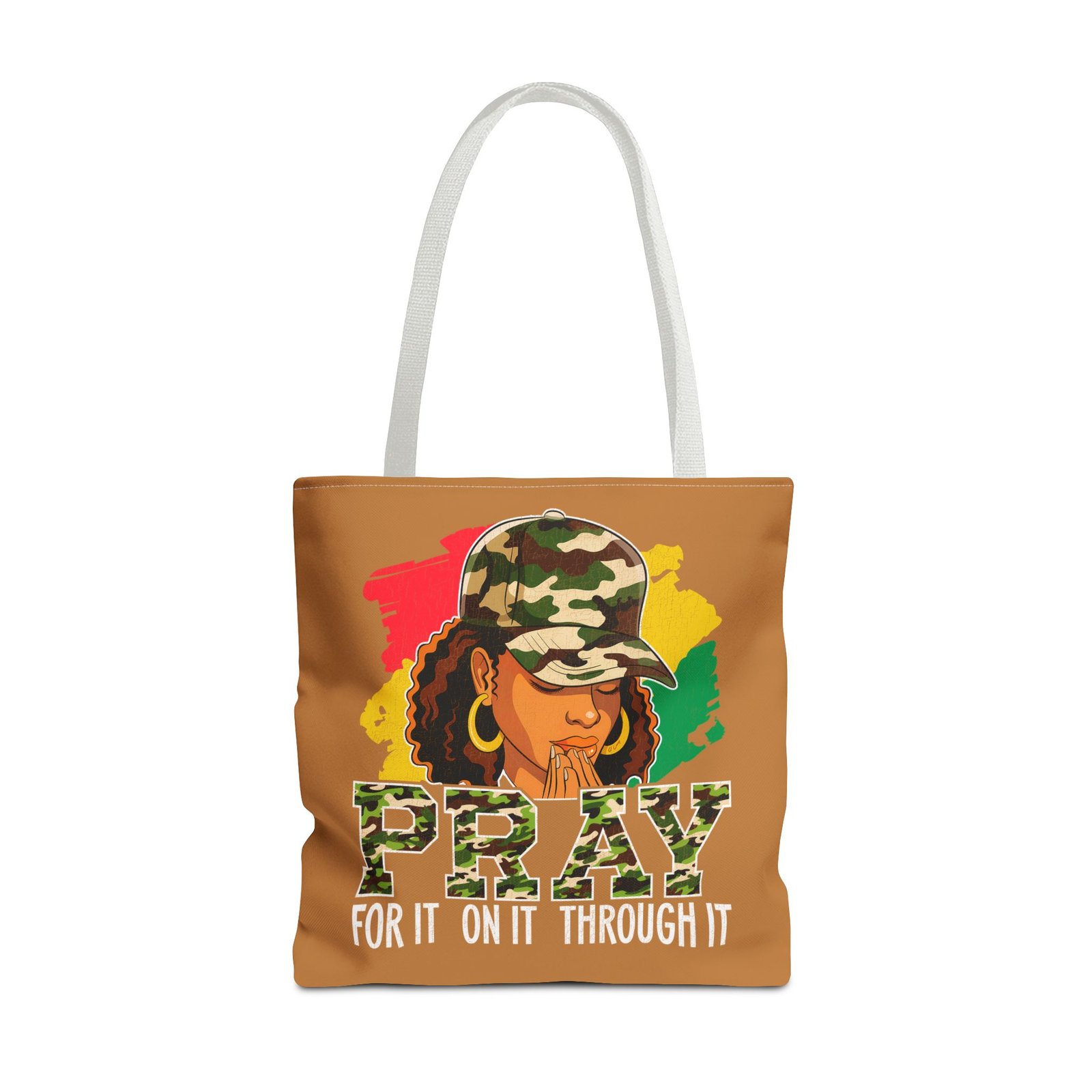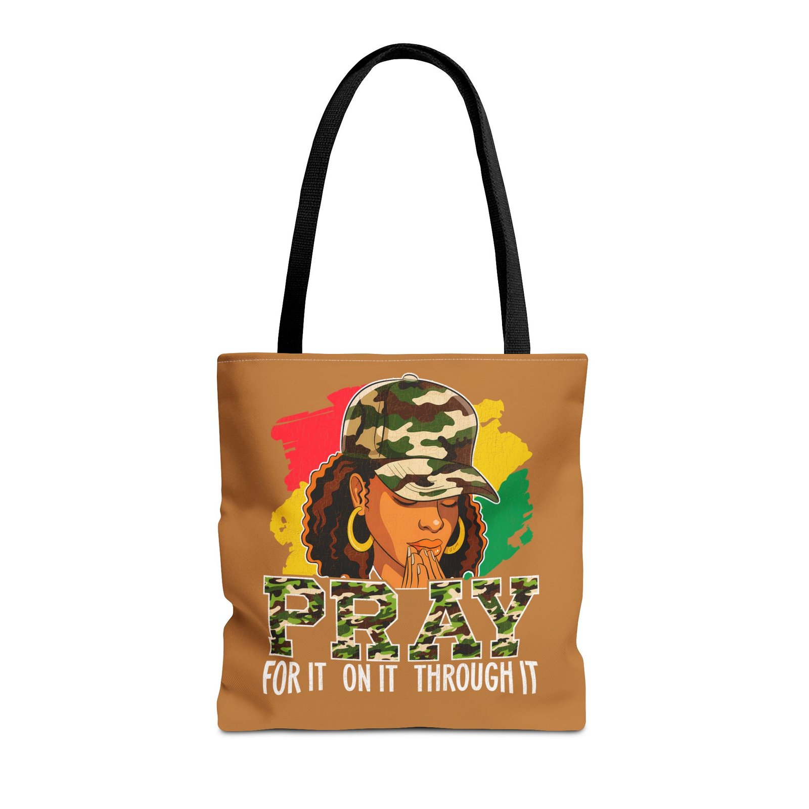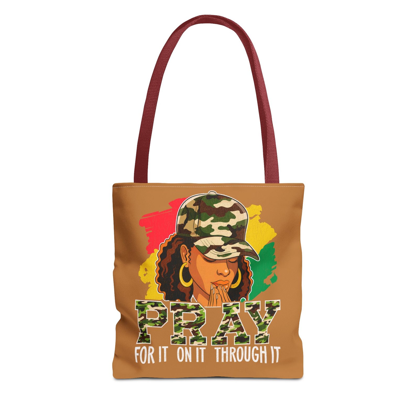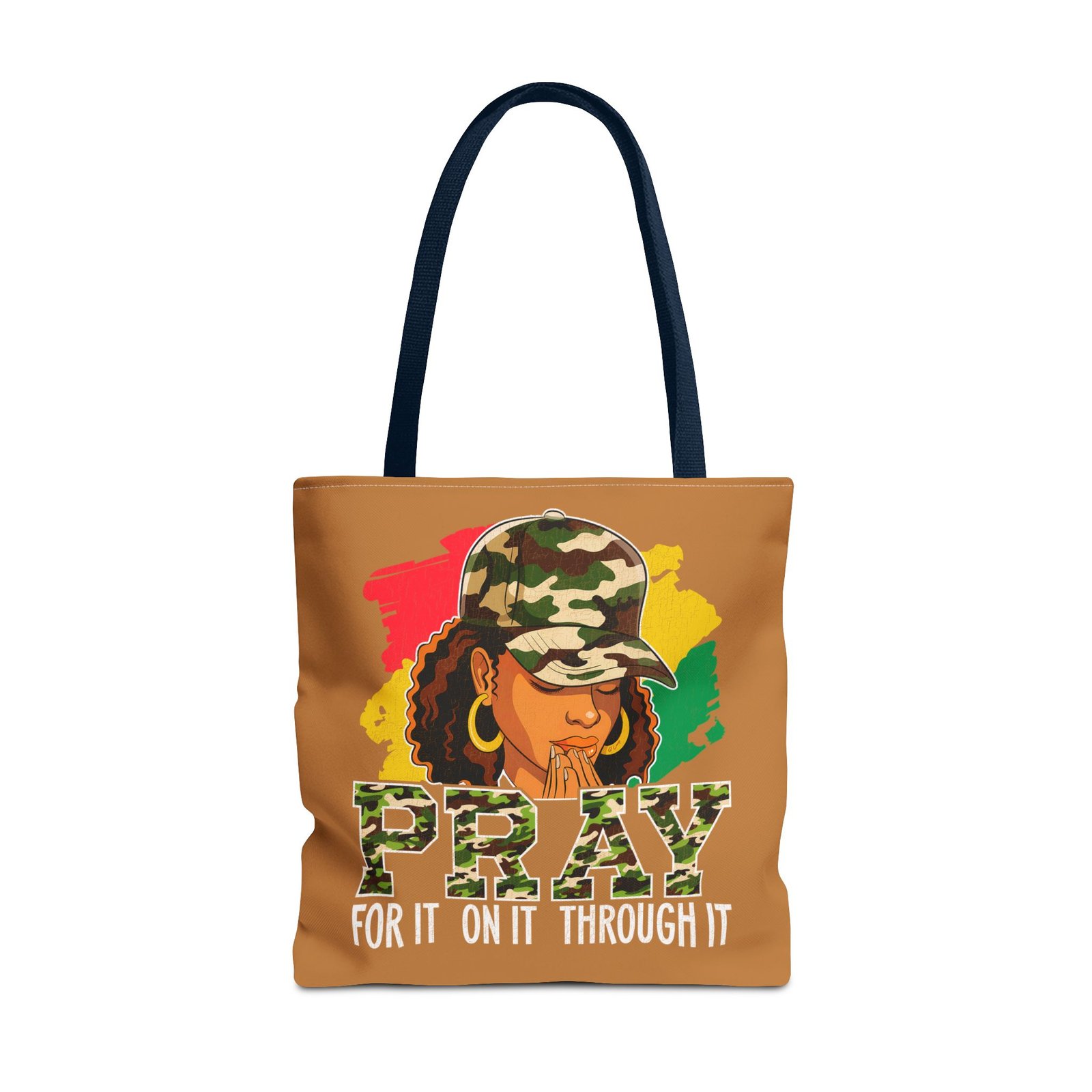 This roomy, art-forward tote brings quiet strength to everyday carry. Printed all-over on a durable polyester canvas, the design shows a woman in a camo cap with hands folded in prayer against bold red, yellow and green brushstrokes — a mix of streetwise energy and tender reverence. The bag’s boxed corners and reinforced handle stitching give structure and comfort when you load it up, while the interior laminate keeps contents supported. Wear it to church socials, community events, or while running errands to carry more than groceries — carry a statement of faith, resilience, and style.