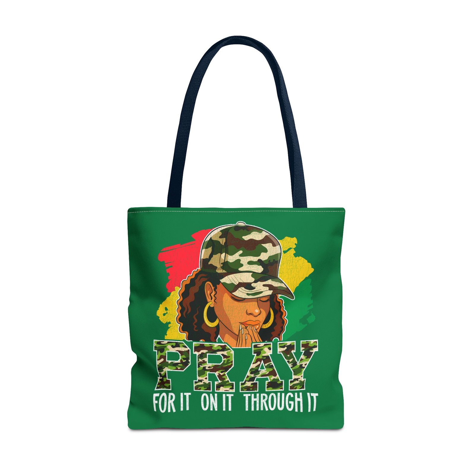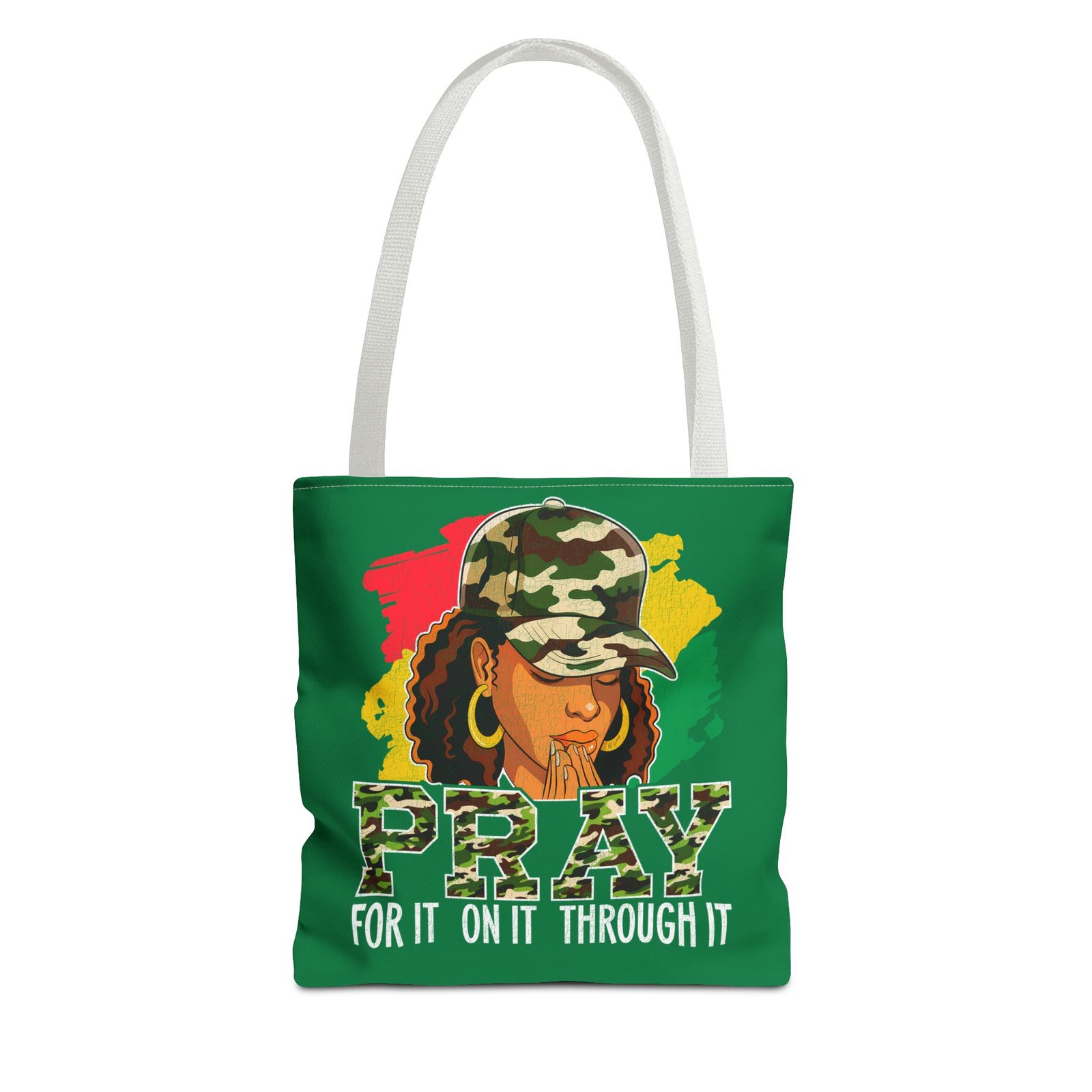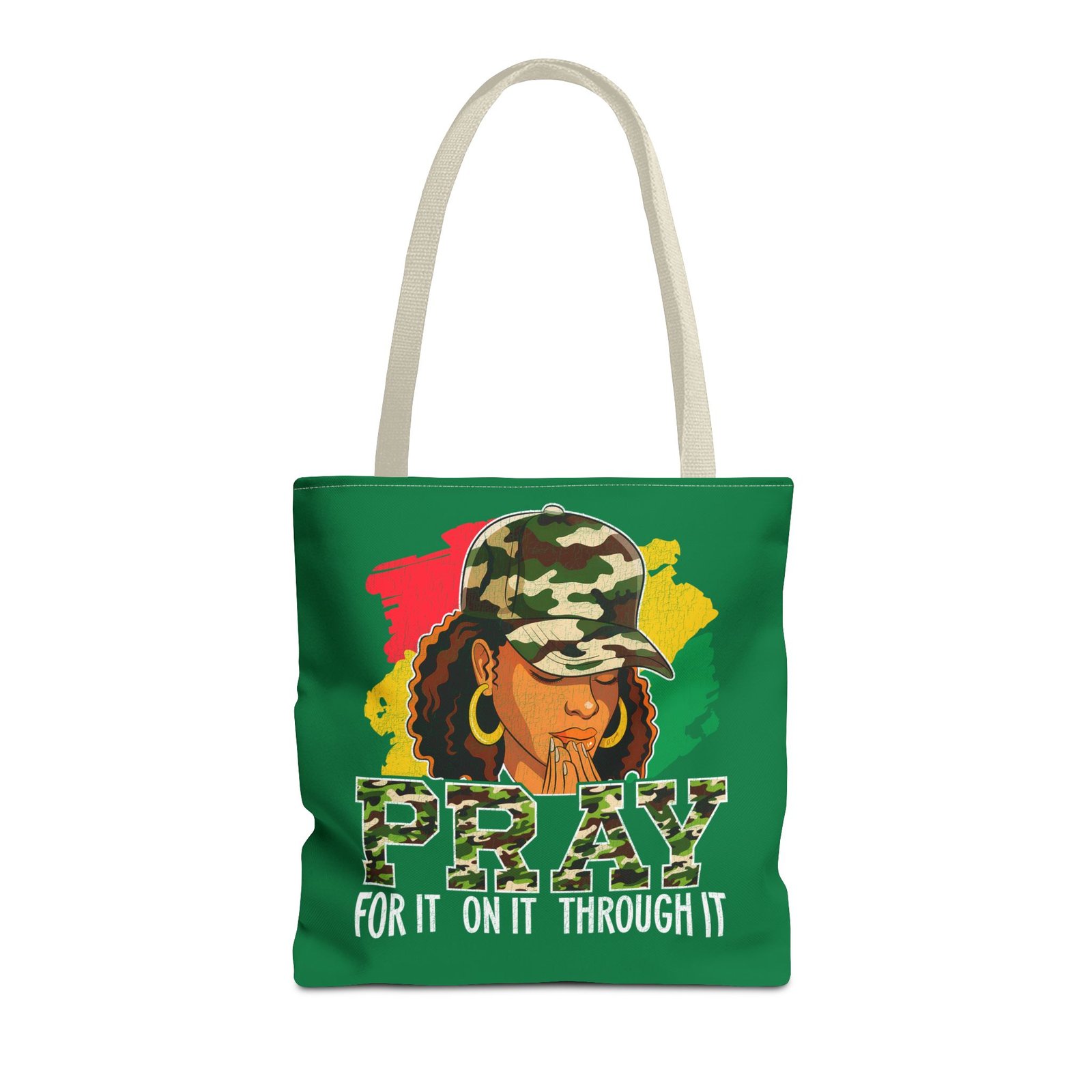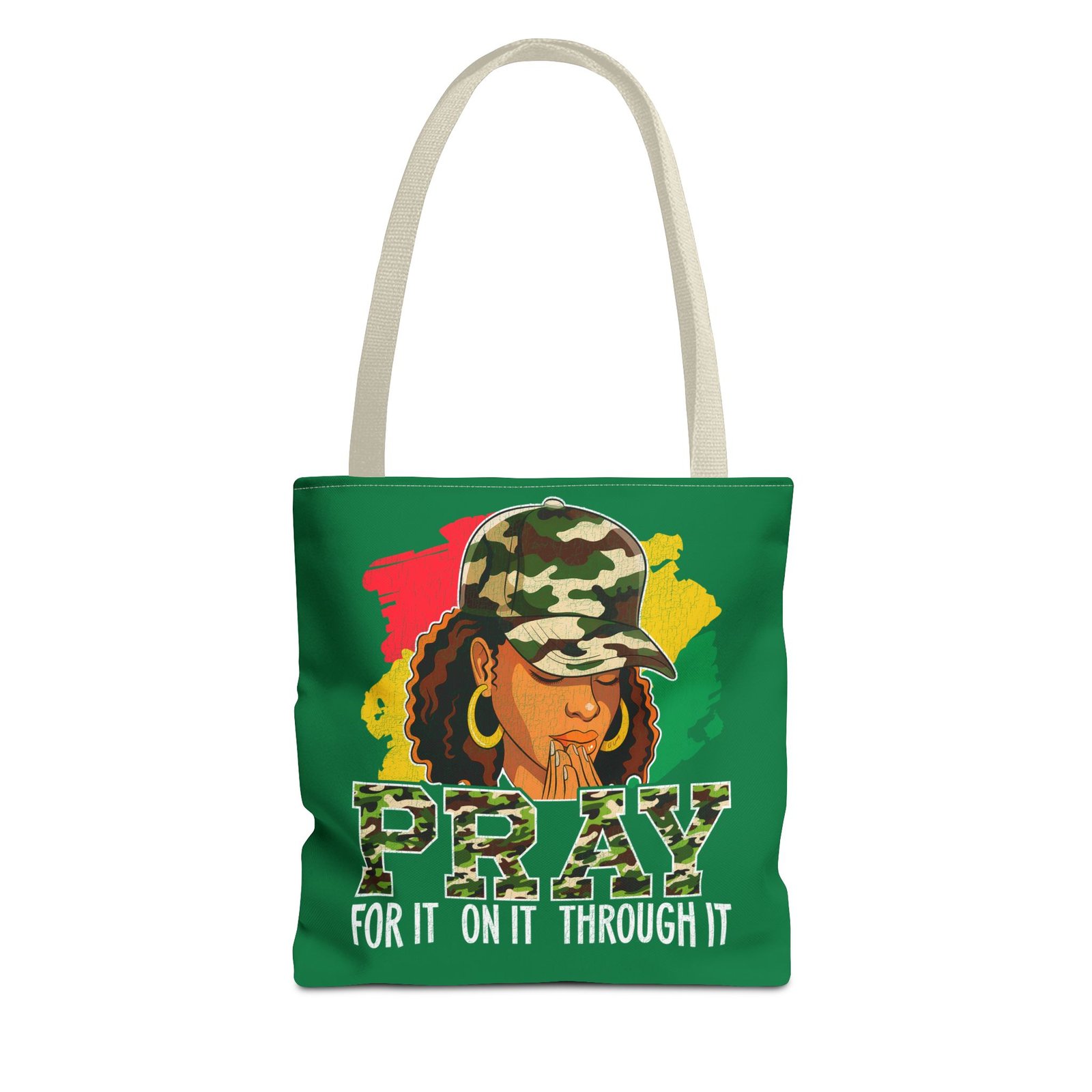 This roomy, art-forward tote brings quiet strength to everyday carry. Printed all-over on a durable polyester canvas, the design shows a woman in a camo cap with hands folded in prayer against bold red, yellow and green brushstrokes — a mix of streetwise energy and tender reverence. The bag’s boxed corners and reinforced handle stitching give structure and comfort when you load it up, while the interior laminate keeps contents supported. Wear it to church socials, community events, or while running errands to carry more than groceries — carry a statement of faith, resilience, and style.