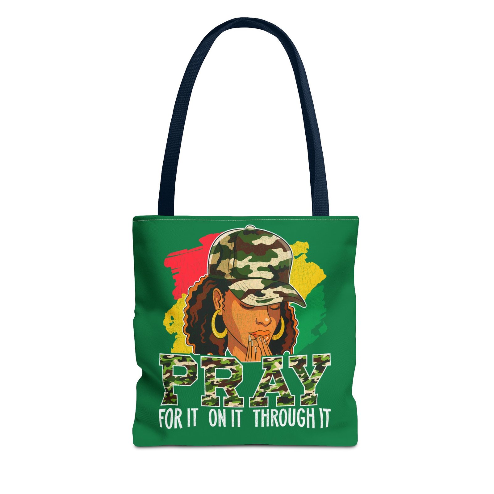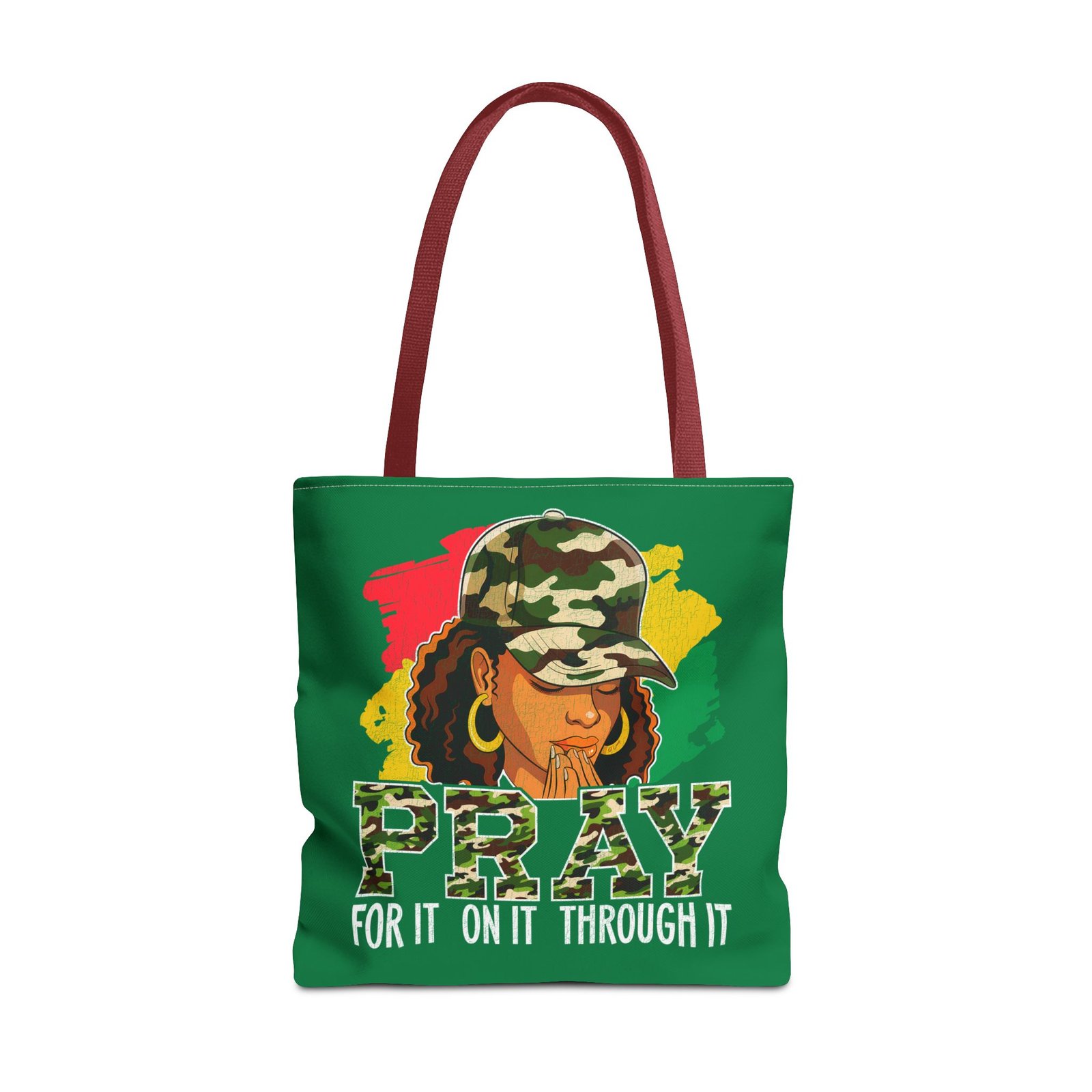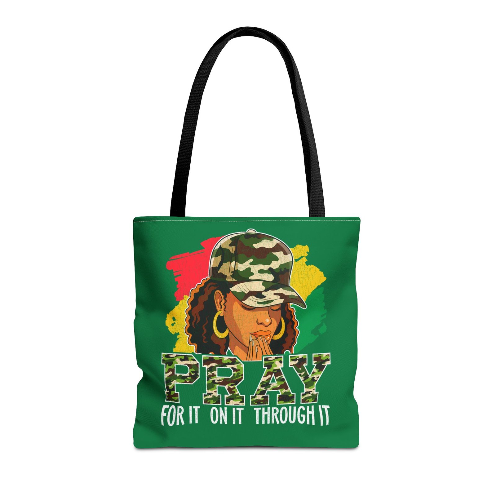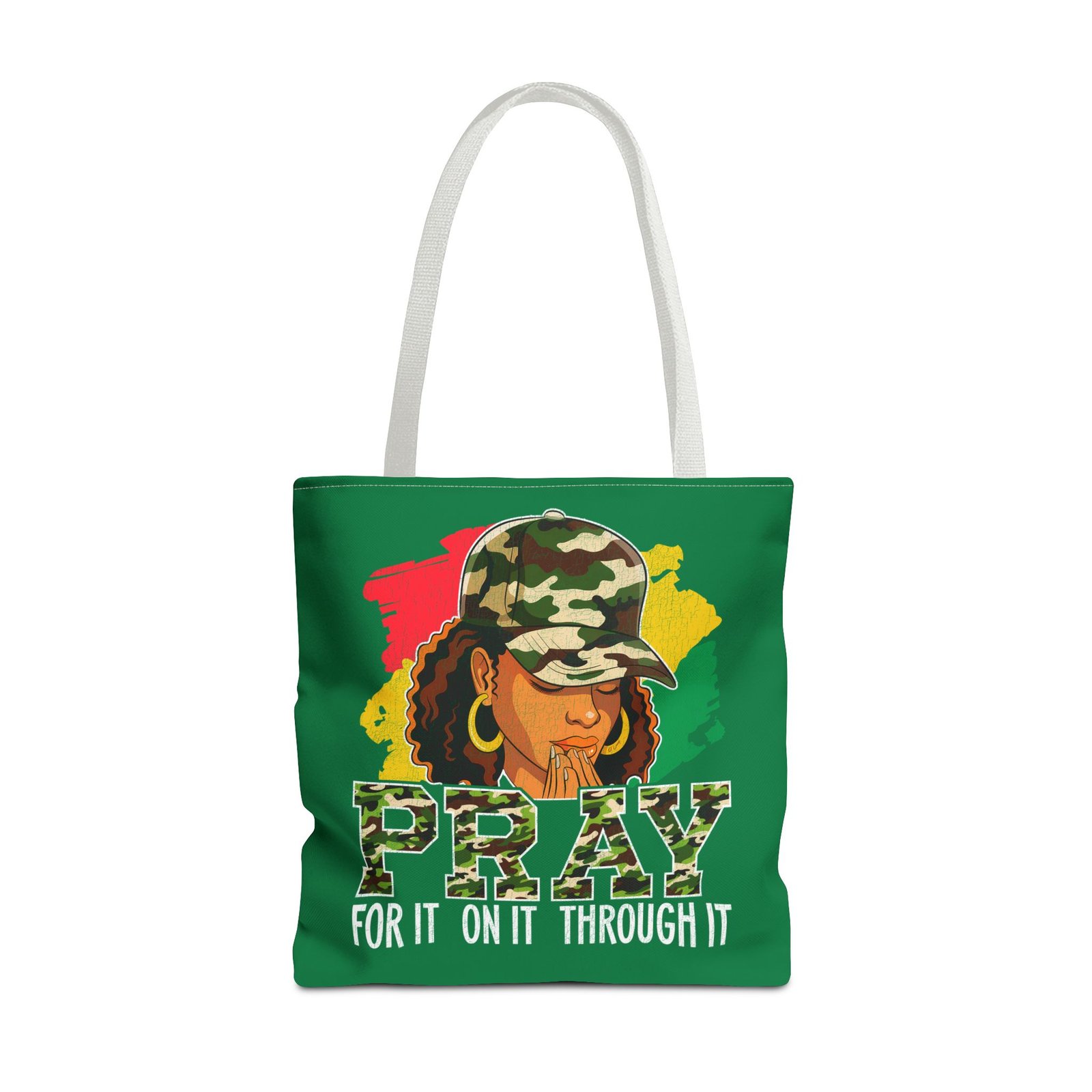 This roomy, art-forward tote brings quiet strength to everyday carry. Printed all-over on a durable polyester canvas, the design shows a woman in a camo cap with hands folded in prayer against bold red, yellow and green brushstrokes — a mix of streetwise energy and tender reverence. The bag’s boxed corners and reinforced handle stitching give structure and comfort when you load it up, while the interior laminate keeps contents supported. Wear it to church socials, community events, or while running errands to carry more than groceries — carry a statement of faith, resilience, and style.