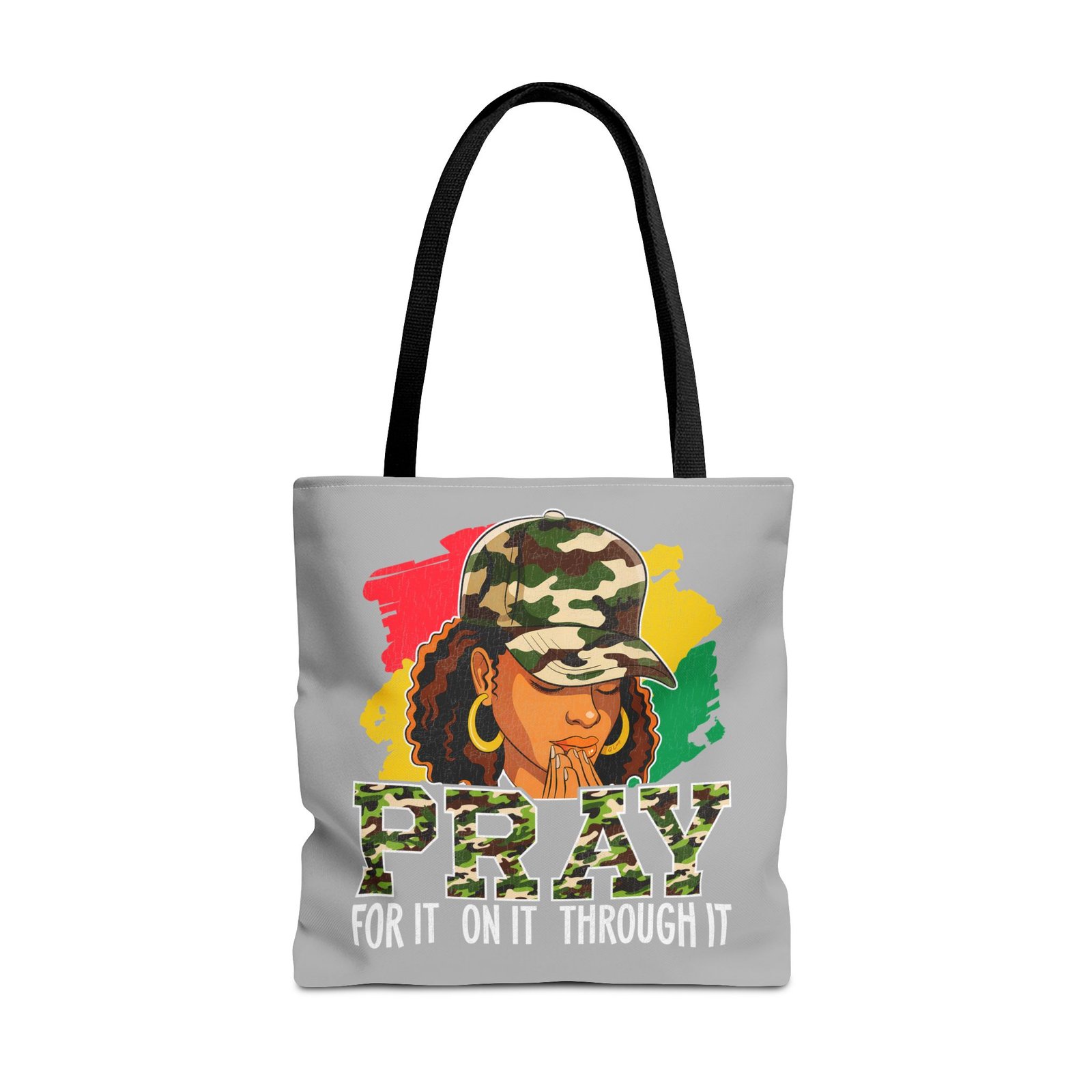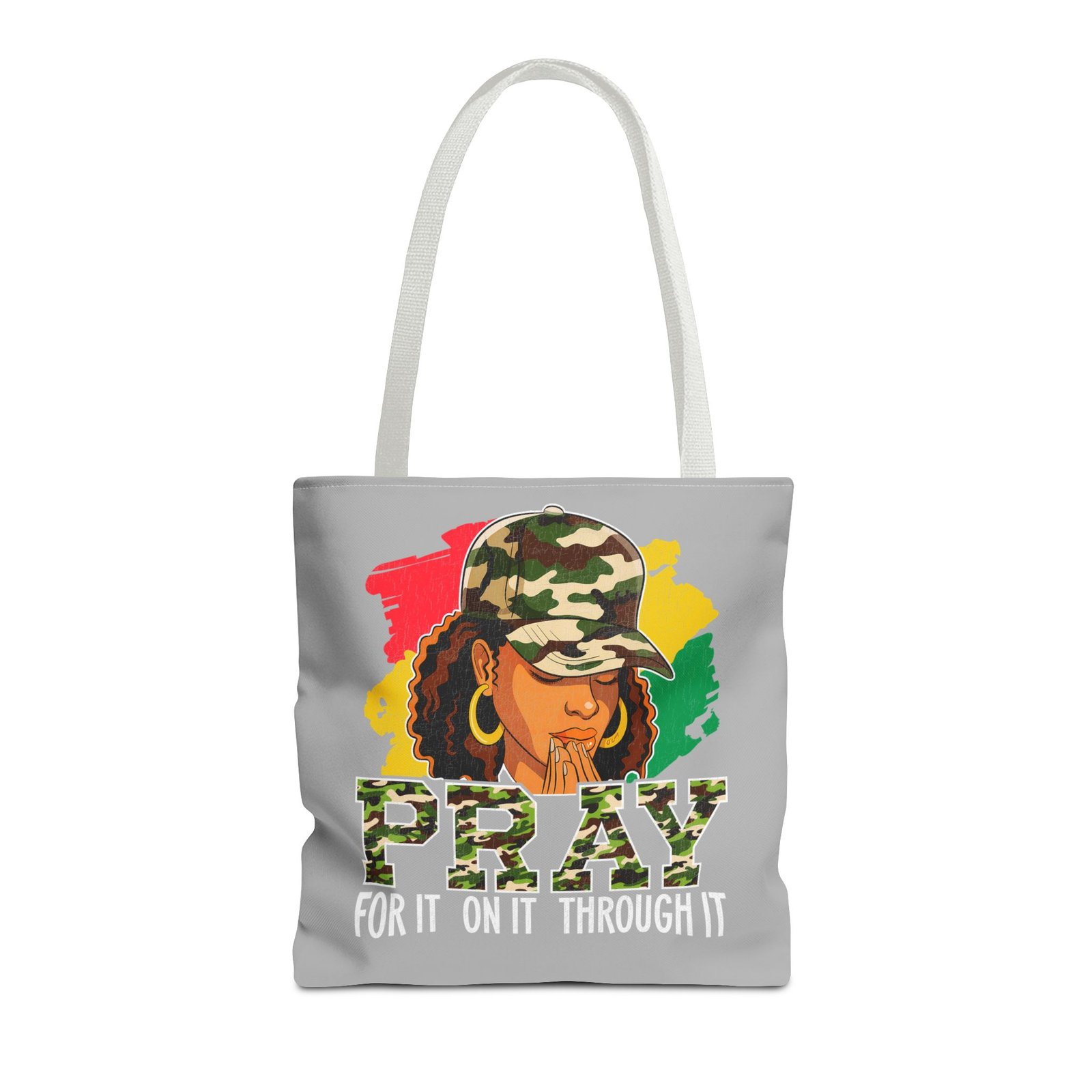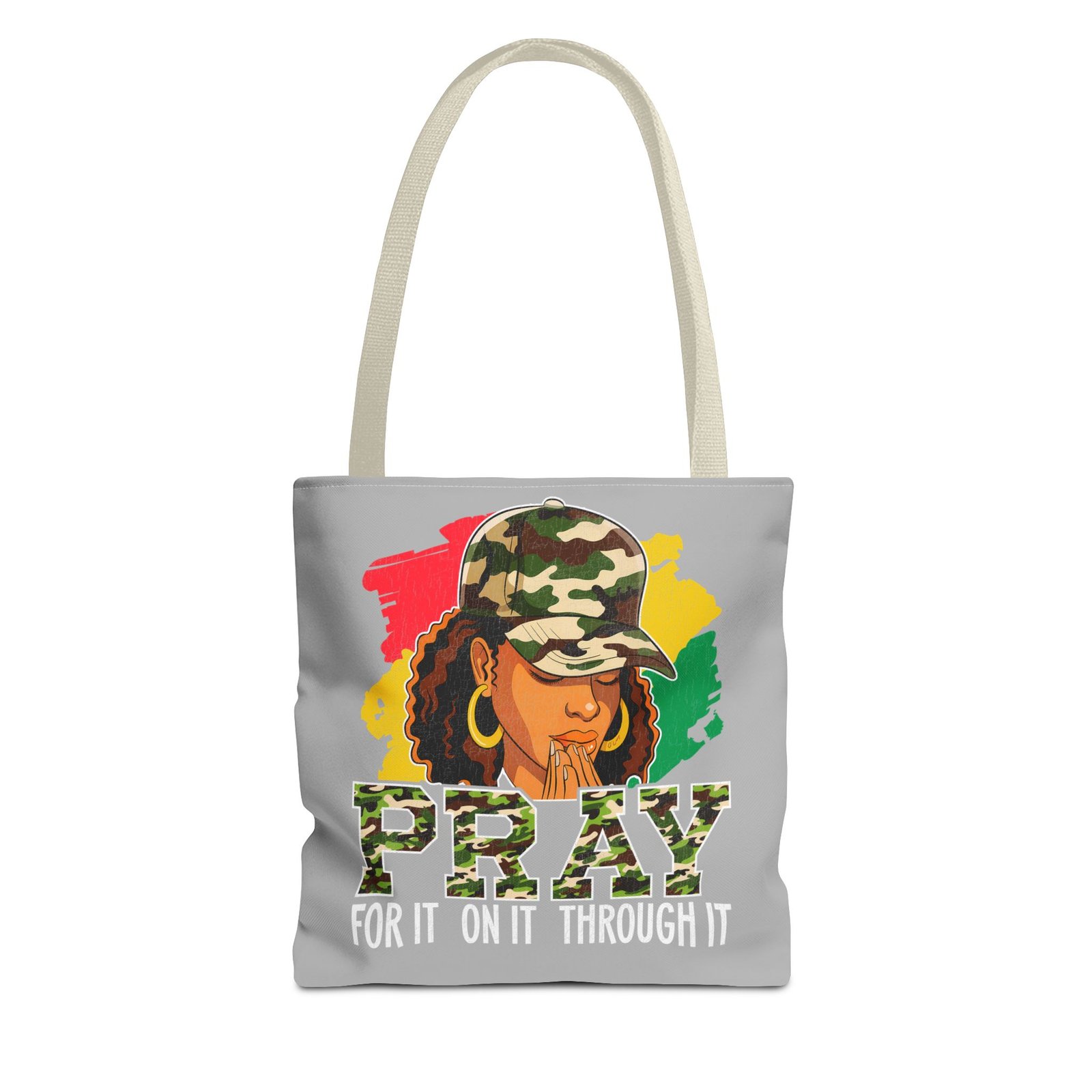 This roomy, art-forward tote brings quiet strength to everyday carry. Printed all-over on a durable polyester canvas, the design shows a woman in a camo cap with hands folded in prayer against bold red, yellow and green brushstrokes — a mix of streetwise energy and tender reverence. The bag’s boxed corners and reinforced handle stitching give structure and comfort when you load it up, while the interior laminate keeps contents supported. Wear it to church socials, community events, or while running errands to carry more than groceries — carry a statement of faith, resilience, and style.