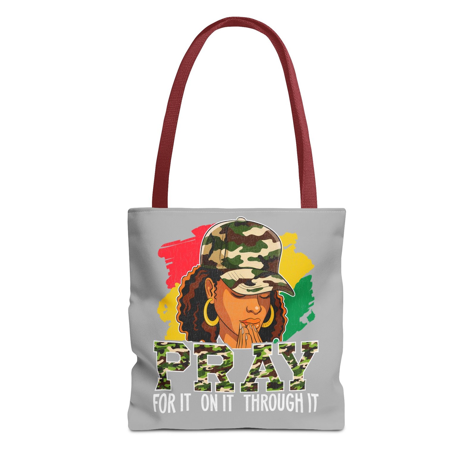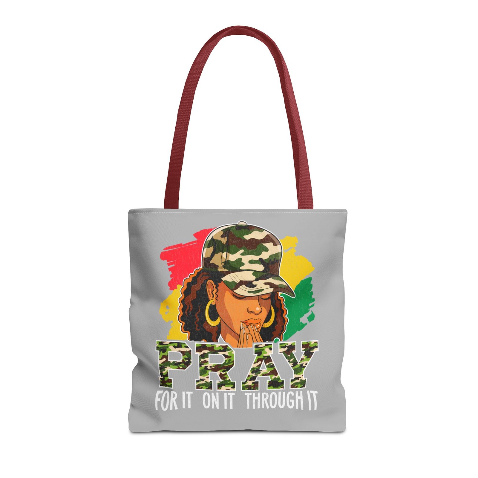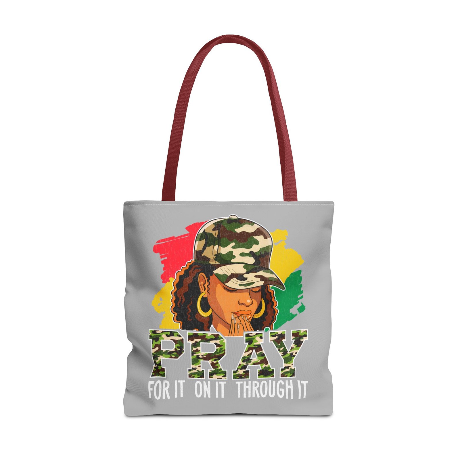This roomy, art-forward tote brings quiet strength to everyday carry. Printed all-over on a durable polyester canvas, the design shows a woman in a camo cap with hands folded in prayer against bold red, yellow and green brushstrokes — a mix of streetwise energy and tender reverence. The bag’s boxed corners and reinforced handle stitching give structure and comfort when you load it up, while the interior laminate keeps contents supported. Wear it to church socials, community events, or while running errands to carry more than groceries — carry a statement of faith, resilience, and style.