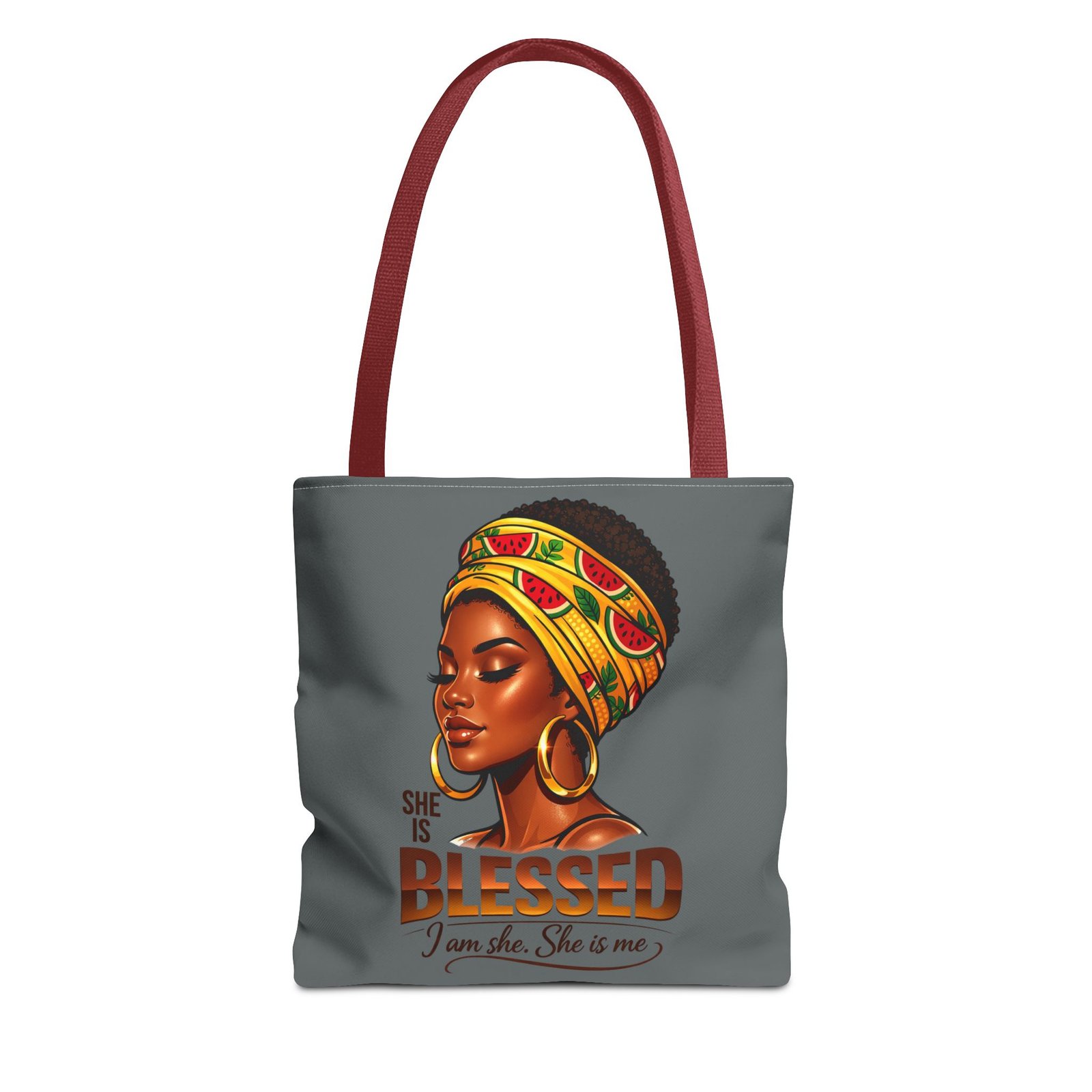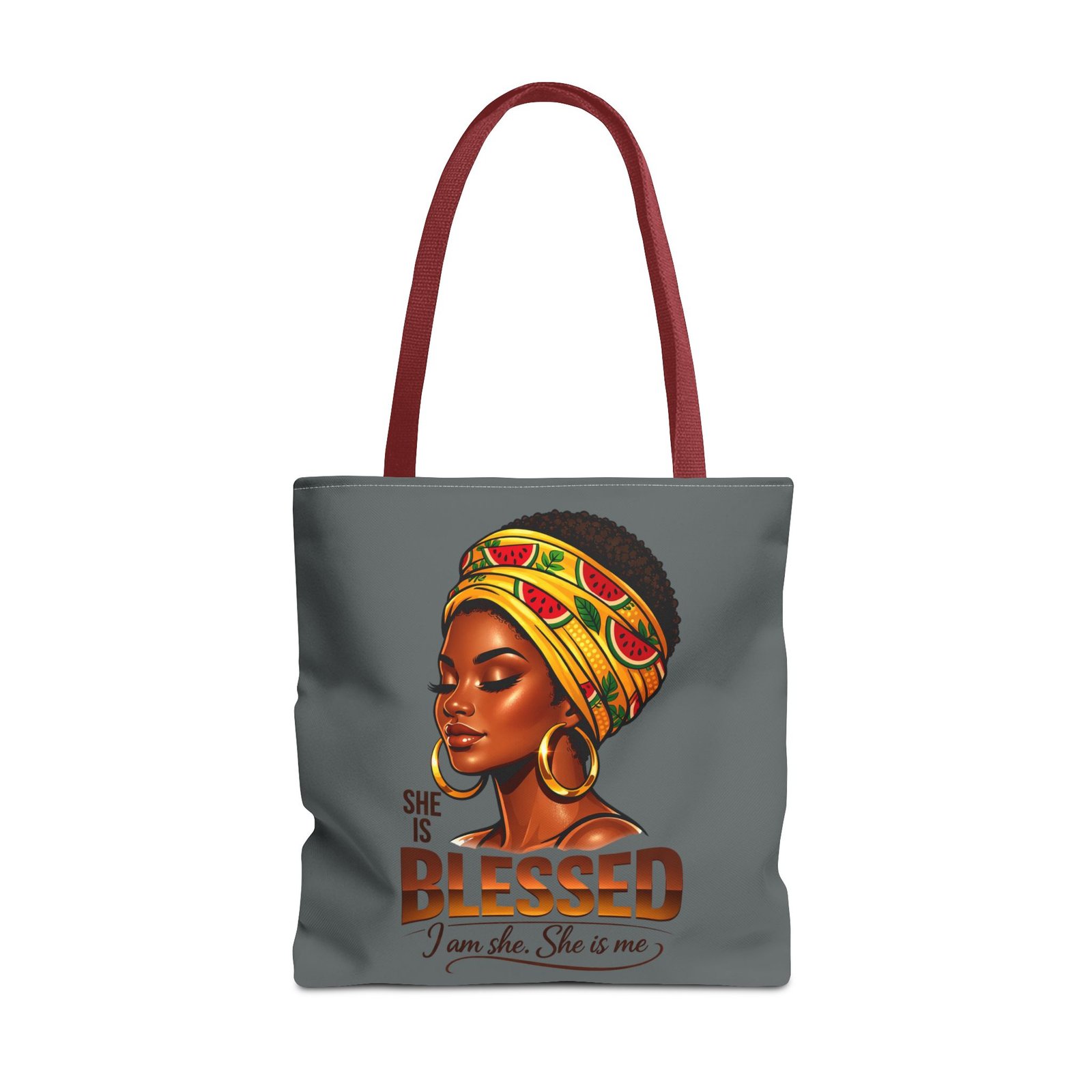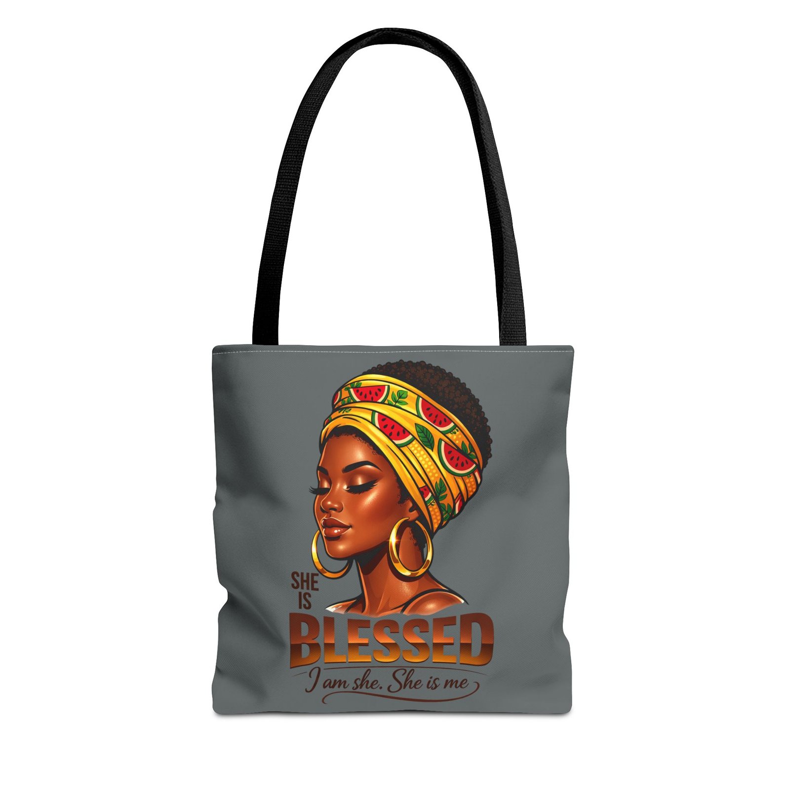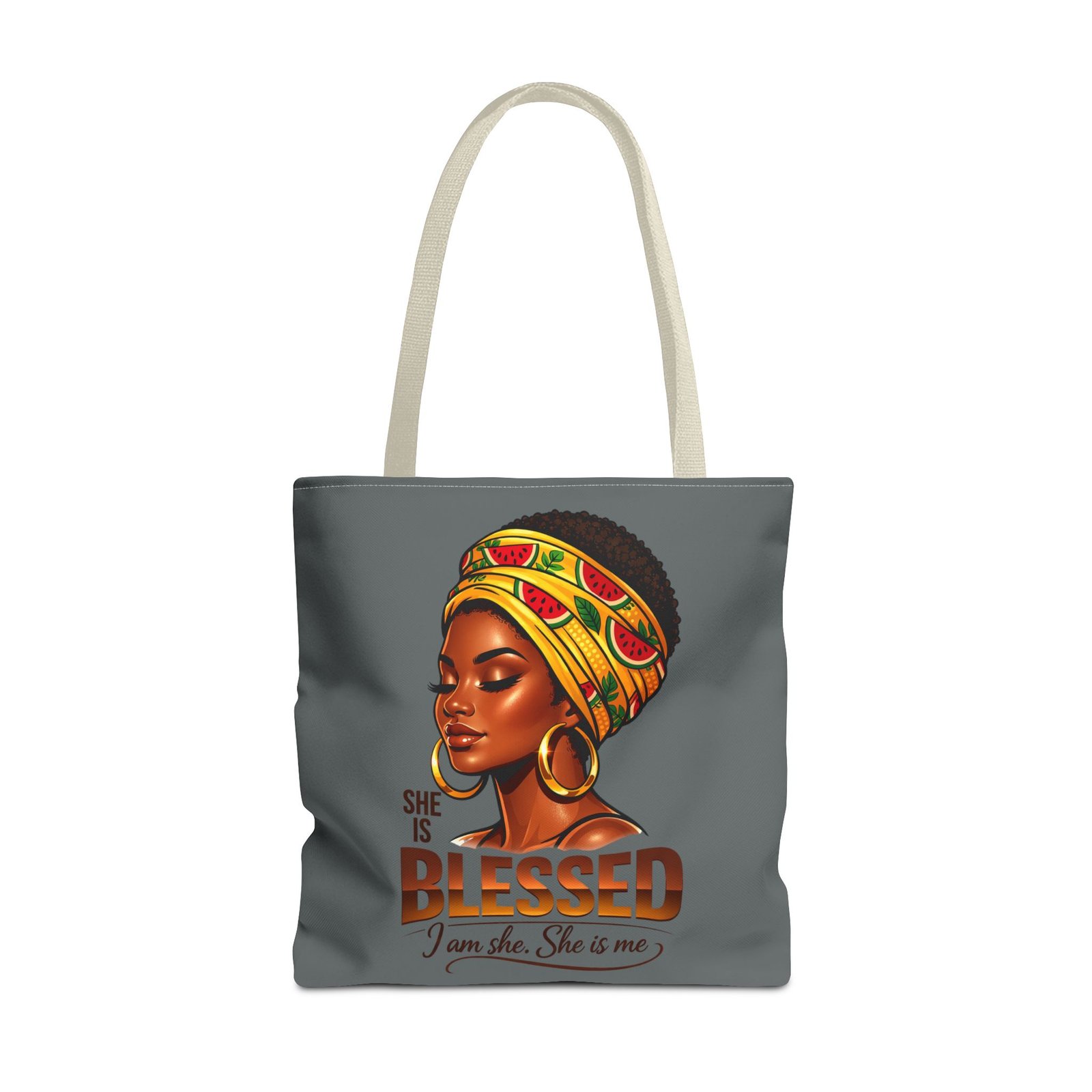 Carry a quiet, confident brightness with you every day. This roomy tote features a warm portrait of a woman wrapped in a vibrant headwrap, gold hoops catching the light — an image that speaks of calm strength and inner gratitude. The smooth polyester surface keeps colors vivid while boxed corners and reinforced handles let you load it up without losing shape. Use it for market runs, library stops, or as an easygoing carry-all when you want your accessories to reflect pride and presence.