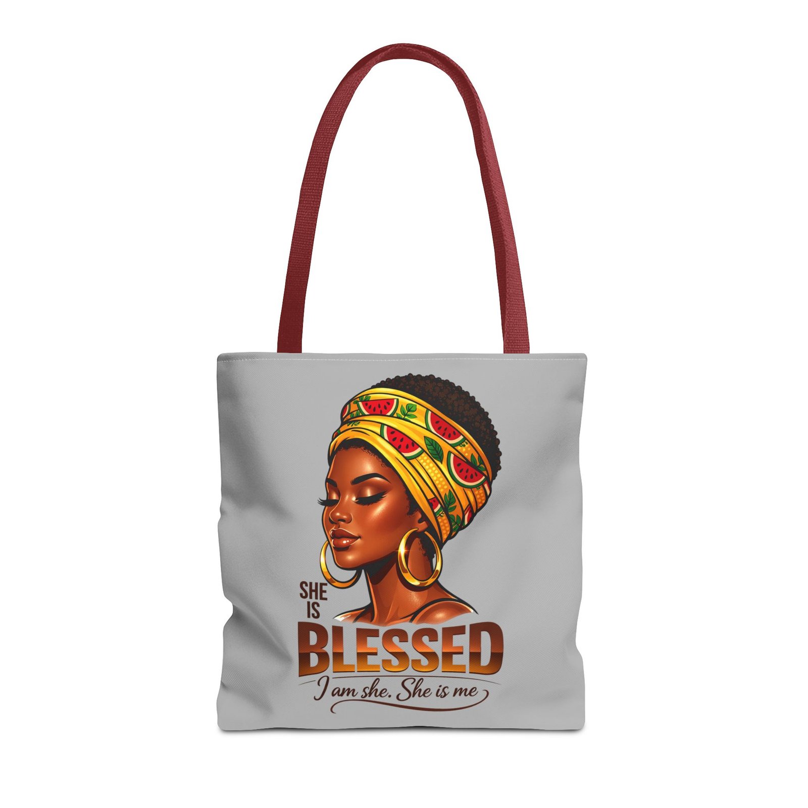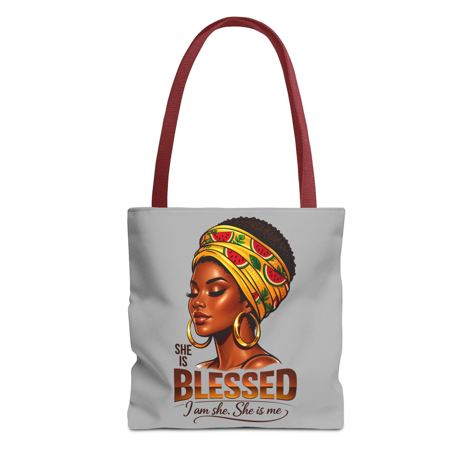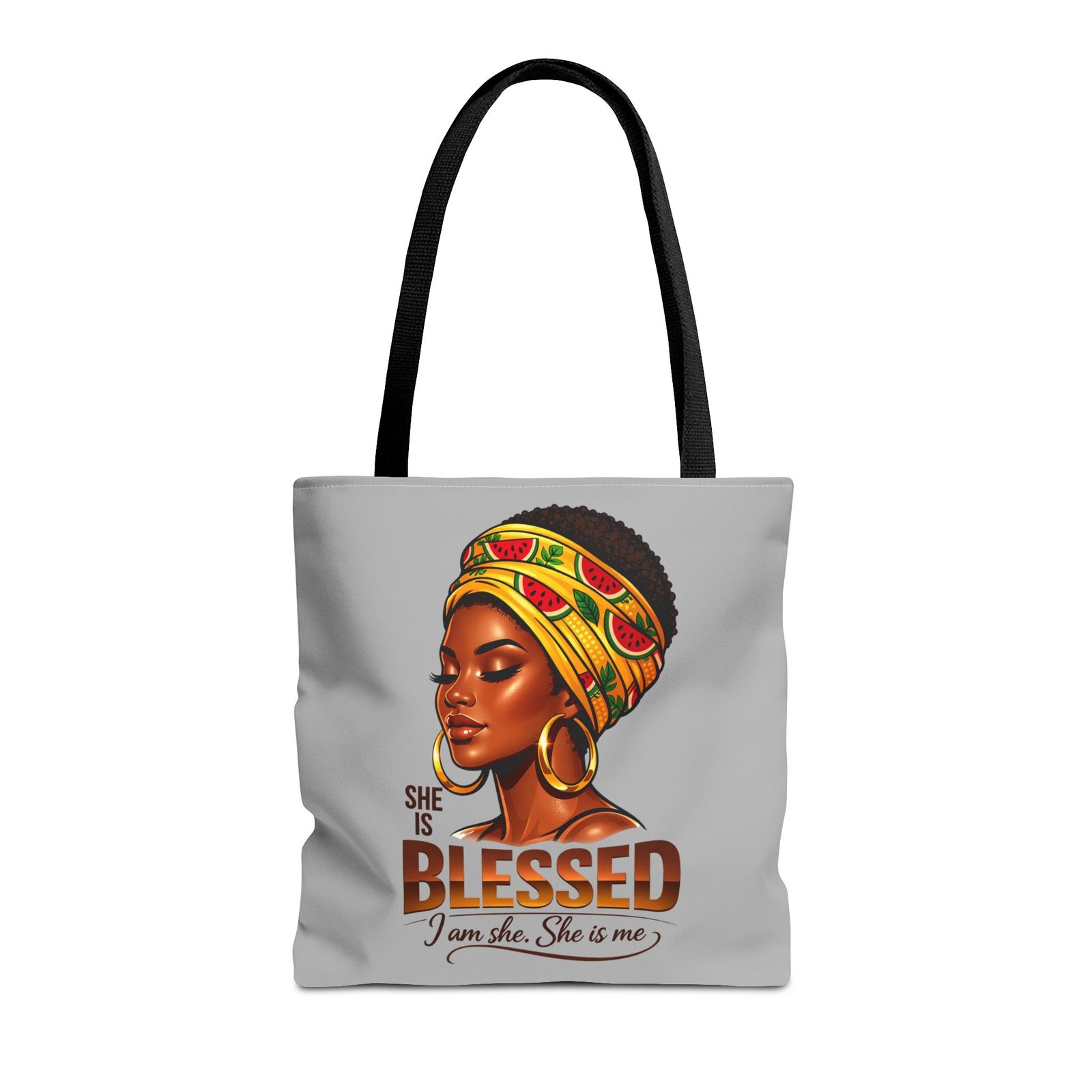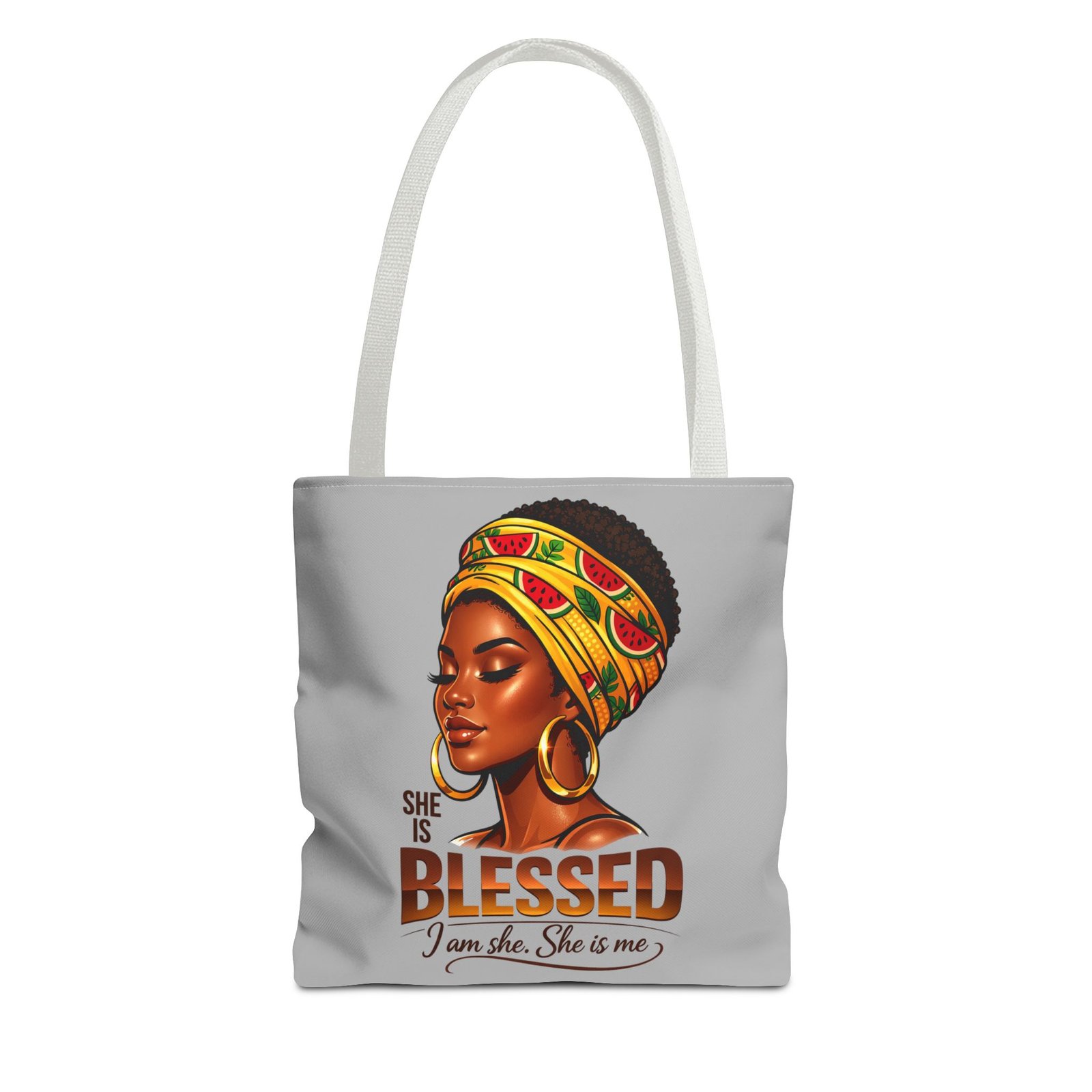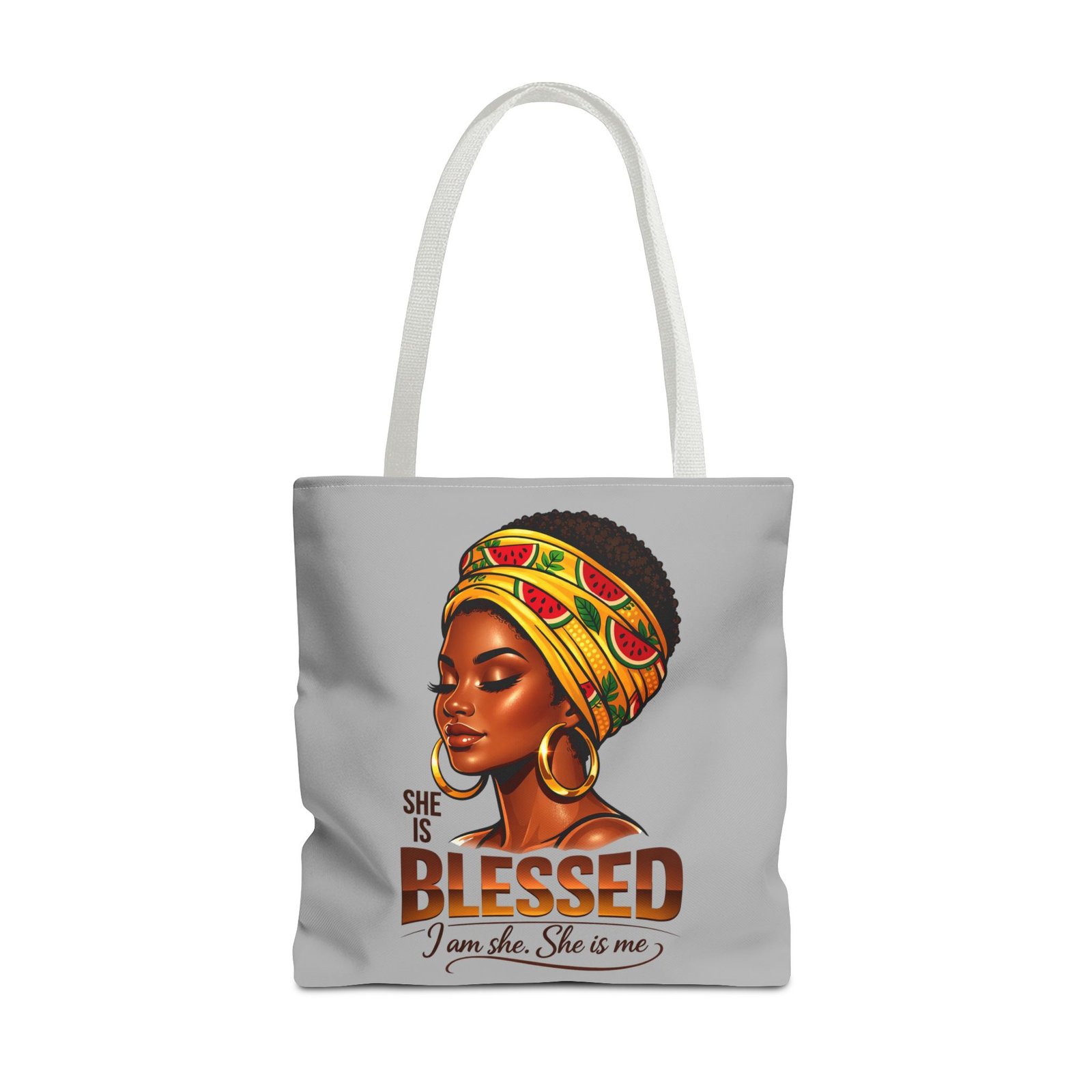 Carry a quiet, confident brightness with you every day. This roomy tote features a warm portrait of a woman wrapped in a vibrant headwrap, gold hoops catching the light — an image that speaks of calm strength and inner gratitude. The smooth polyester surface keeps colors vivid while boxed corners and reinforced handles let you load it up without losing shape. Use it for market runs, library stops, or as an easygoing carry-all when you want your accessories to reflect pride and presence.