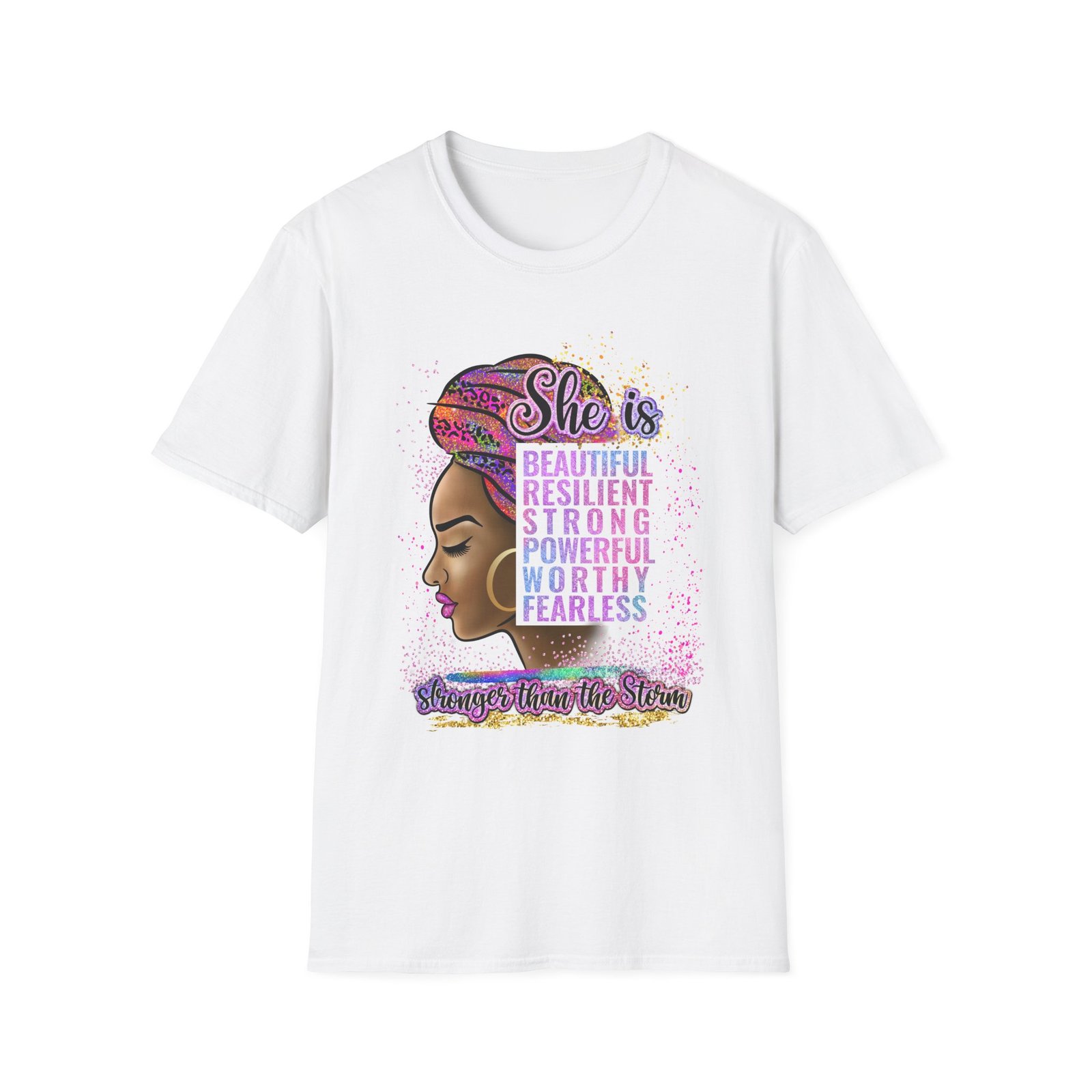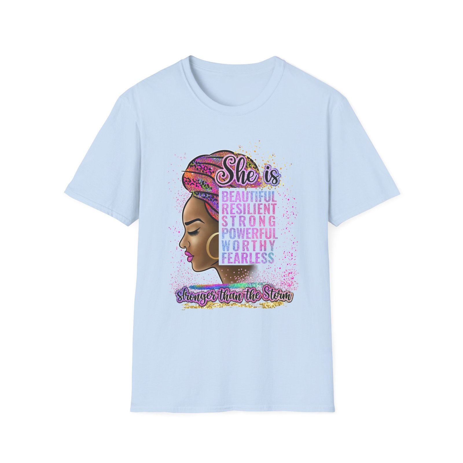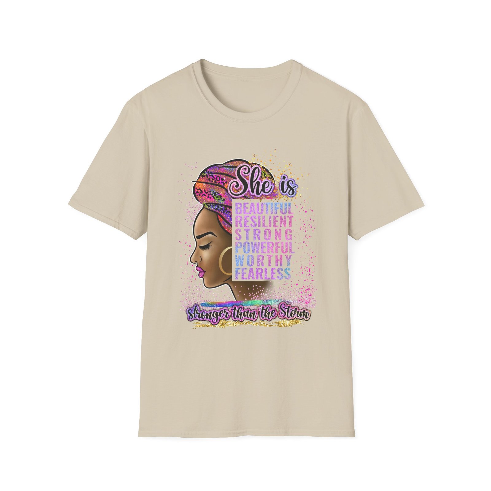 Soft, confident, quietly bold — this lightweight tee carries a message as warm and steady as a sister’s voice. The front art centers a proud profile framed by a colorful headwrap and a stacked affirmation — beautiful, resilient, strong, powerful, worthy, fearless — with a hand-lettered tagline grounding the design. It sits easily through city days, study sessions, or slow Sunday mornings, layering under jackets or worn solo to let the statement speak. Breathable ring-spun cotton and a classic crew cut give it a lived-in comfort while the tubular knit and reinforced shoulder tape keep the shape wash after wash. Wear it when you want to feel steady, seen, and quietly unstoppable.