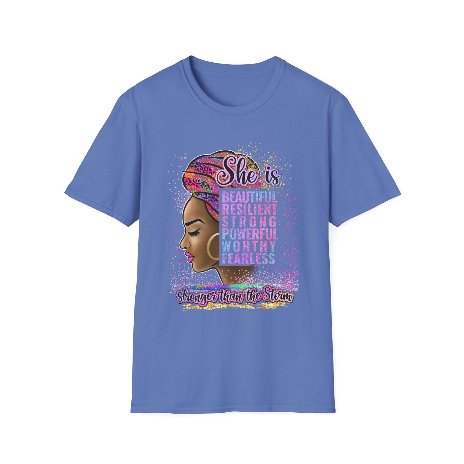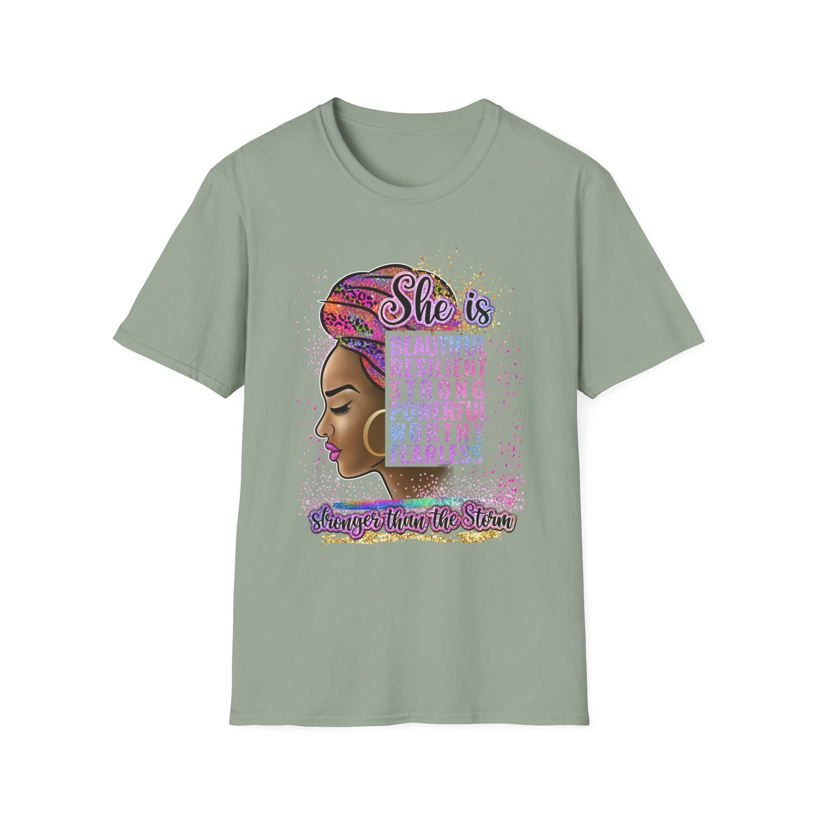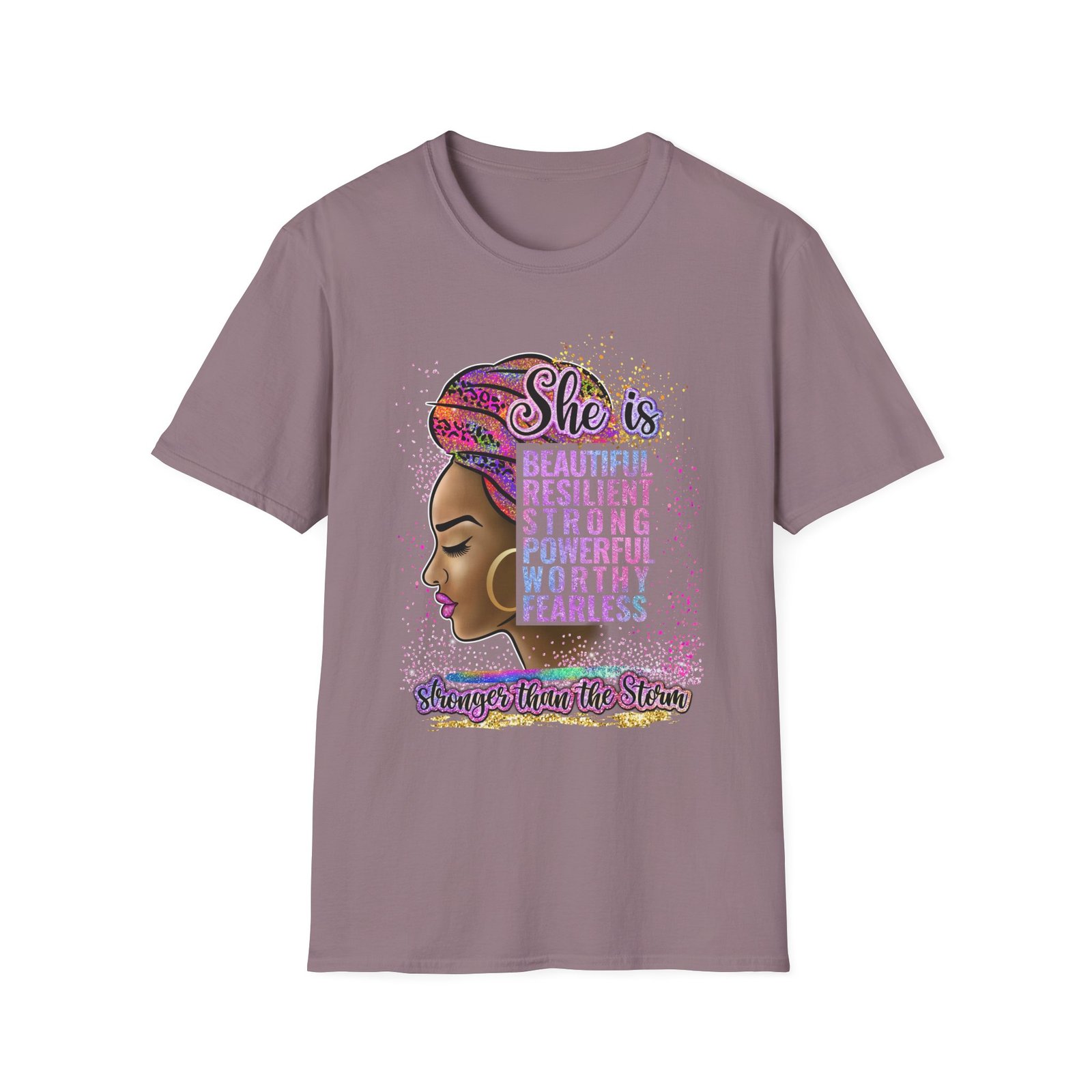 Soft, confident, quietly bold — this lightweight tee carries a message as warm and steady as a sister’s voice. The front art centers a proud profile framed by a colorful headwrap and a stacked affirmation — beautiful, resilient, strong, powerful, worthy, fearless — with a hand-lettered tagline grounding the design. It sits easily through city days, study sessions, or slow Sunday mornings, layering under jackets or worn solo to let the statement speak. Breathable ring-spun cotton and a classic crew cut give it a lived-in comfort while the tubular knit and reinforced shoulder tape keep the shape wash after wash. Wear it when you want to feel steady, seen, and quietly unstoppable.
