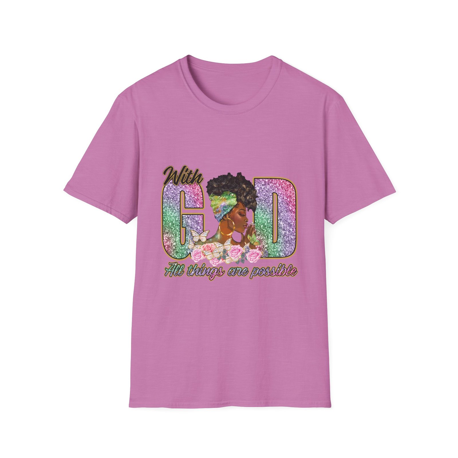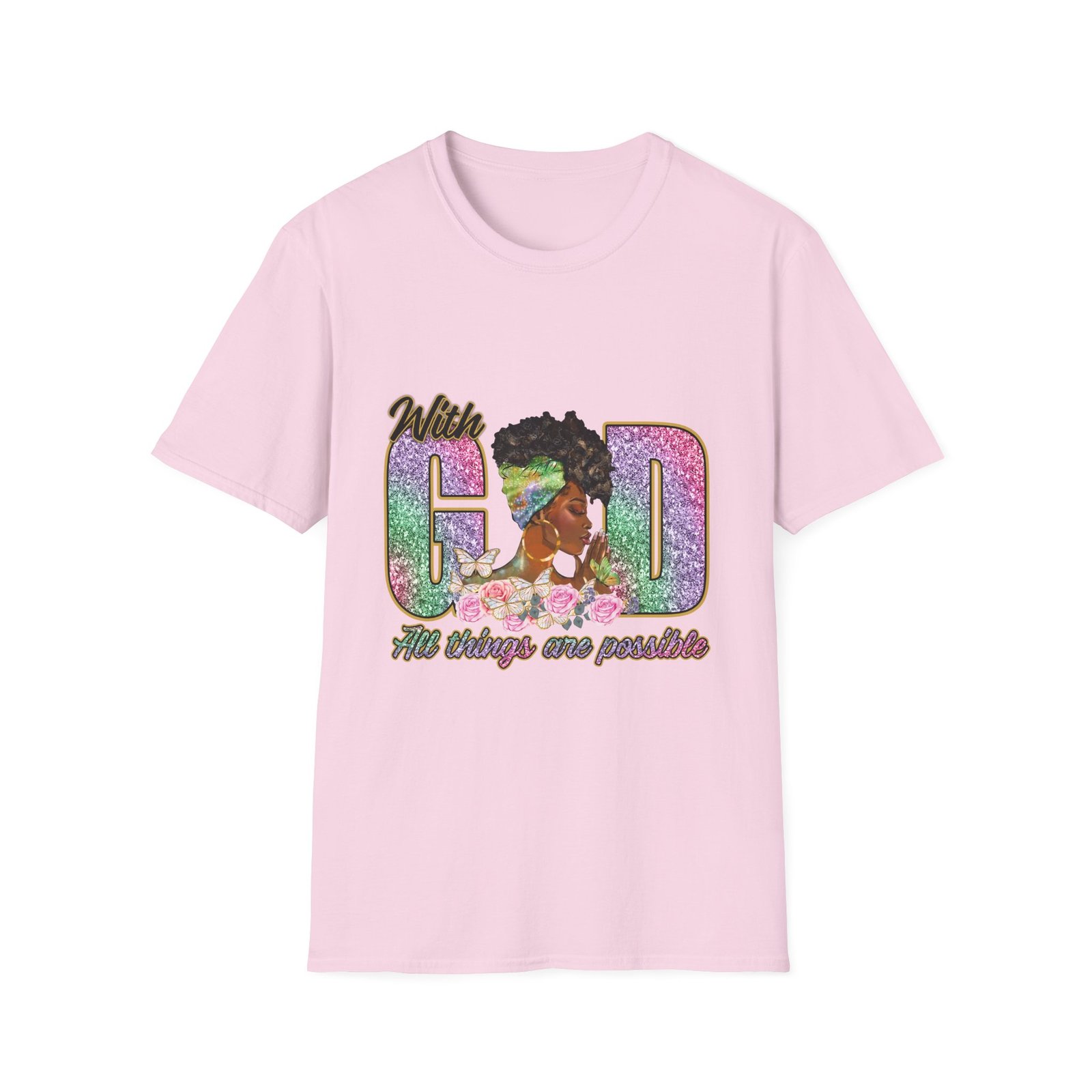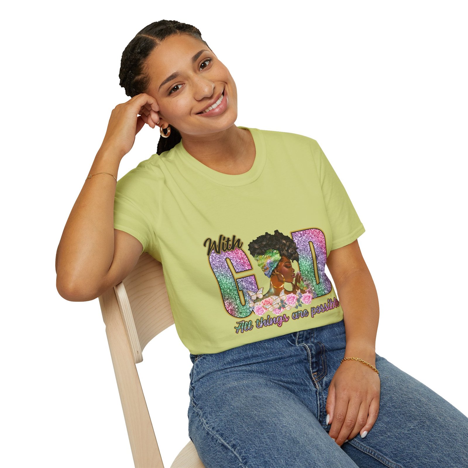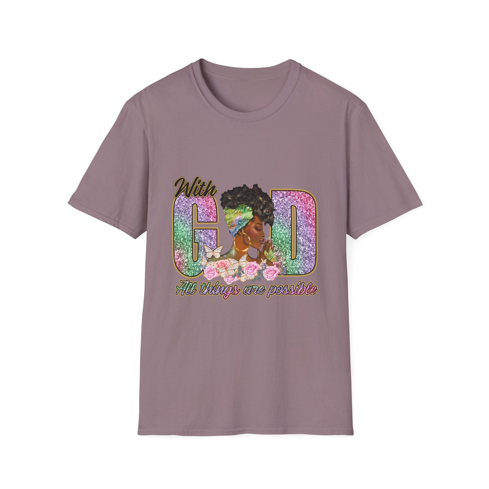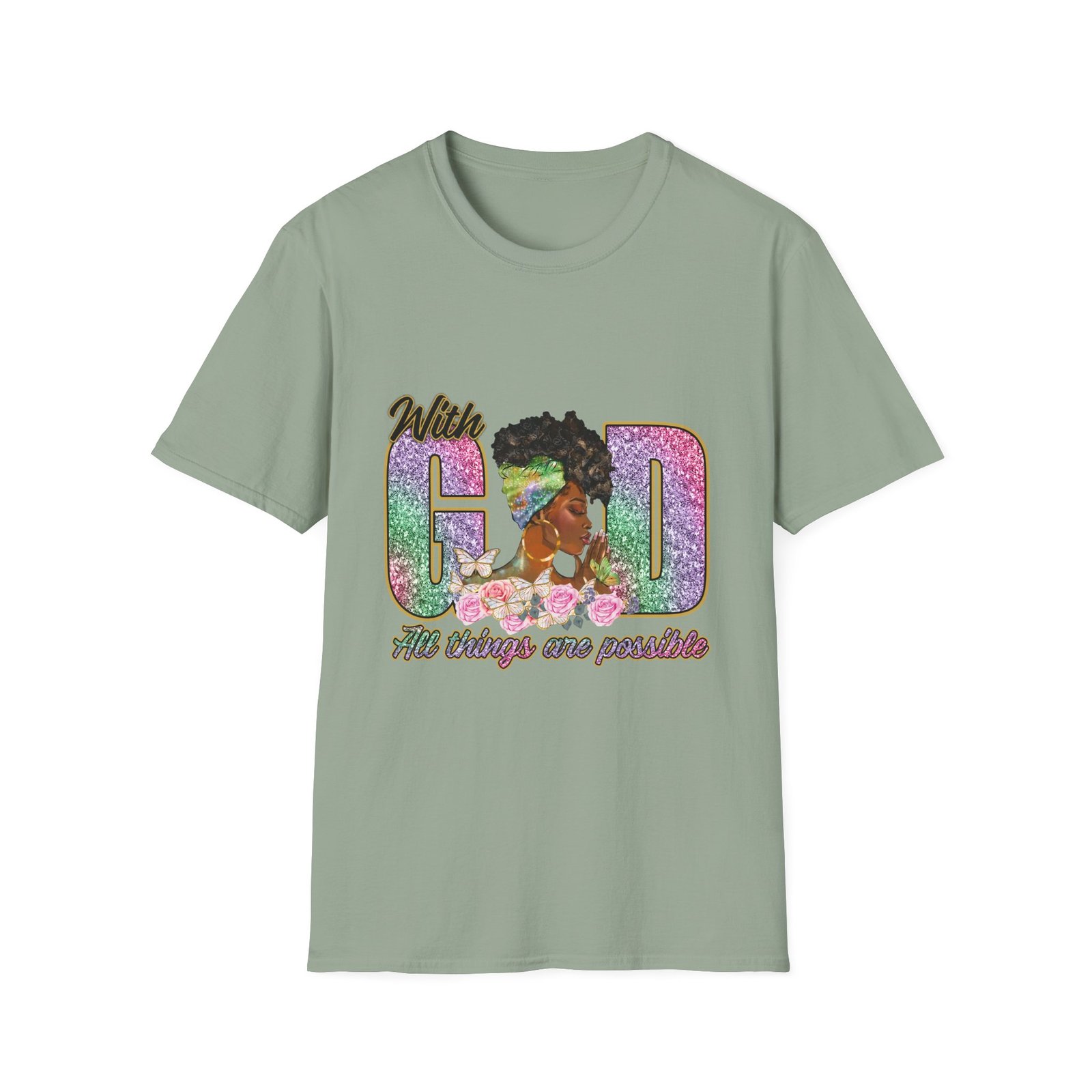 Soft, light, and quietly confident — this cotton tee carries a message as warm as the print. A bold, glittery “GOD” lettering frames an illustrated figure, surrounded by soft florals and the uplifting line “All things are possible.” It feels like an afternoon of calm faith: gentle colors, tactile print detail, and a clean crew neck that sits naturally under a jacket or over a favorite skirt. Wear it to moments when you want your belief to be gentle but visible — church gatherings, small group meetups, quiet mornings of reflection, or casual days when you want an extra lift. The breathable ring-spun cotton and tear-away label keep the focus on comfort, while thoughtful construction (no side seams, ribbed collar, shoulder tape) helps the shirt keep its shape and feel like new.