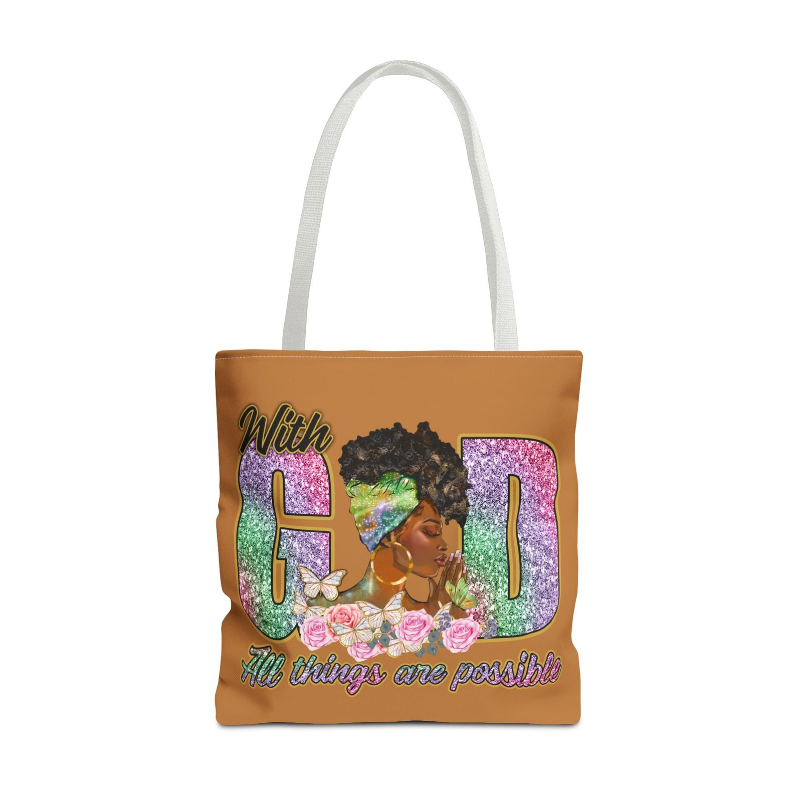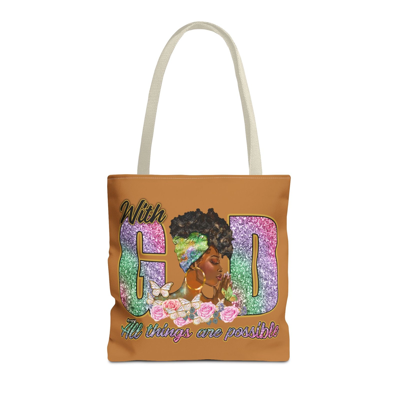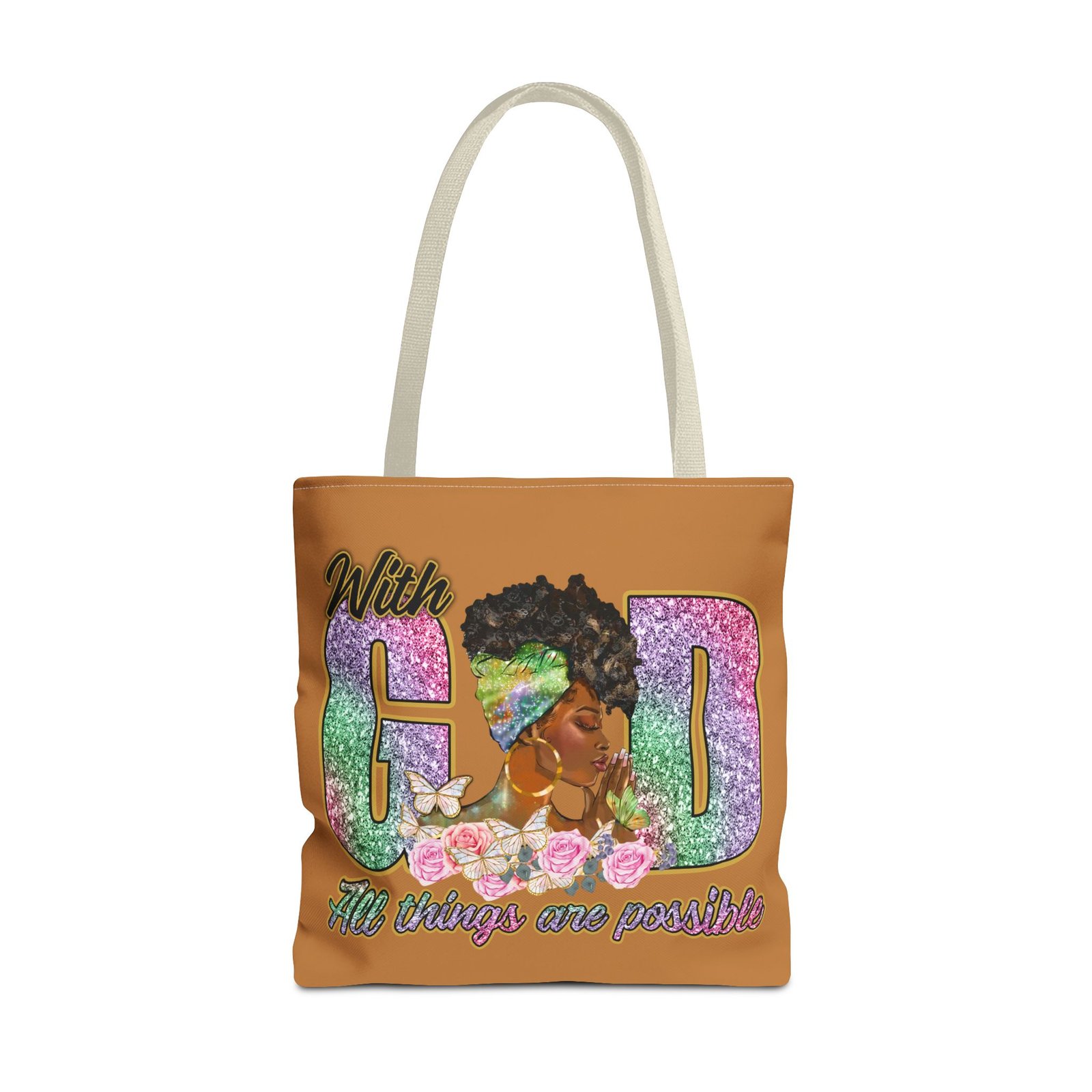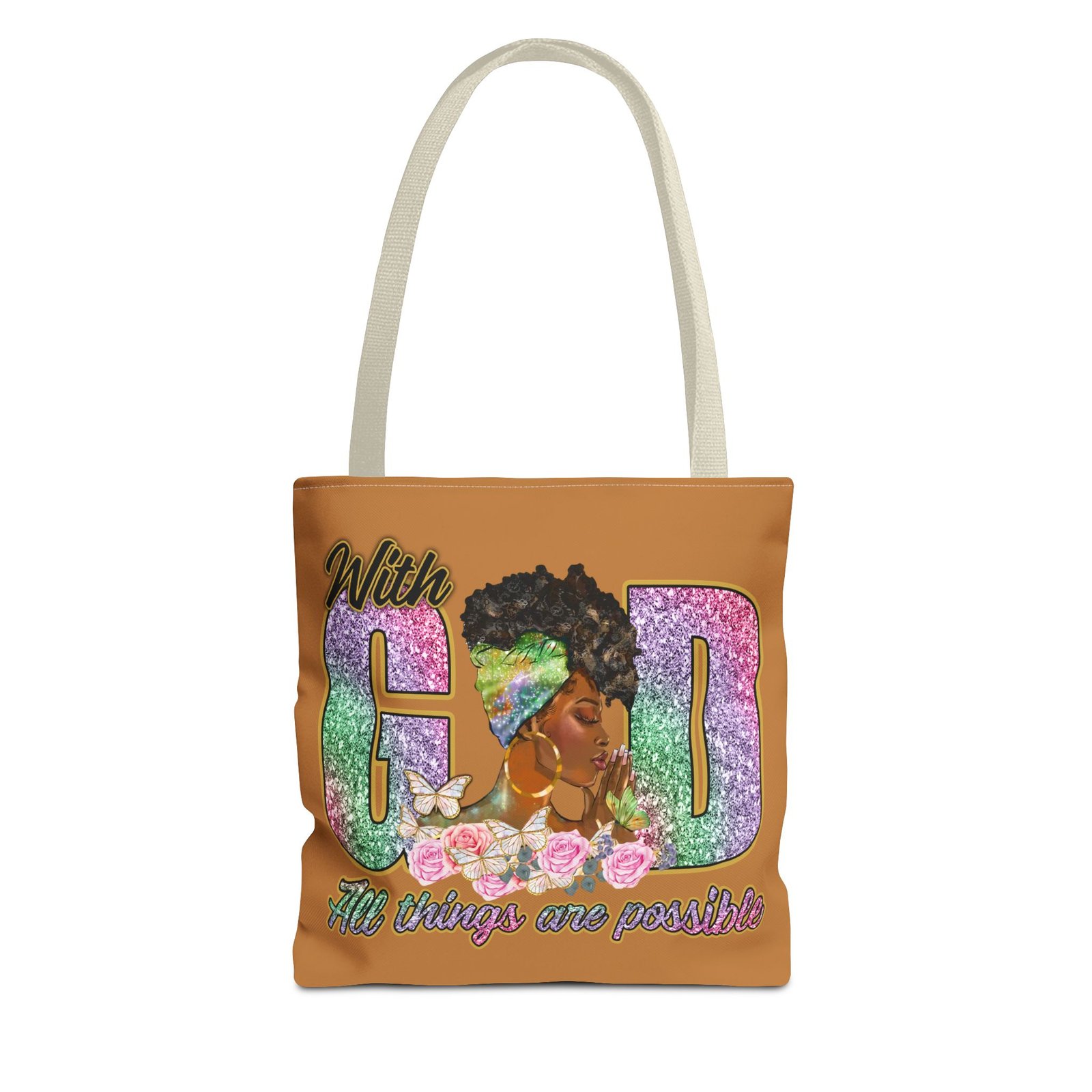 This bright, roomy tote brings bold confidence and quiet faith into every errand, meeting, or church gathering. The front panel features a vibrant portrait of a woman with a stylish headwrap woven into large, glitter-like letters that read ‘With God’ and a floral base that carries the uplifting line ‘All things are possible.’ The sunny background and contrasting black handles make the artwork pop while the boxed corners add structure and space for groceries, books, or a planner. Carry it over your shoulder and feel seen — it’s the kind of bag that holds your essentials and your quiet declarations of hope.