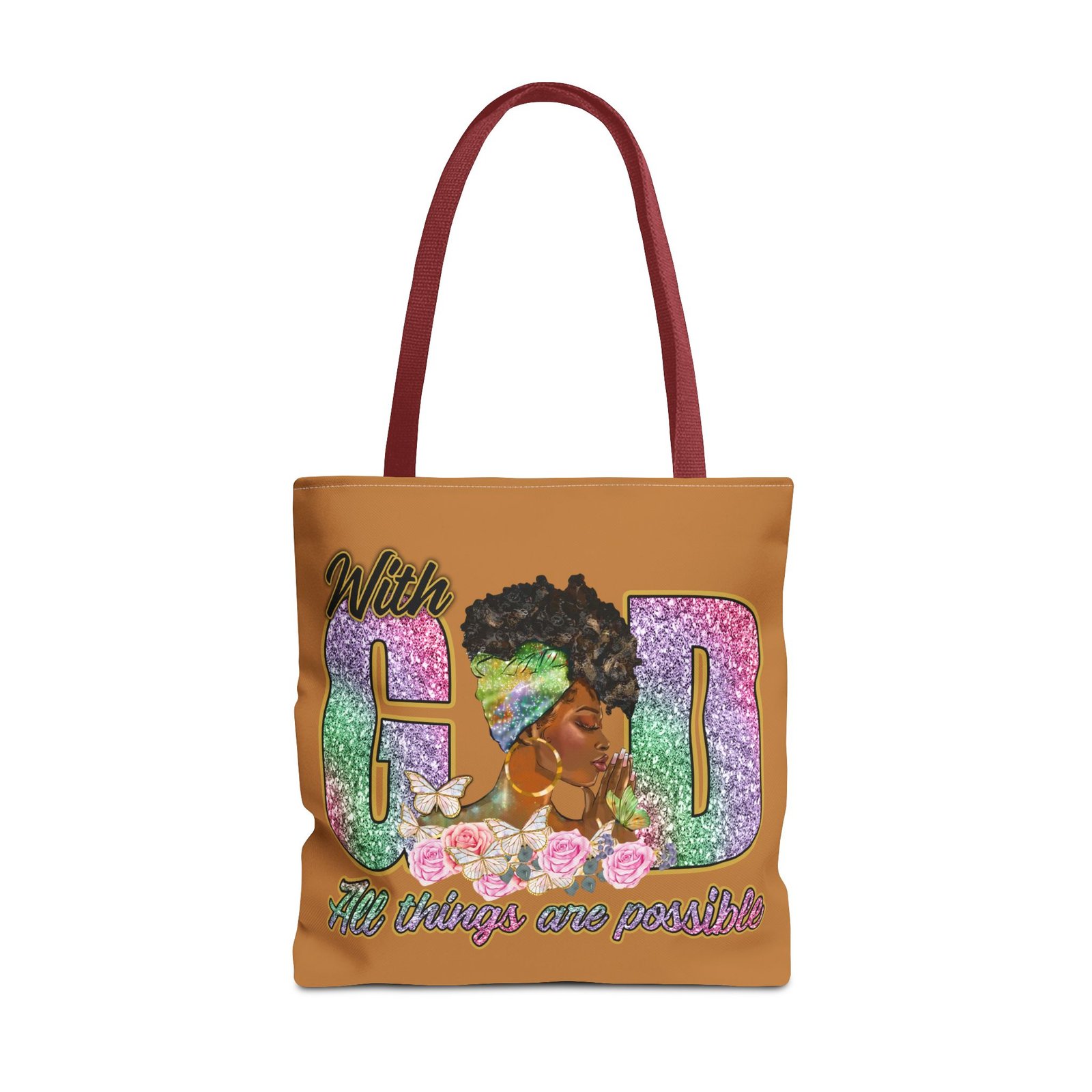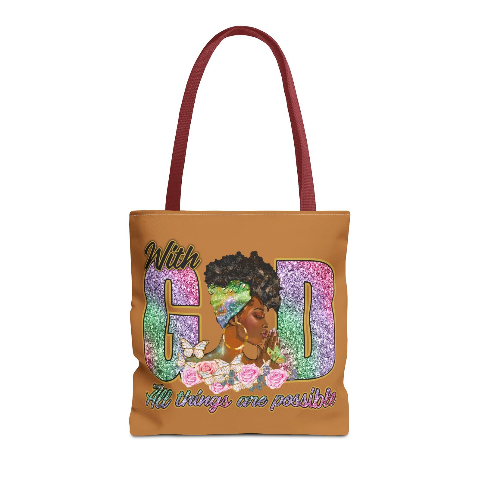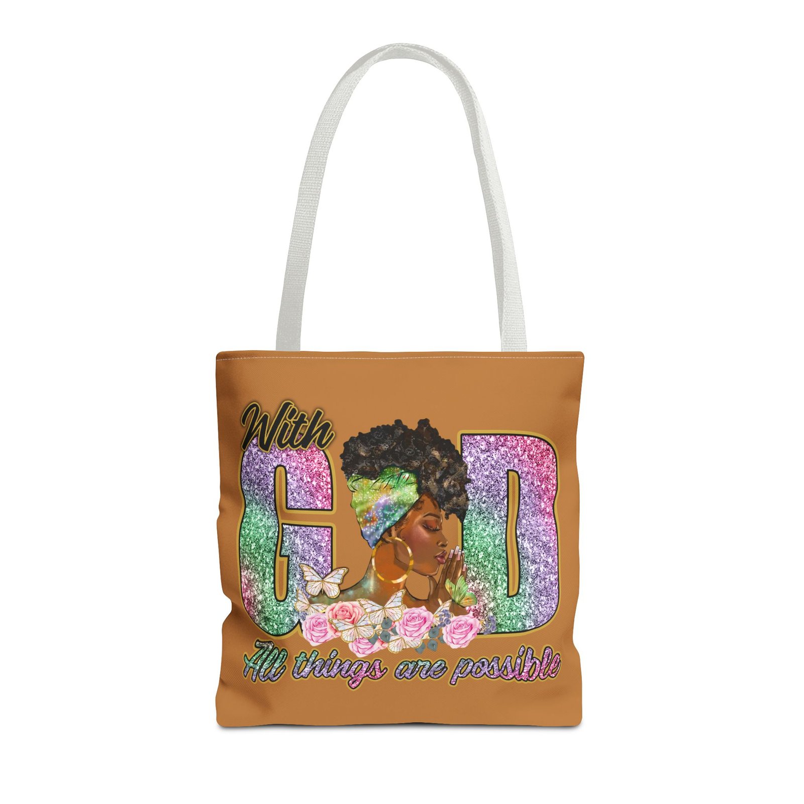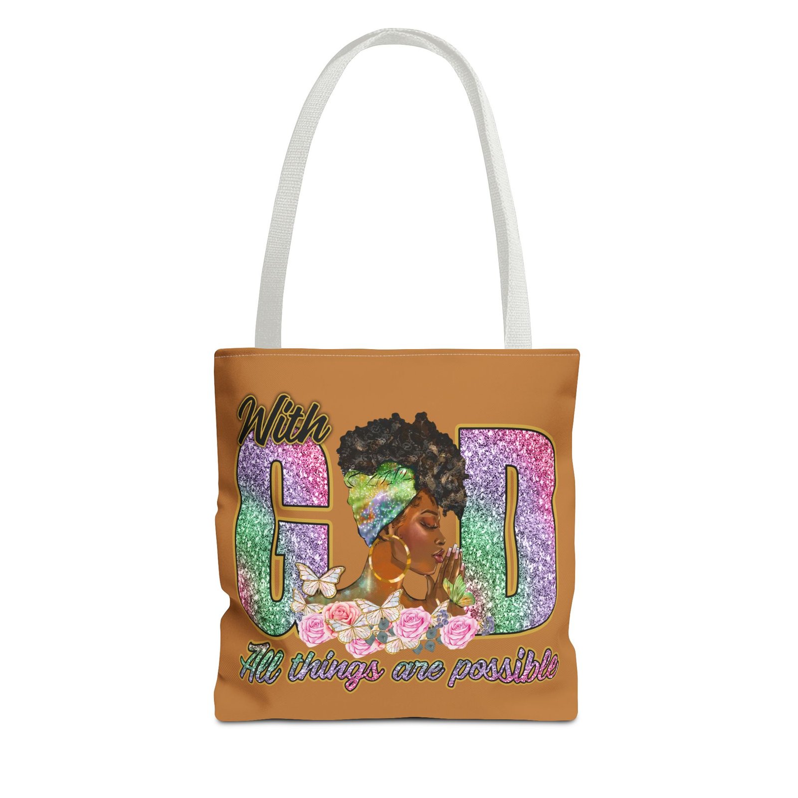 This bright, roomy tote brings bold confidence and quiet faith into every errand, meeting, or church gathering. The front panel features a vibrant portrait of a woman with a stylish headwrap woven into large, glitter-like letters that read ‘With God’ and a floral base that carries the uplifting line ‘All things are possible.’ The sunny background and contrasting black handles make the artwork pop while the boxed corners add structure and space for groceries, books, or a planner. Carry it over your shoulder and feel seen — it’s the kind of bag that holds your essentials and your quiet declarations of hope.